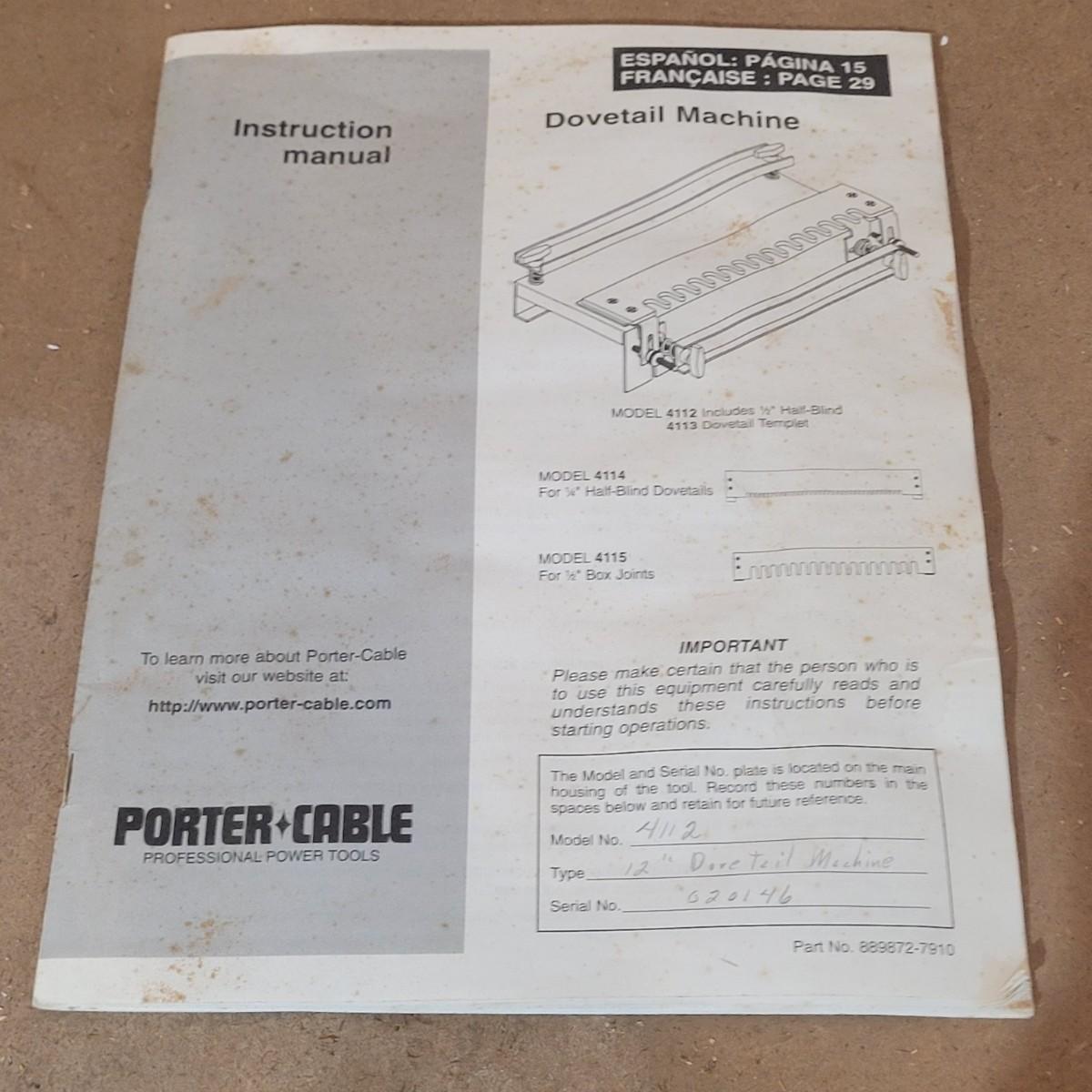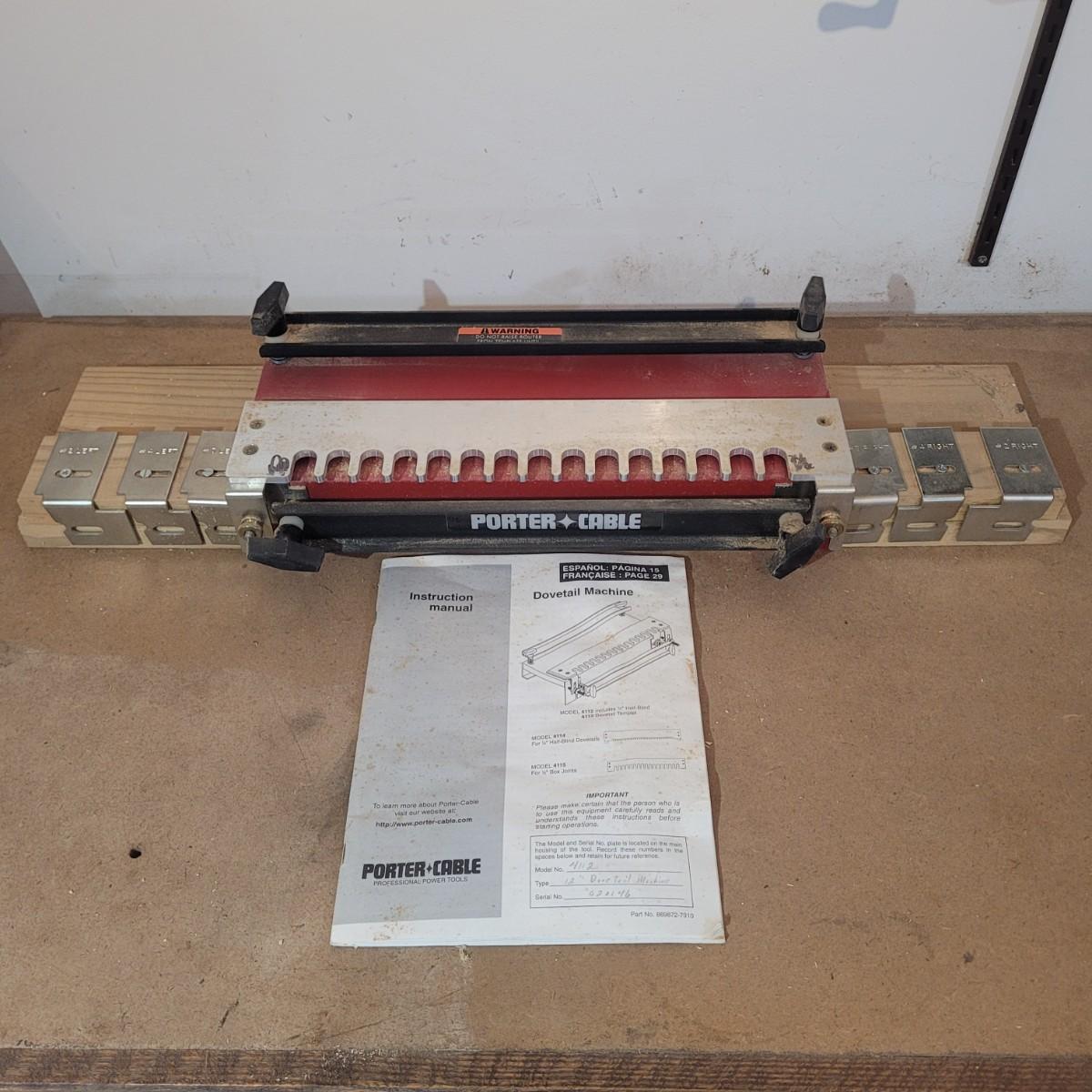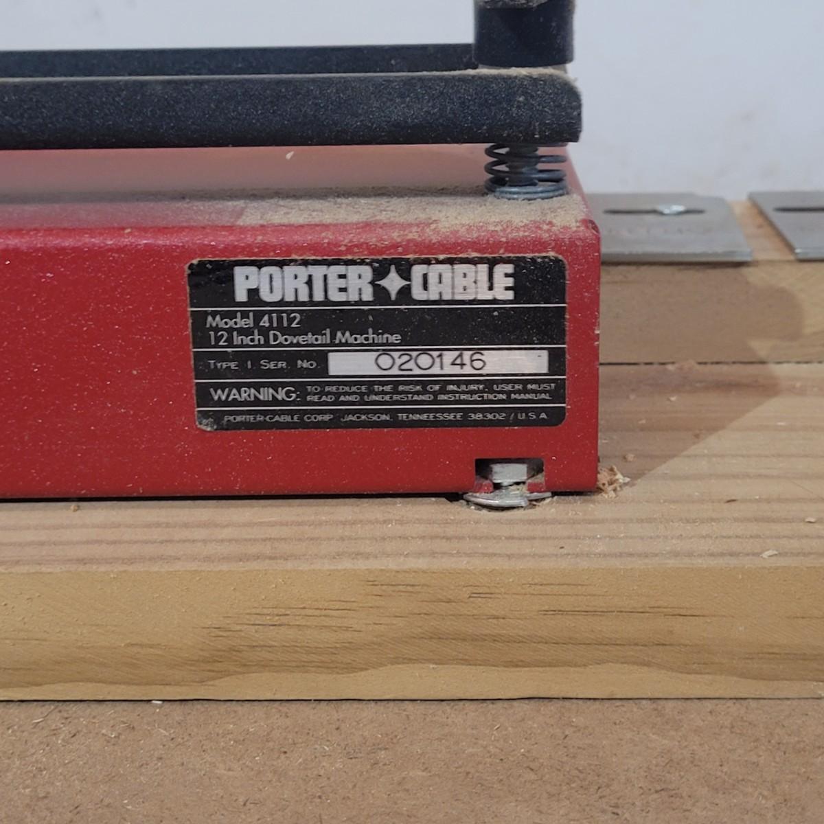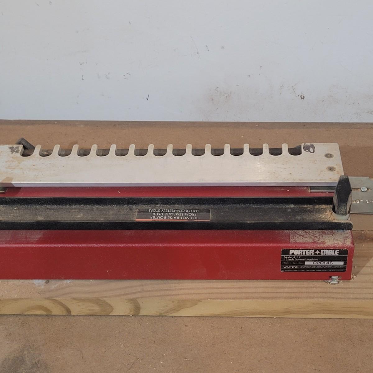 Porter Cable brand 12" dovetail machine. Item measures 30" x 9.5" x 6"H. Includes original instruction manual.