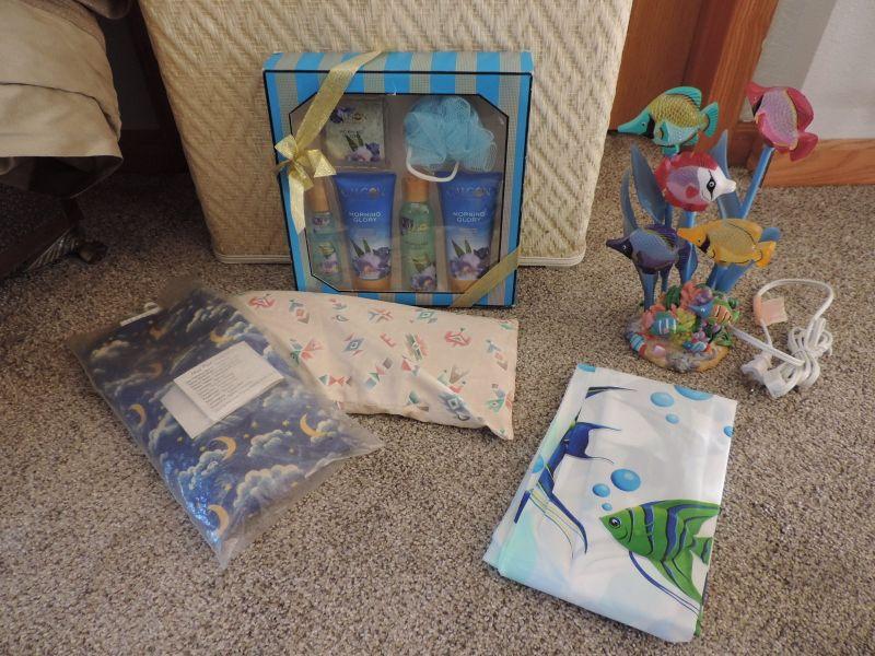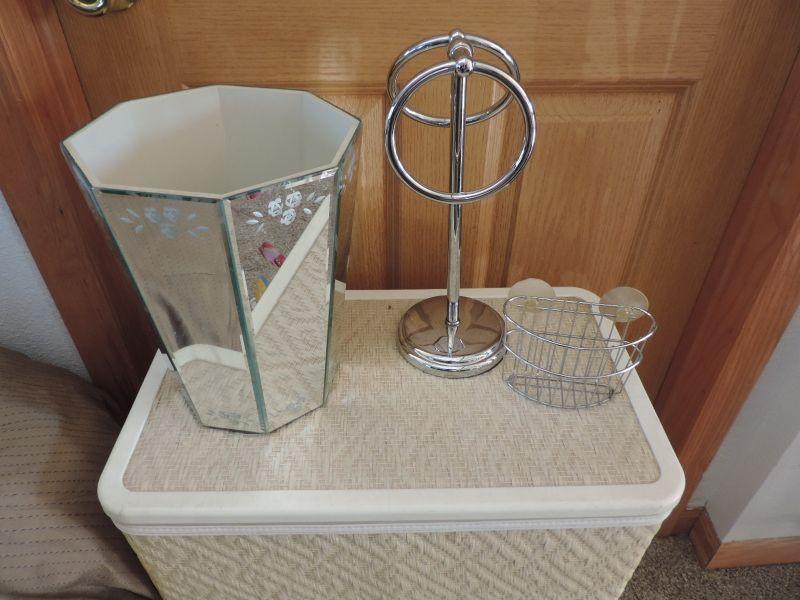 DBL. SIZE COMFORTER, MIRRORED TRASH CAN, TOWEL HOLDER, CALGON GIFT SET AND MORE