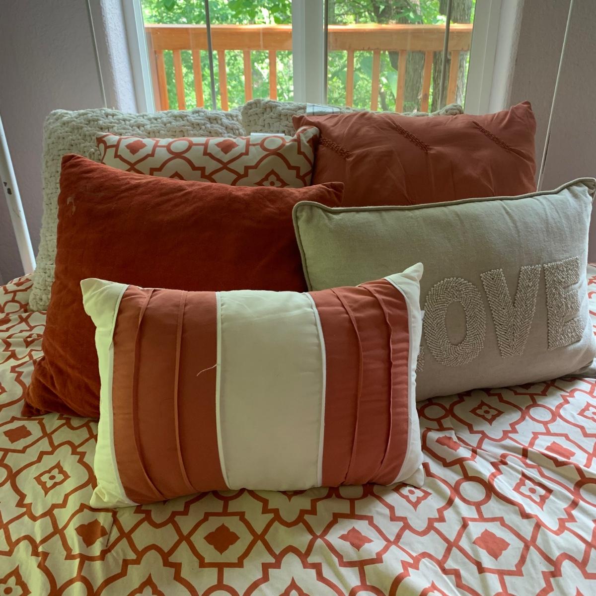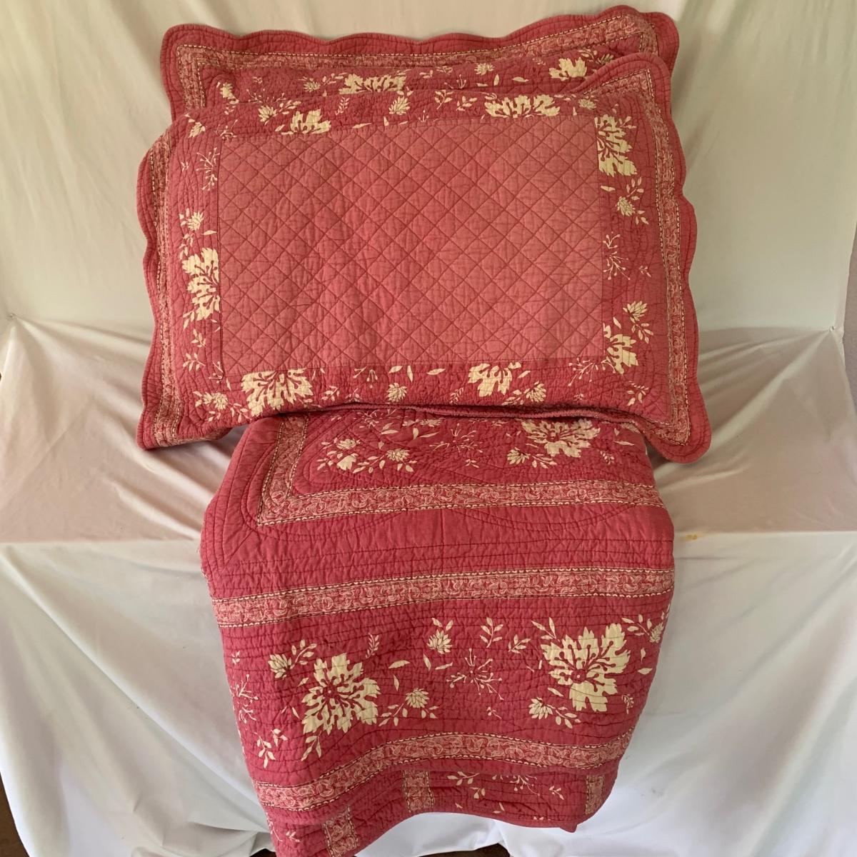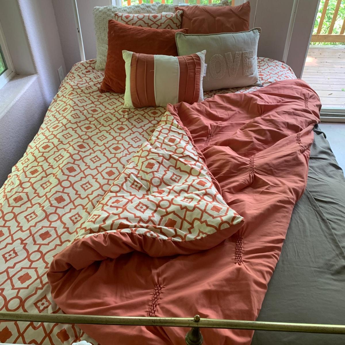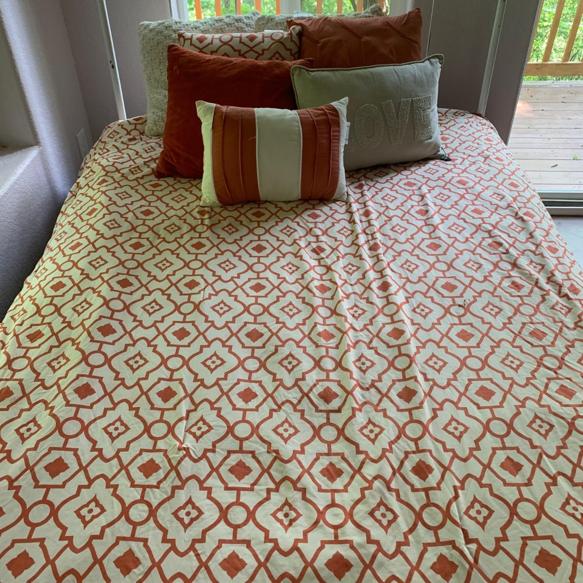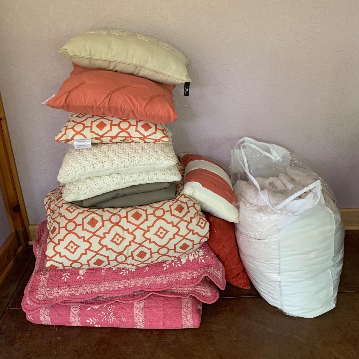 Lovely array of full-sized bed linens. This lot includes full-sized down comforter, two comforters with matching pillow shams, one set of full sheets, one additional pillow case, and seven throw pillows. Please note, the bed is for display purposes and is not included in this lot.