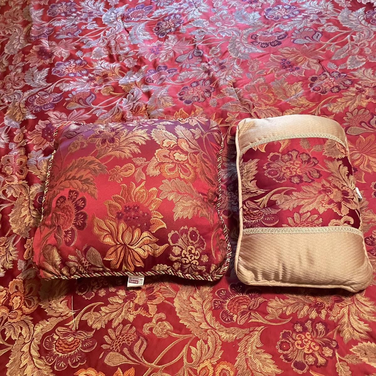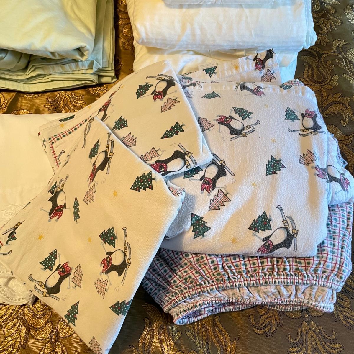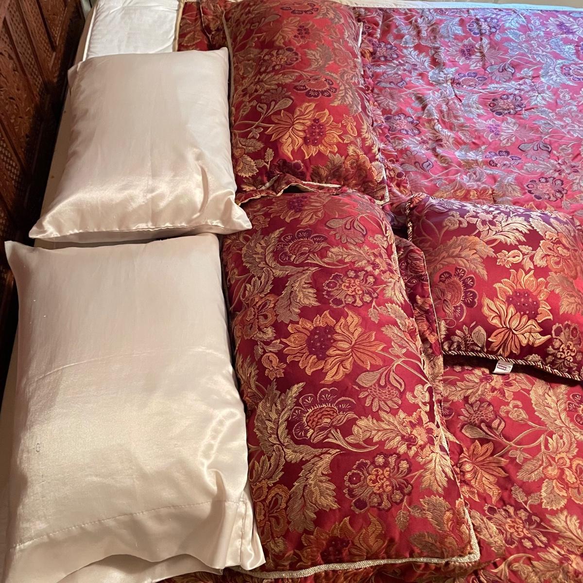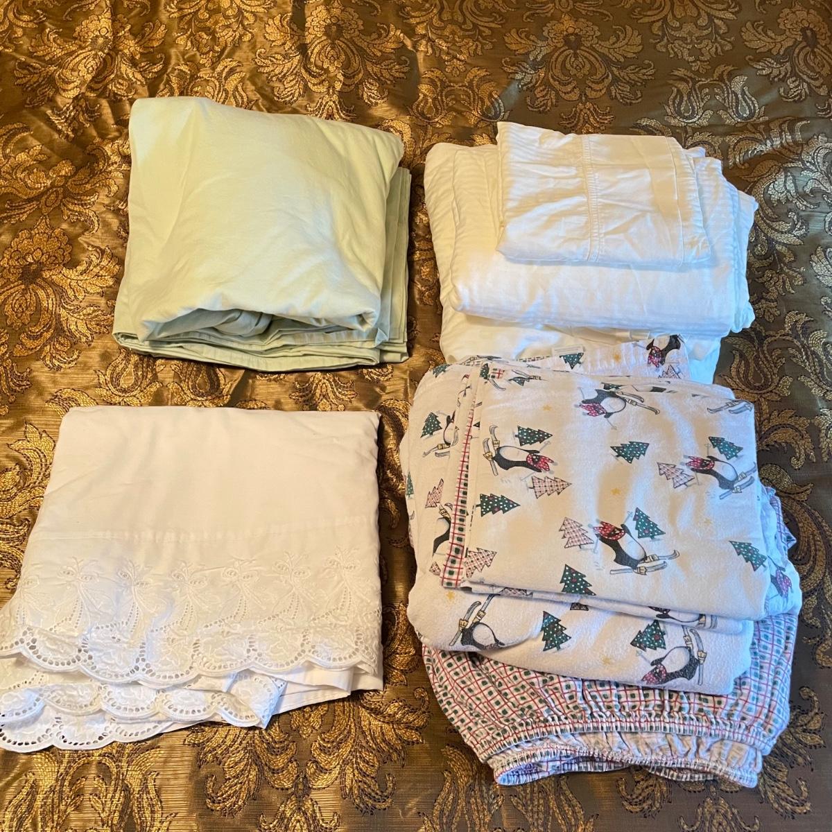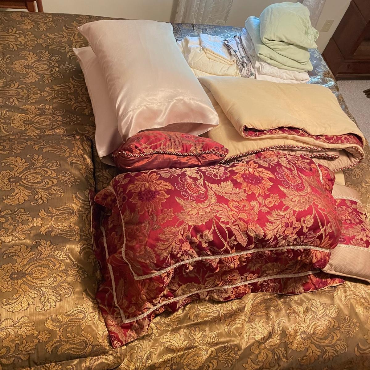 All king bedding lot includes two comforter sets, sheets and a down mattress topper. The Lenox set has two flat pillows sewn completely. The red floral Classic Home set has king pillowcases and two decorative pillows, plus to silky ivory colored standard pillow cases. Winning bidder is welcome to keep pillows, but not required to. Lot also features a light green sheet set with one pillowcase, a striped white sheet set with one pillowcase, a flannel winter themed set with two pillowcases and a top sheet with floral top border. See images. Lot fills three black trash bags, please keep this in mind for pick-up. Local pick up only.