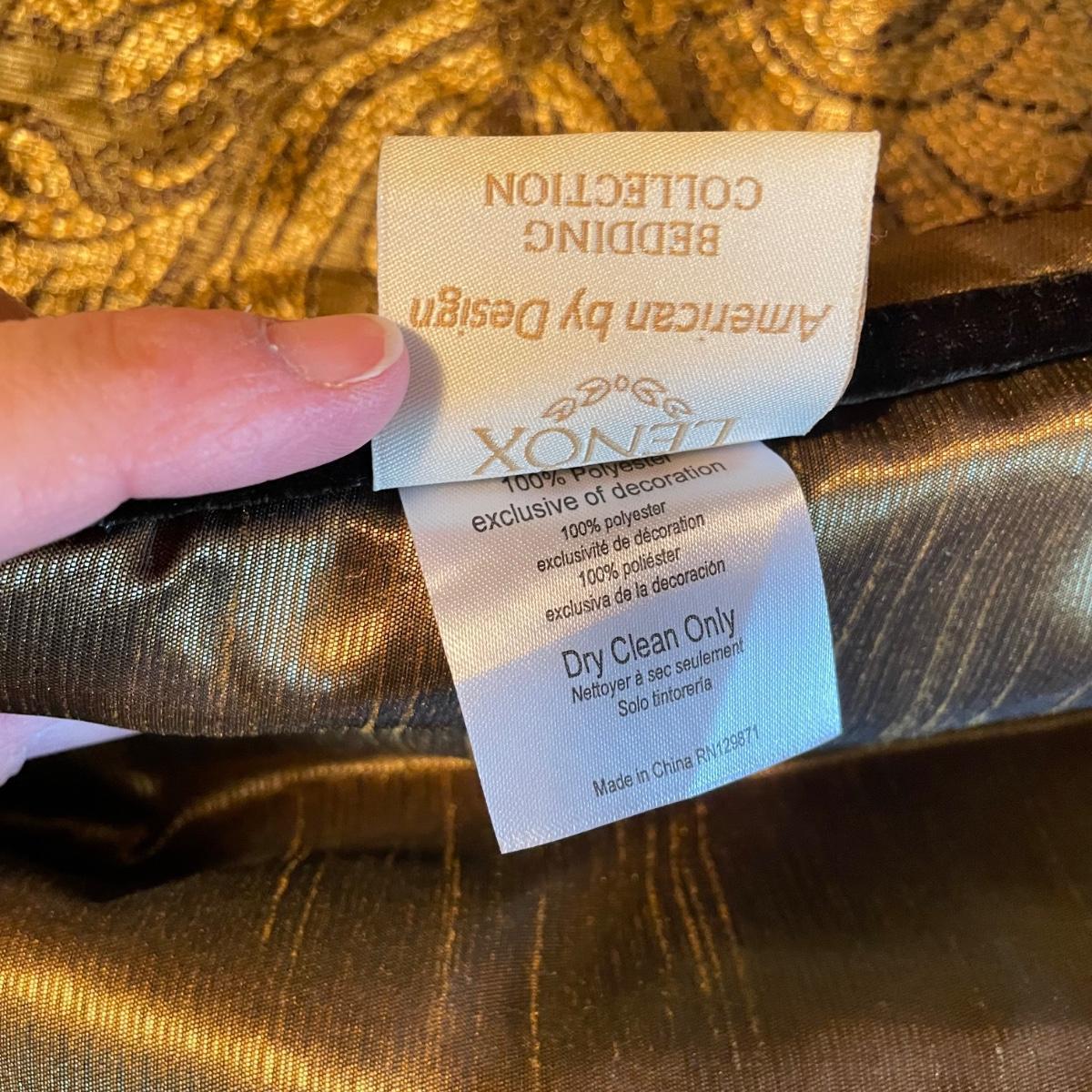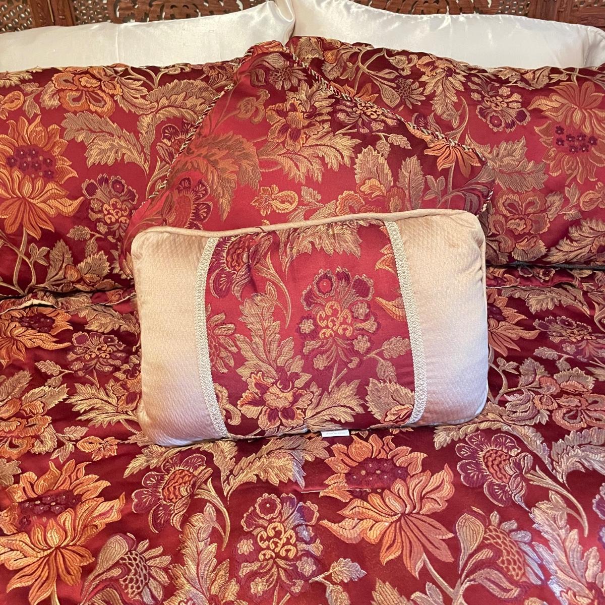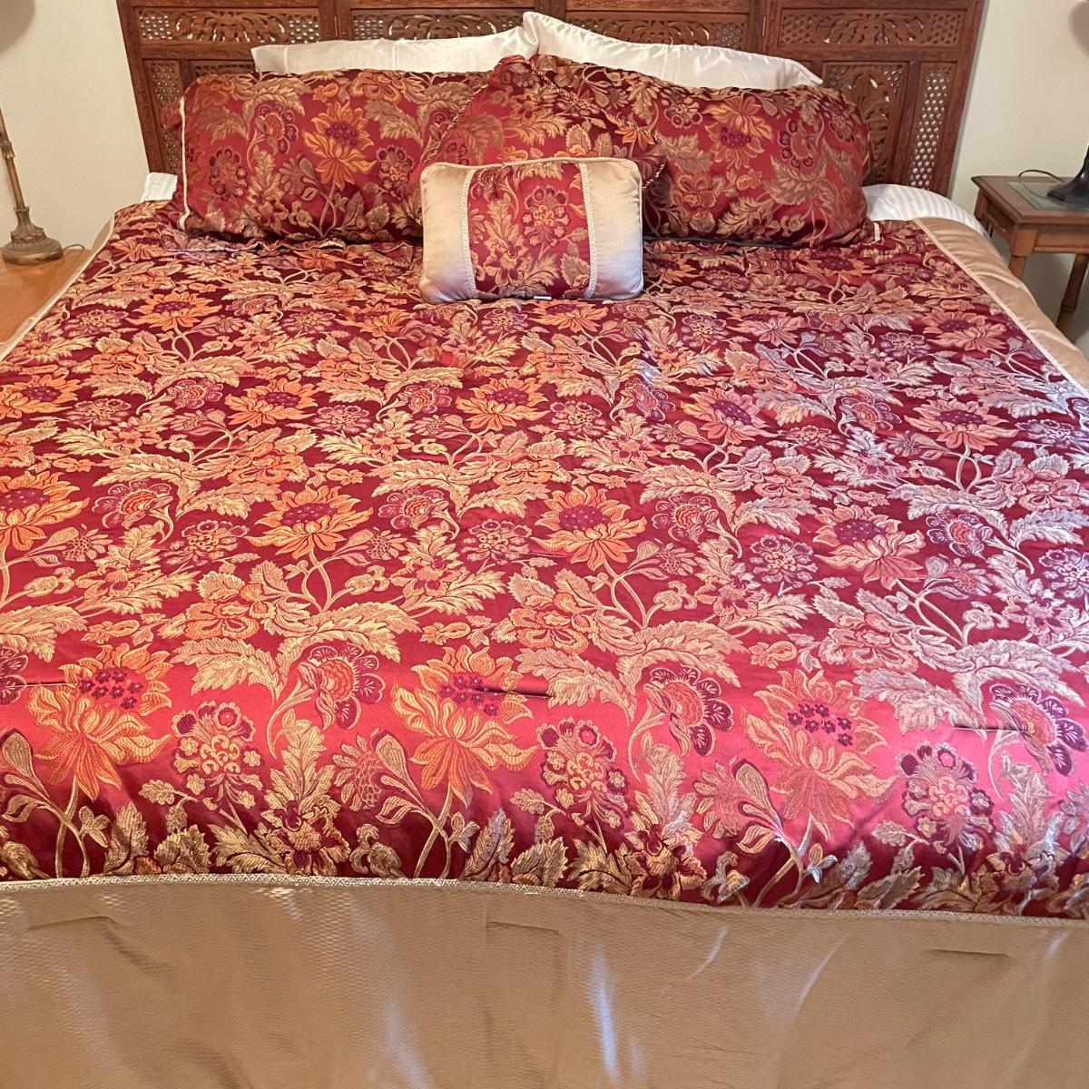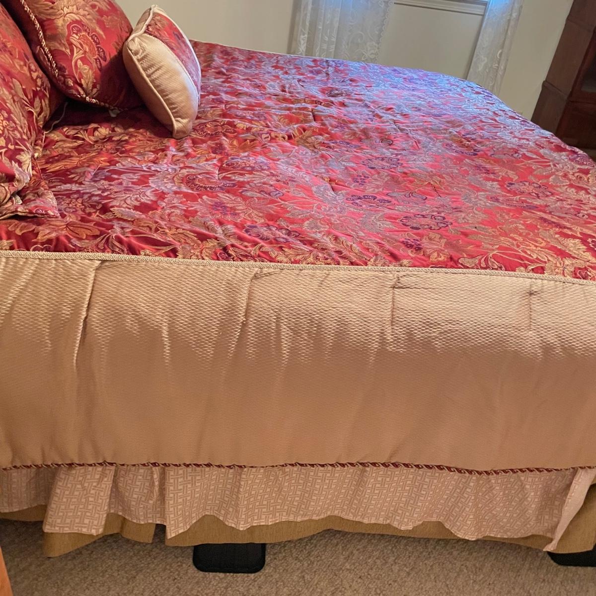 All king bedding lot includes two comforter sets, sheets and a down mattress topper. The Lenox set has two flat pillows sewn completely. The red floral Classic Home set has king pillowcases and two decorative pillows, plus to silky ivory colored standard pillow cases. Winning bidder is welcome to keep pillows, but not required to. Lot also features a light green sheet set with one pillowcase, a striped white sheet set with one pillowcase, a flannel winter themed set with two pillowcases and a top sheet with floral top border. See images. Lot fills three black trash bags, please keep this in mind for pick-up. Local pick up only.