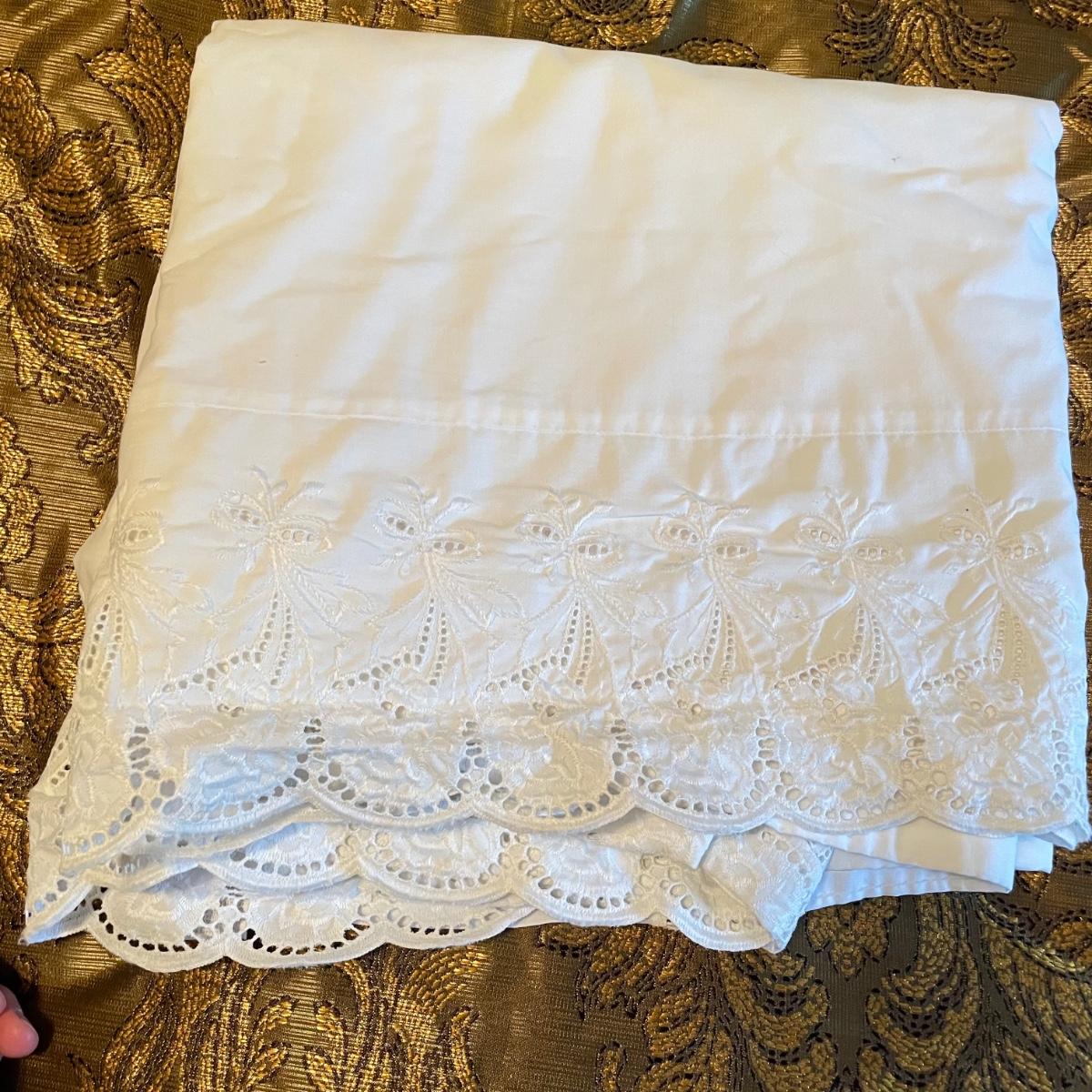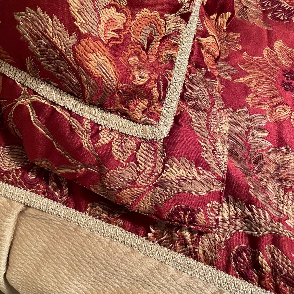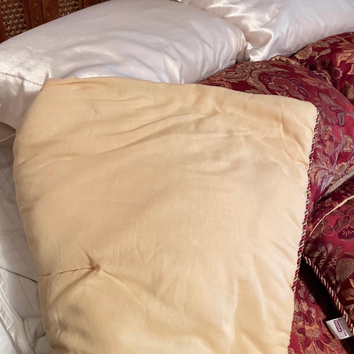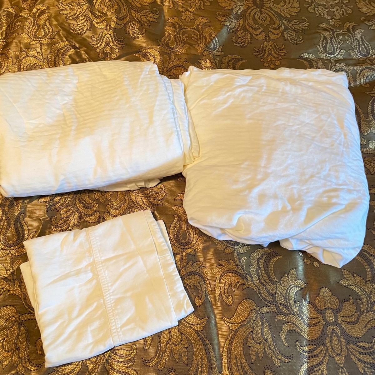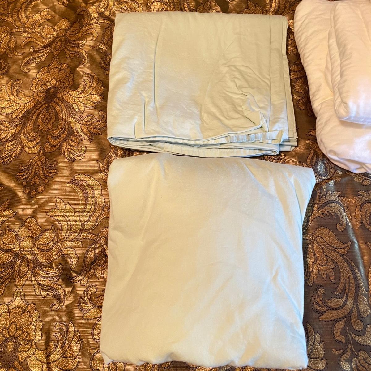 All king bedding lot includes two comforter sets, sheets and a down mattress topper. The Lenox set has two flat pillows sewn completely. The red floral Classic Home set has king pillowcases and two decorative pillows, plus to silky ivory colored standard pillow cases. Winning bidder is welcome to keep pillows, but not required to. Lot also features a light green sheet set with one pillowcase, a striped white sheet set with one pillowcase, a flannel winter themed set with two pillowcases and a top sheet with floral top border. See images. Lot fills three black trash bags, please keep this in mind for pick-up. Local pick up only.