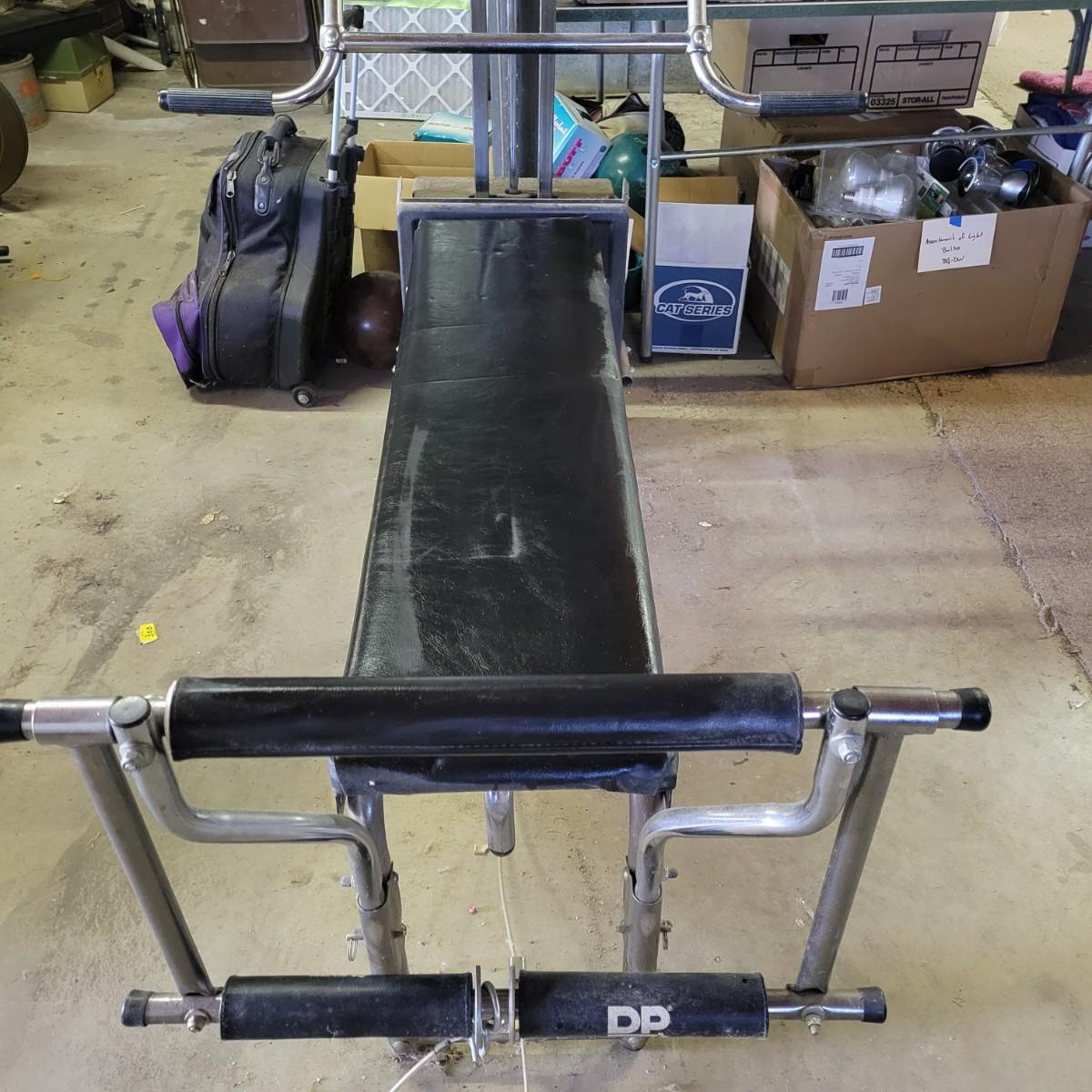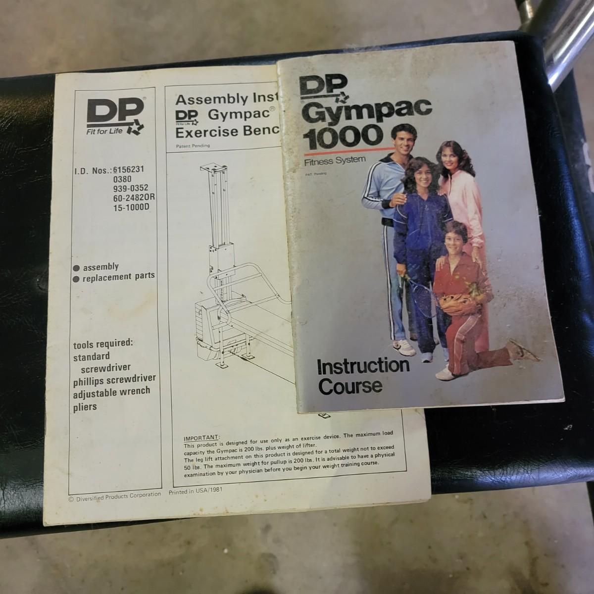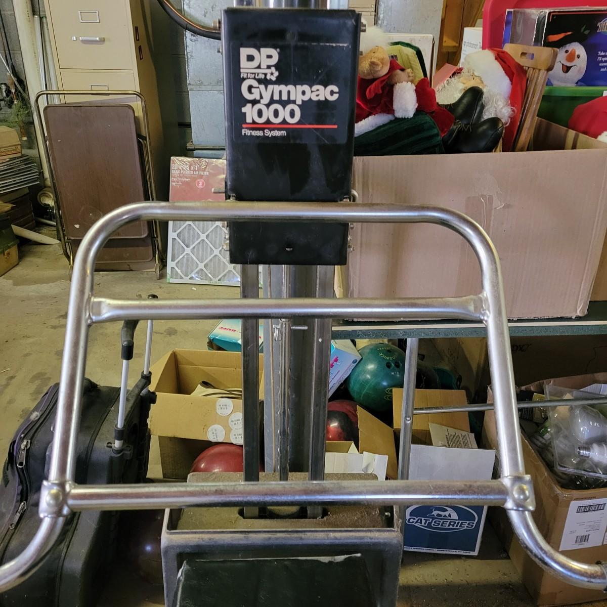 A DP Gympac 1000 fitness system that works as it should, but likely needs some adjustments. This fitness system has eight weight plates that are 11lbs each. This system will allow for a wide range of exercise options from upper to lower body. It also includes a number of accessories. Measures approximately 37" x 61" x 84.5"H. Winning bidder will need to bring a cresent wrench to remove two bolts securing it to a metal pole. Local pickup only. Winning bidder must bring assistance to help move and load this item due to its weight and/or size.