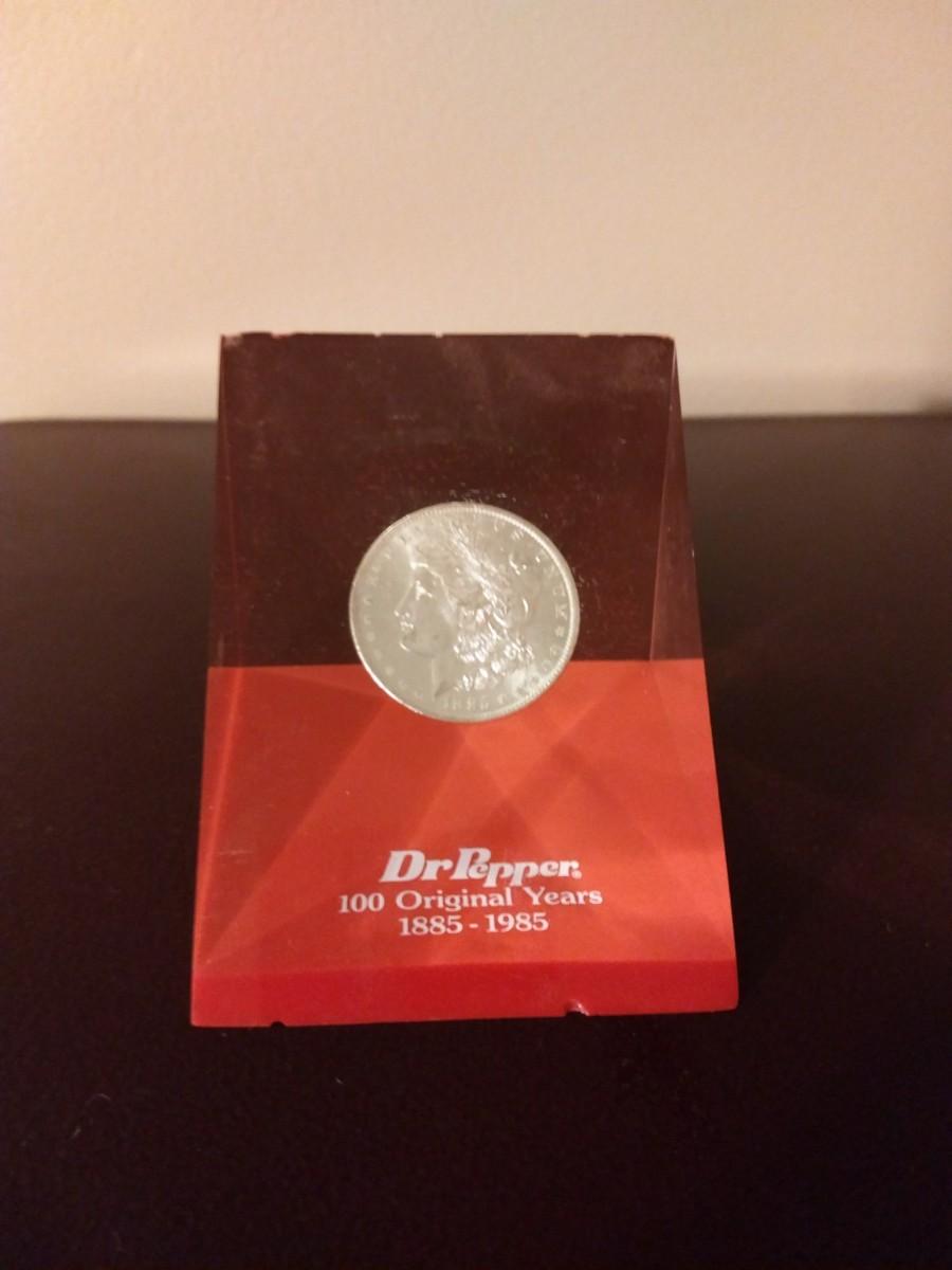 Dr. Pepper 100 Year Original Years Silver Morgan Dollar 1885 O in Lucite Choice 4 of 4 some chipping along edge of lucite