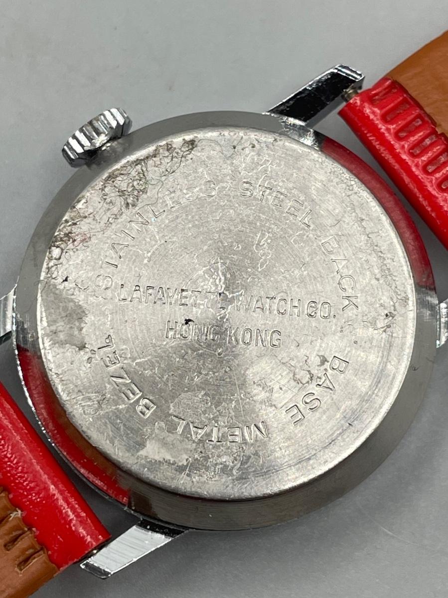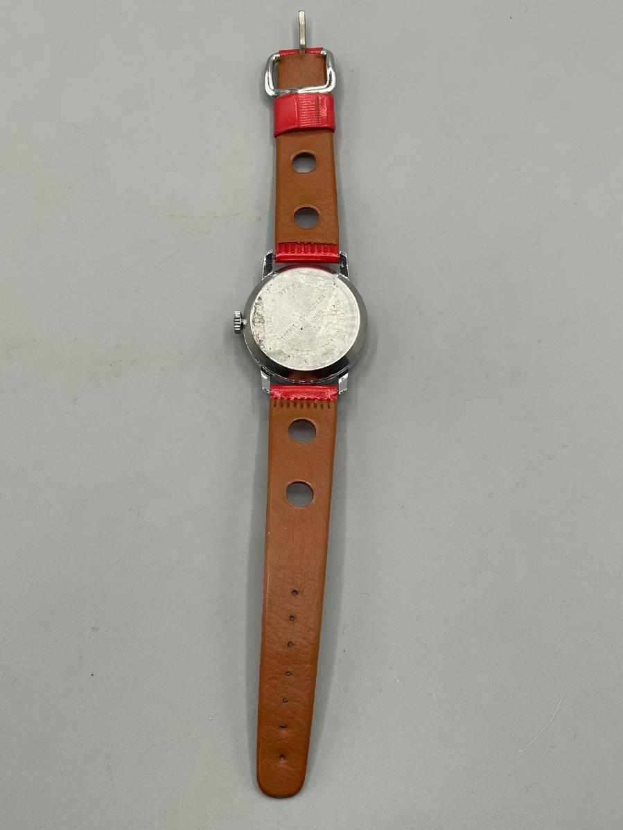 This item is in good condition, and it does work. Red wrist band, it seems to fit a child’s arm or an adult with a smaller wrist. The back of the watch is a little dusty due to years of ownership.