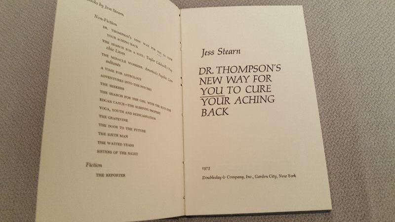 This auction lot is for a nice, clean copy of the out-of-print book: Dr. Thompson's New Way for You to Cure Your Aching Back. Authored by Jess Stearn. The book written in 1973 is often sought by folks looking for aching back remedies. This 205 page, hardbound book doesn't have its dust cover but all the information is still in those crisp pages. Donated by Kay Whitlock.