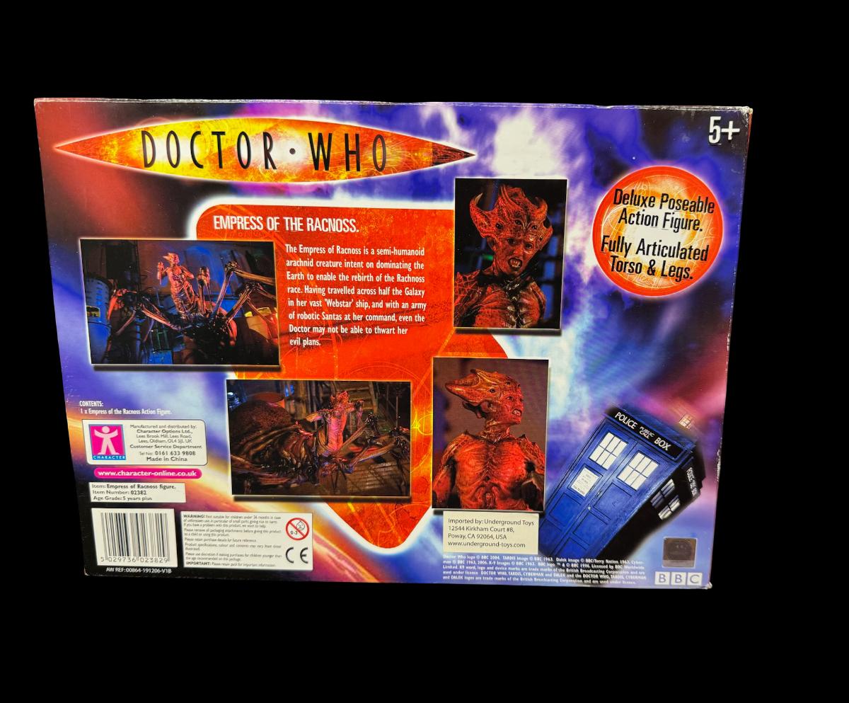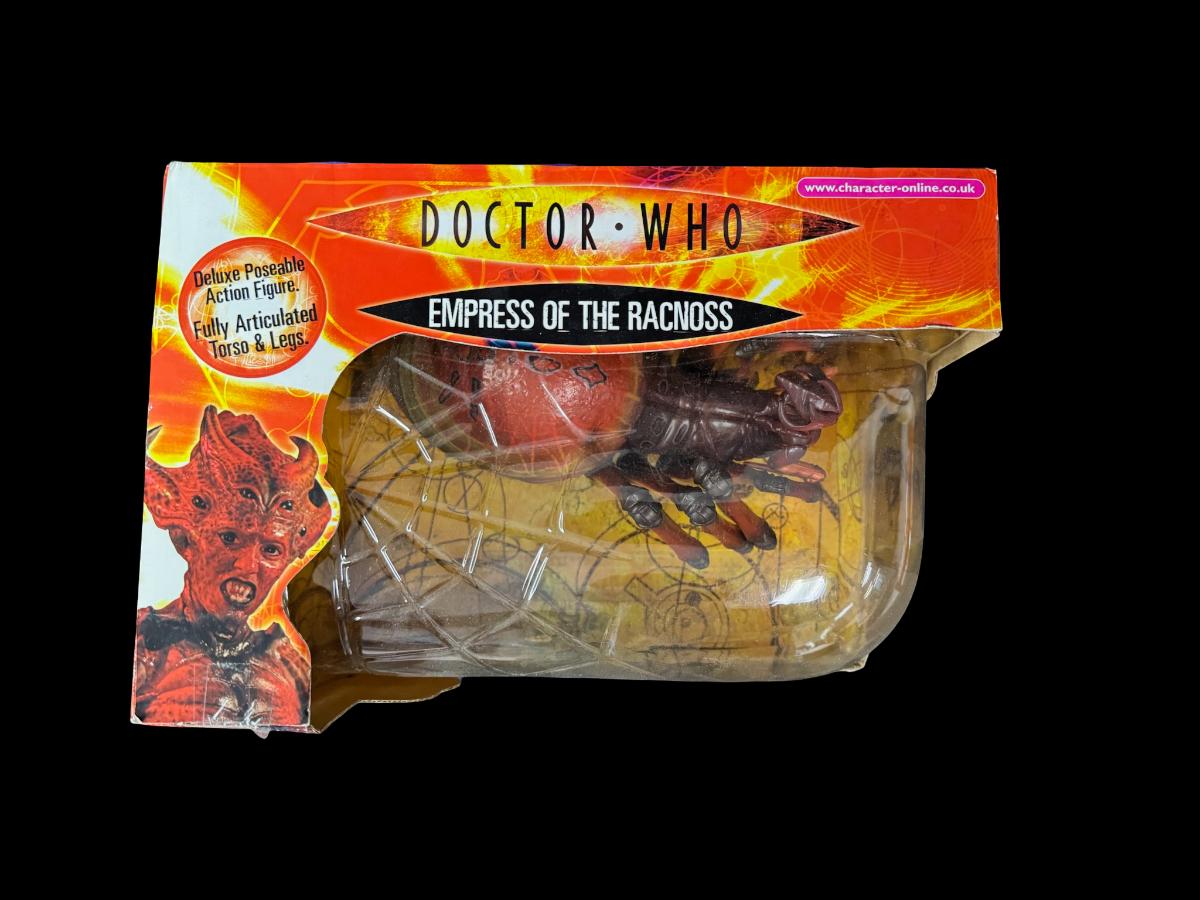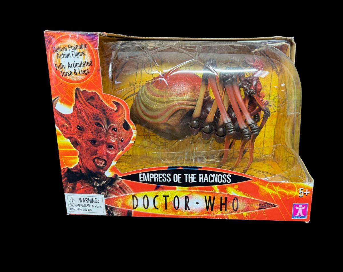 Empress of the Racnoss is a semi-humanoid arachnid creature. This deluxe action figure is fully poseable. It is in the original box, which has some storage related wear. Pre-auction estimate: $75-$100.