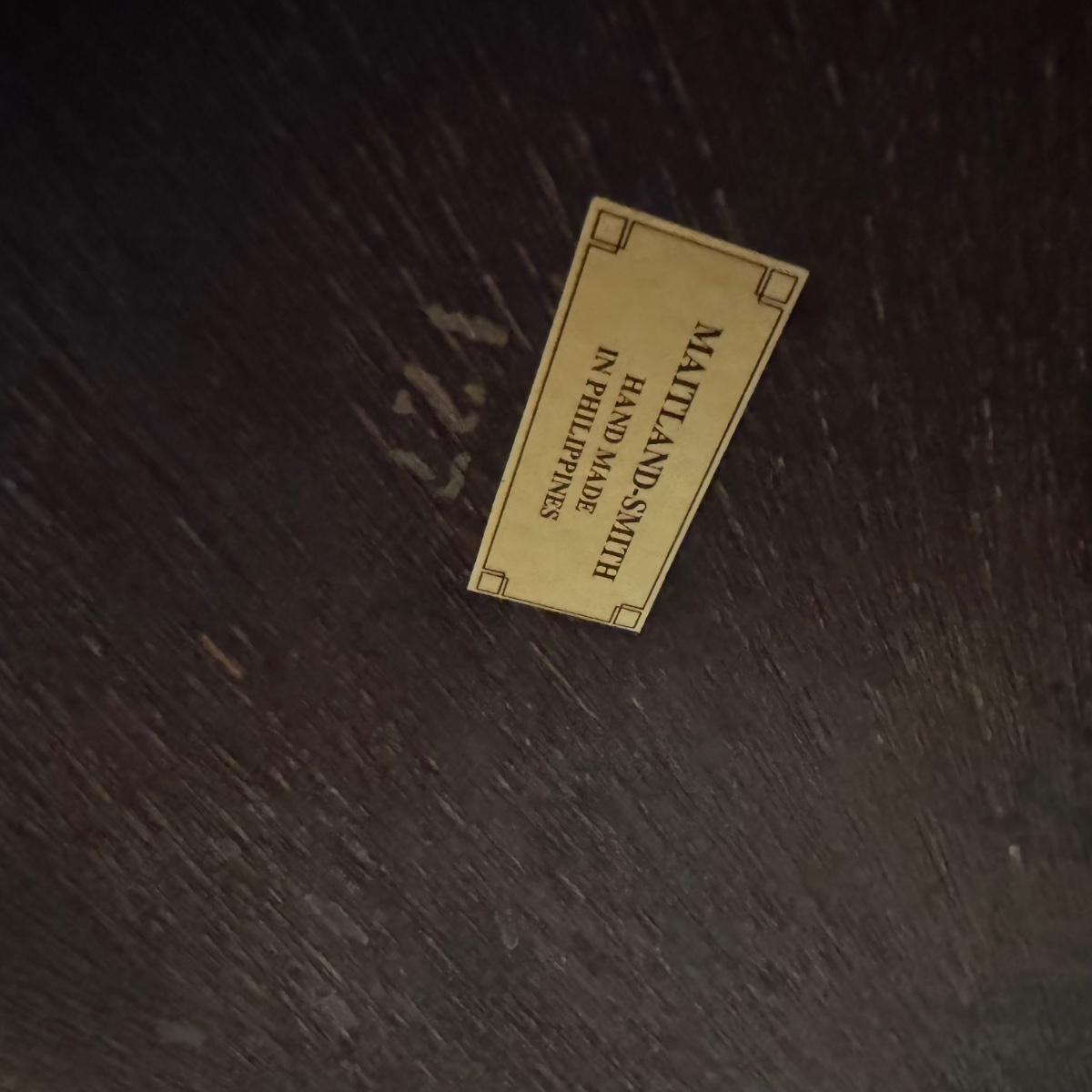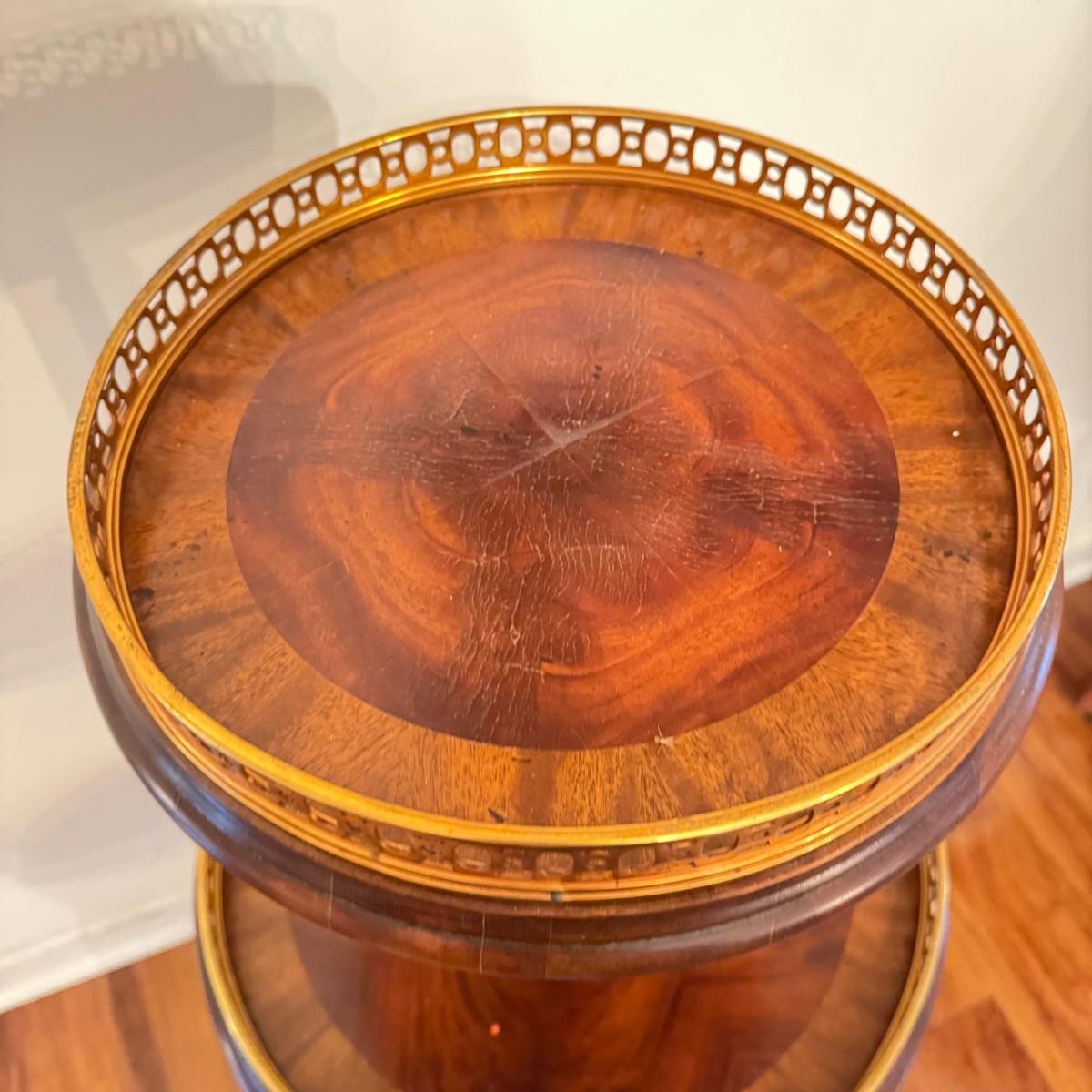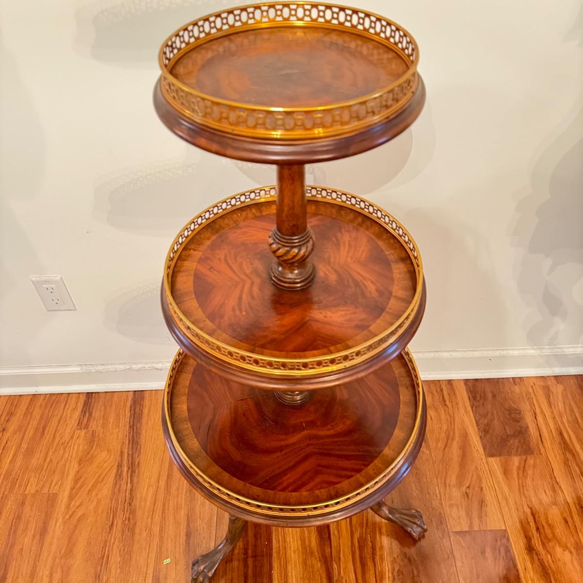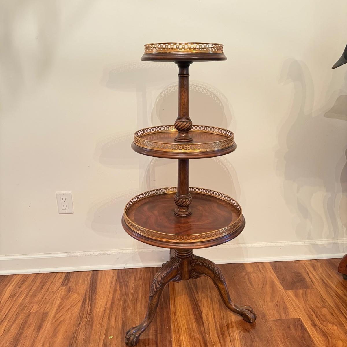 DR005 Maitland Smith Crotch Mahogany Three Tier Table with Brass Gallery Edge