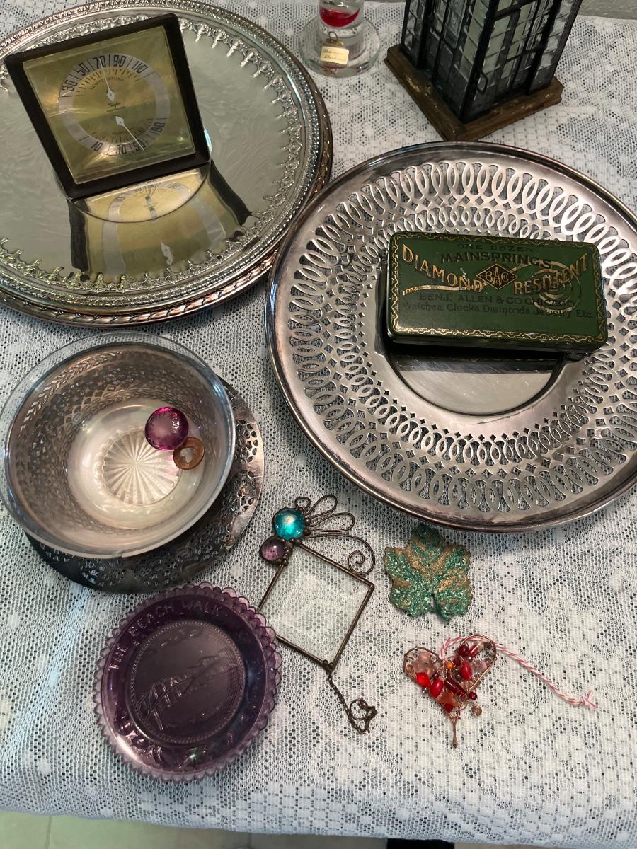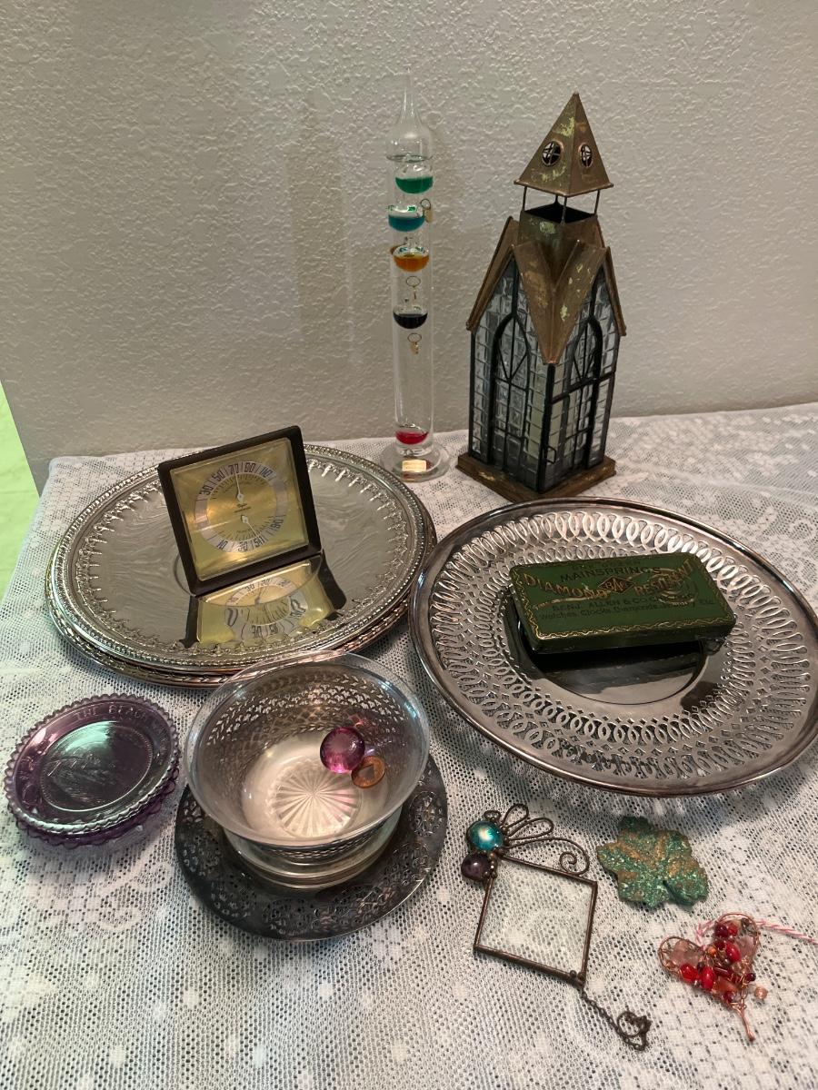 DR11- Thuringer Glaskunst thermometer, metal/glass church, silver trays, etc