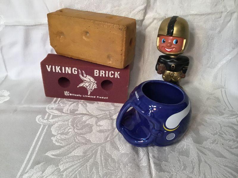 Vintage Vikings and Packers "bricks", Vikings mug and plastic bobblehead