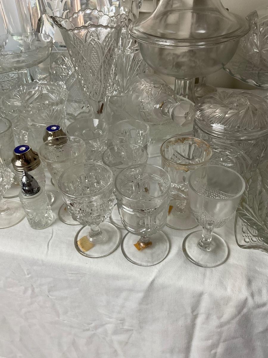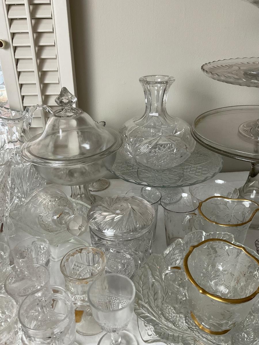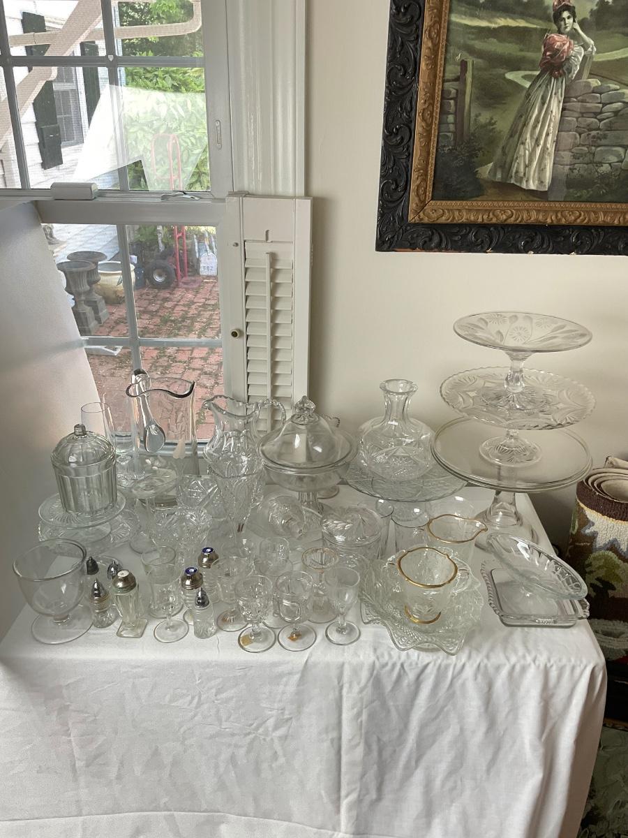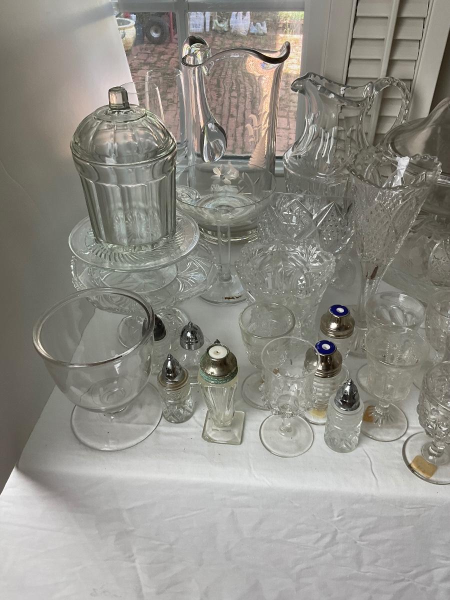 various bowls, cake stands, s+p shakers, creamers, snack bowls, cups, vases.