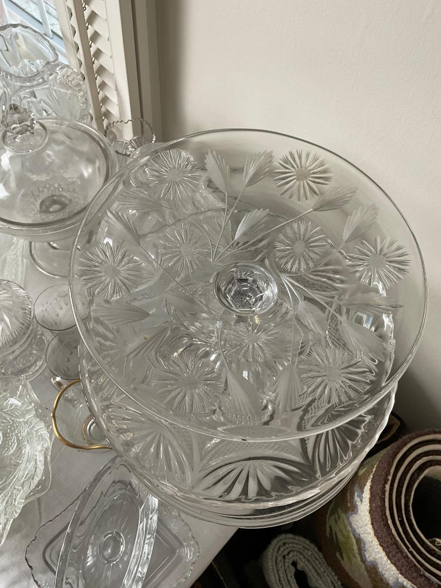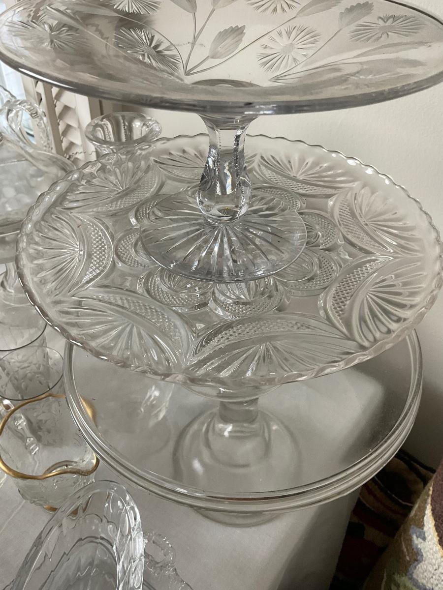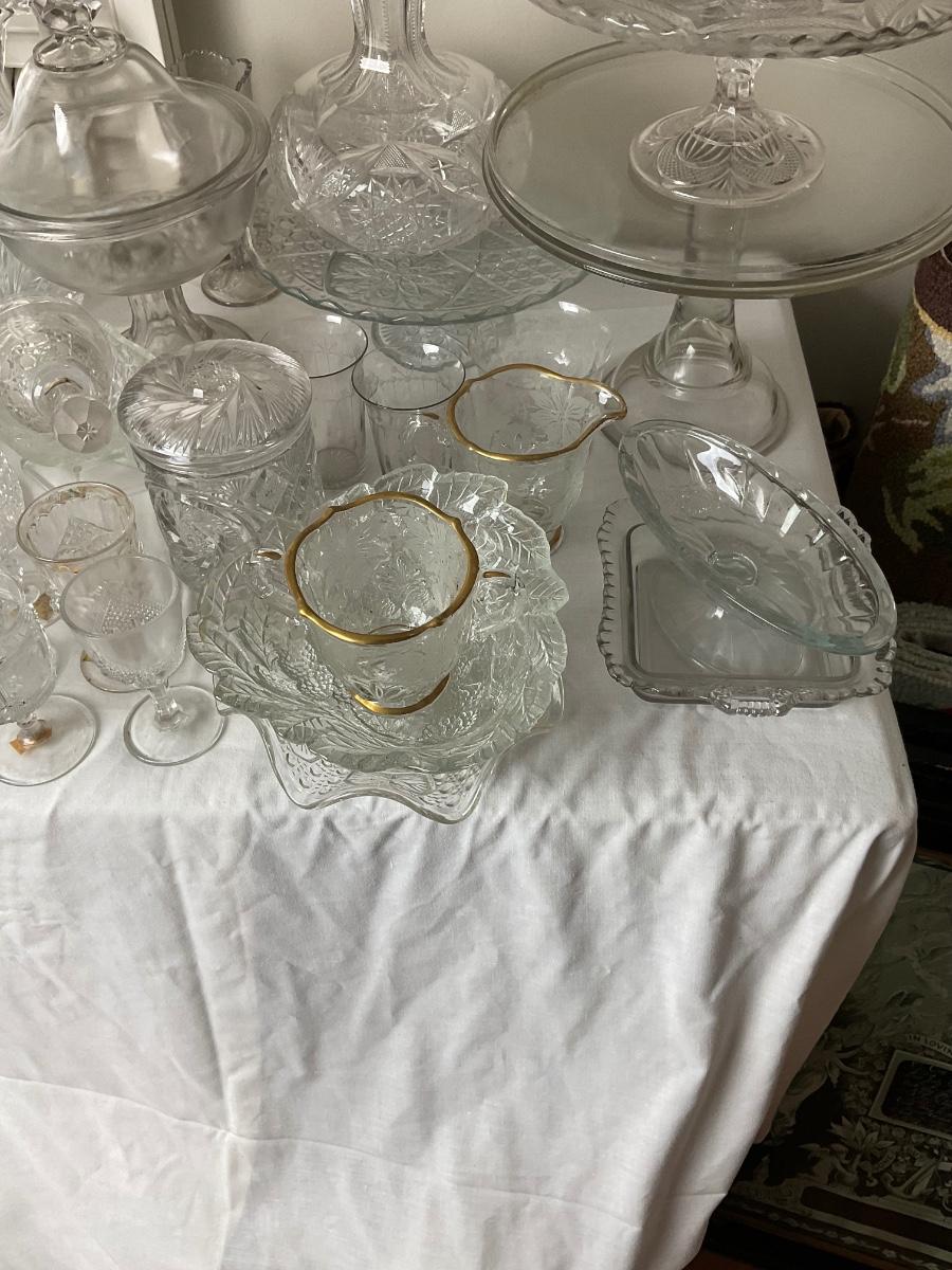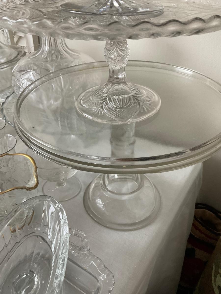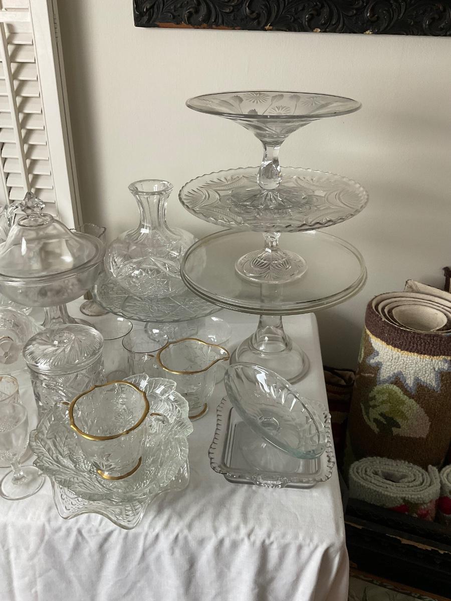 various bowls, cake stands, s+p shakers, creamers, snack bowls, cups, vases.