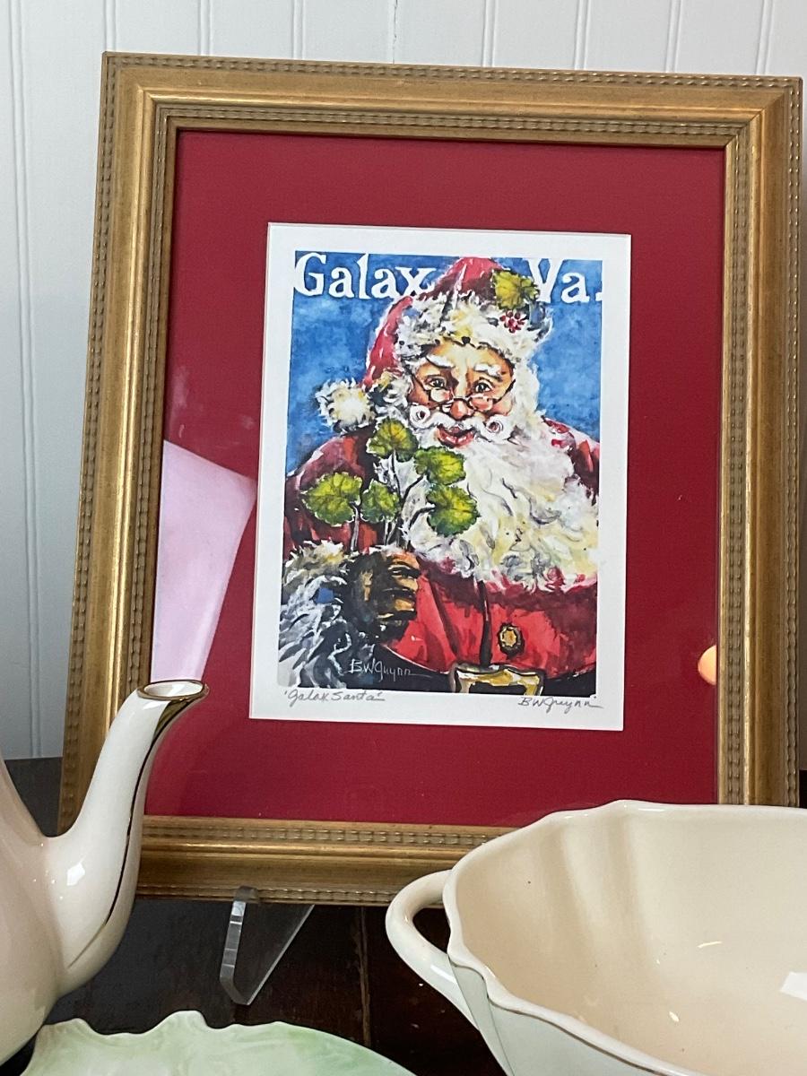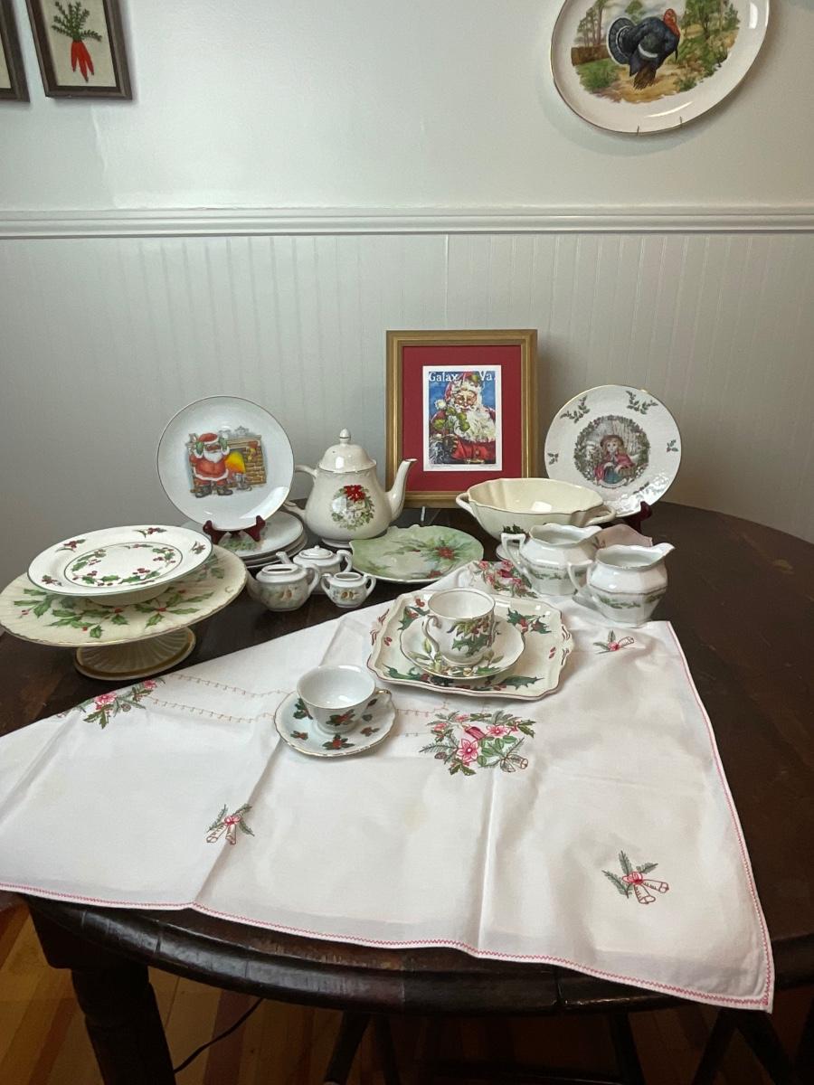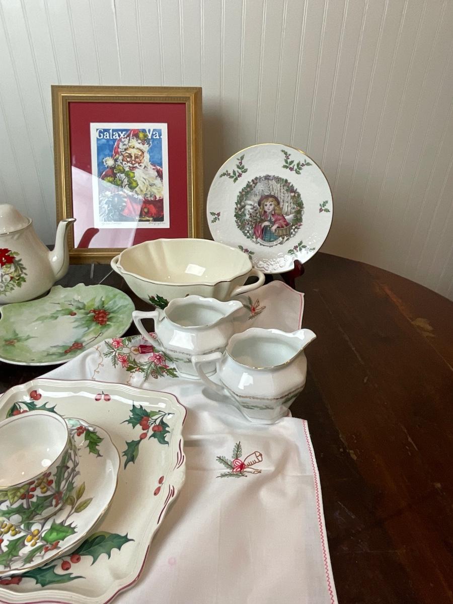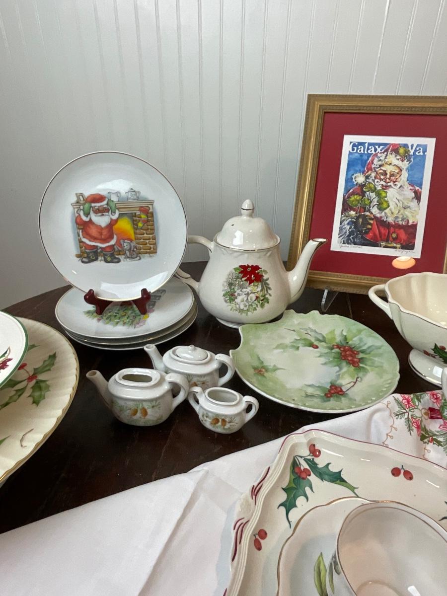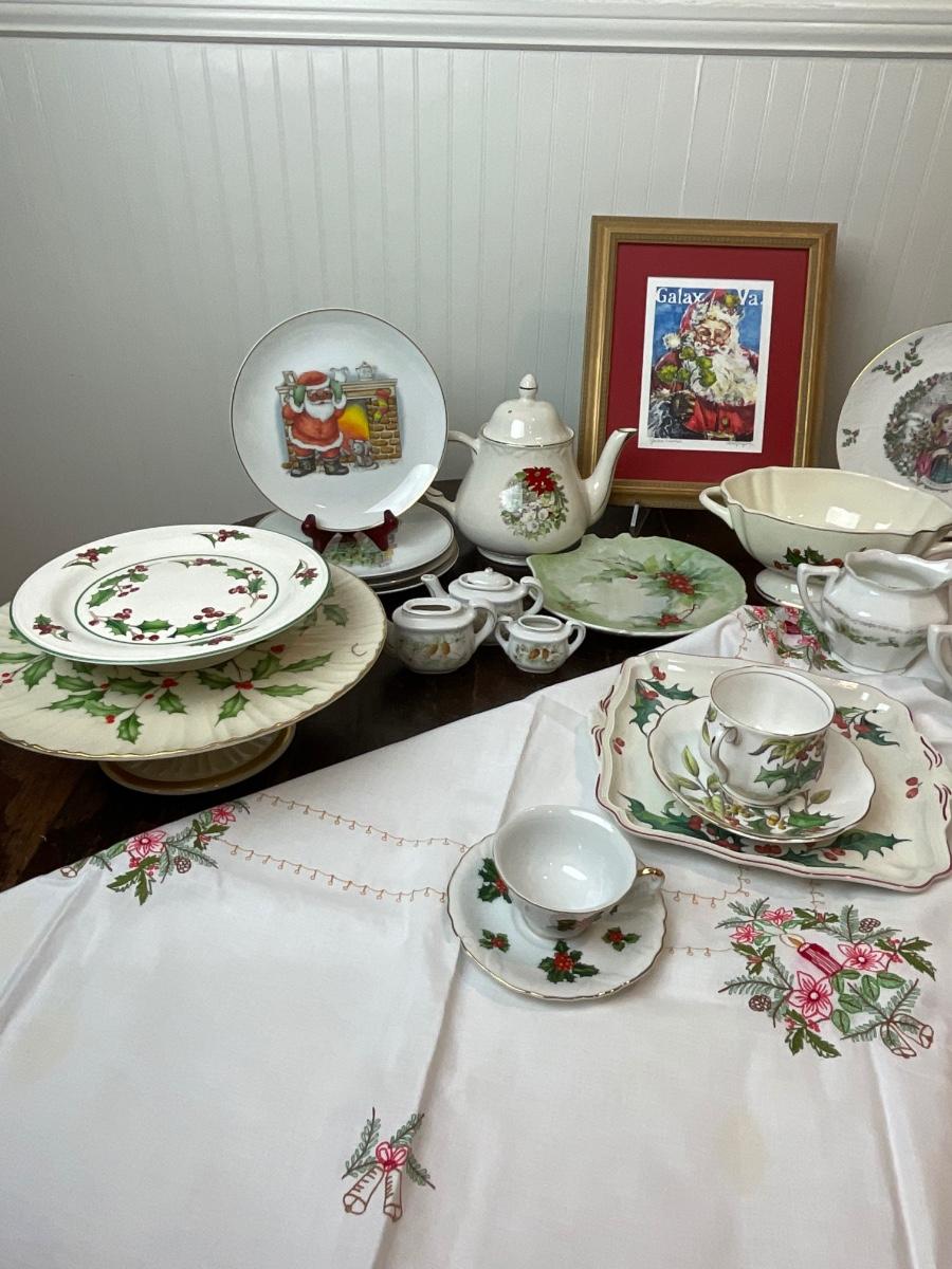 framed Santa, cake plate, sugar & creamer, tea pot, tea cups, plates, table cloth