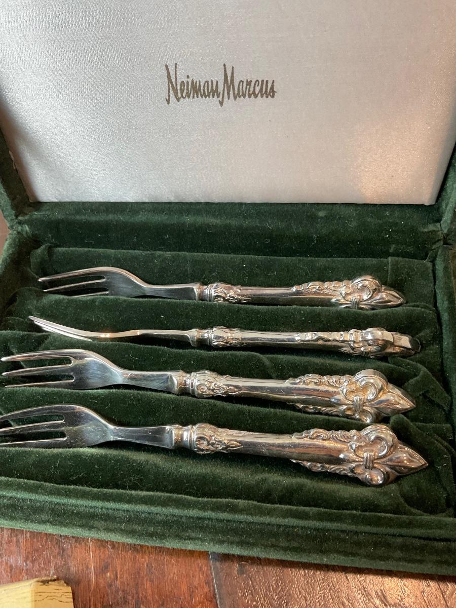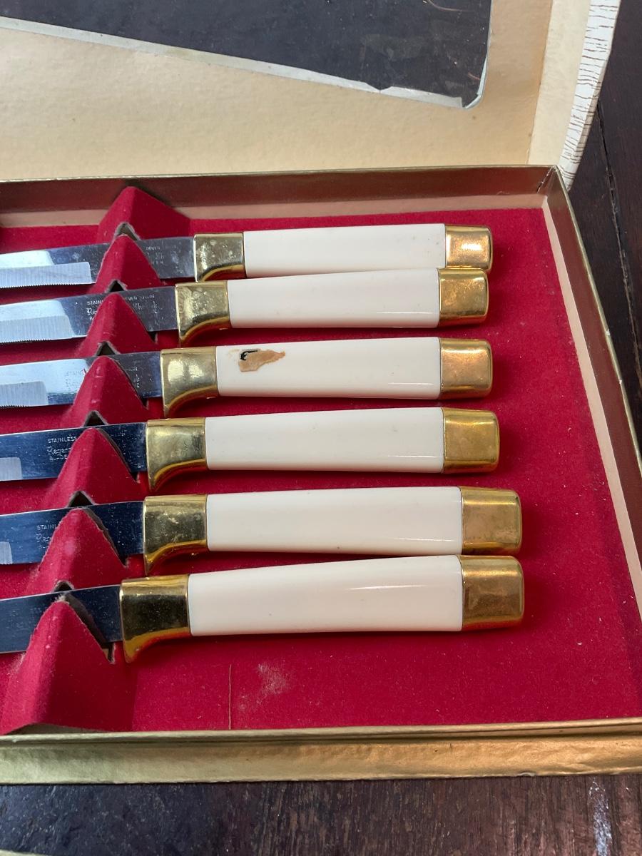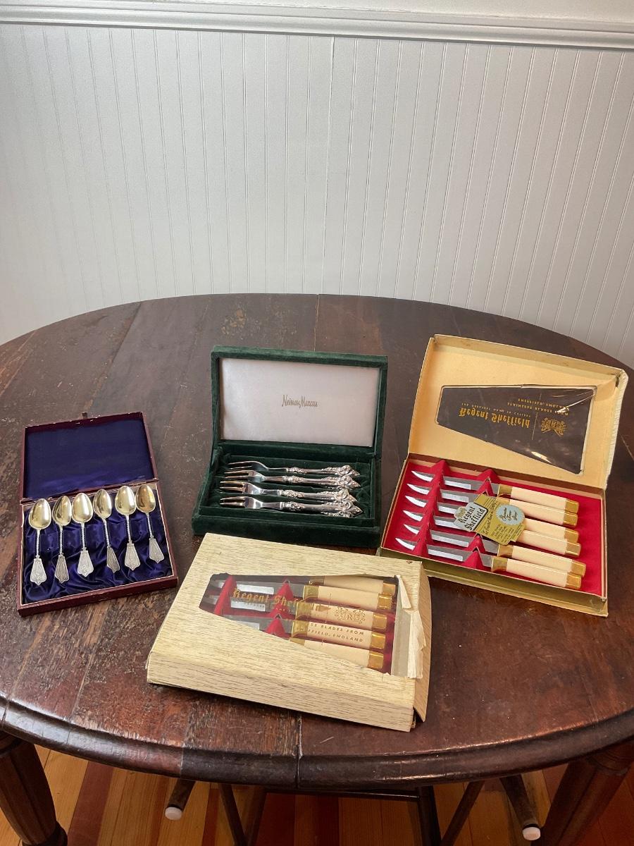 Regent Sheffield knives in box, small spoons, cocktail forks