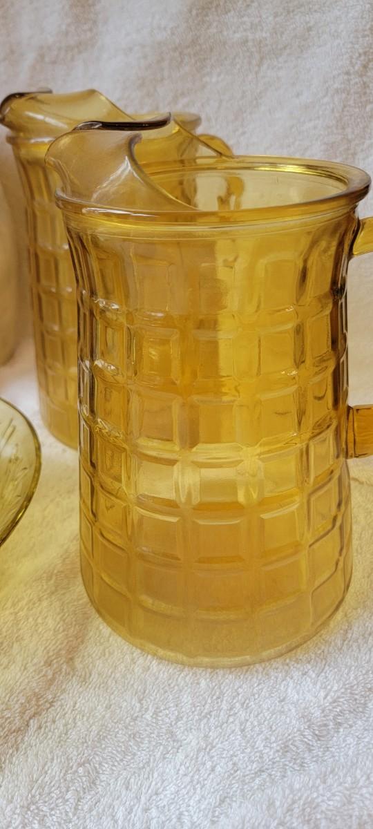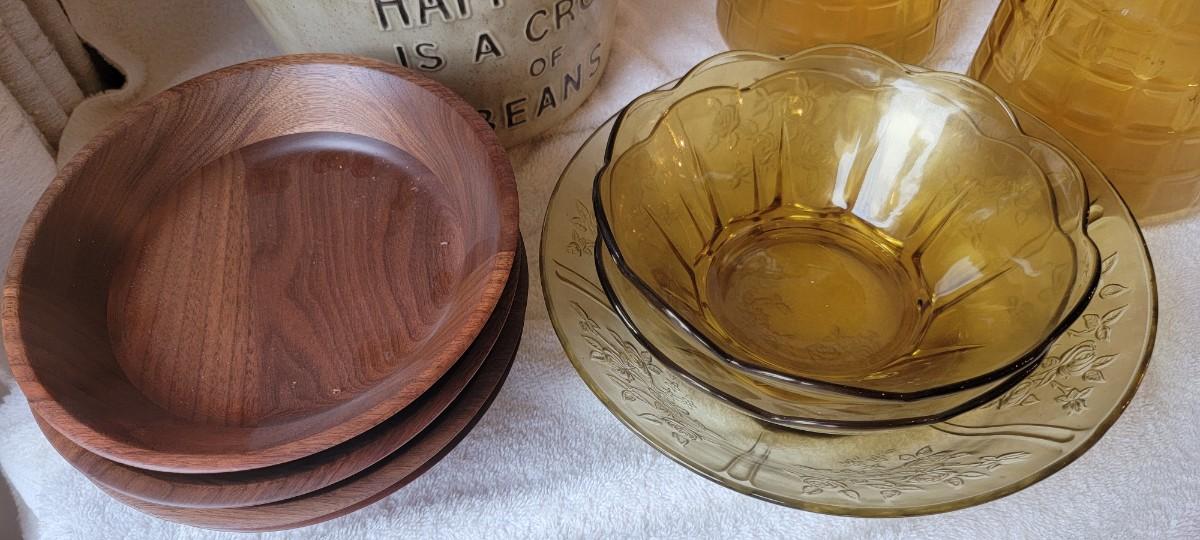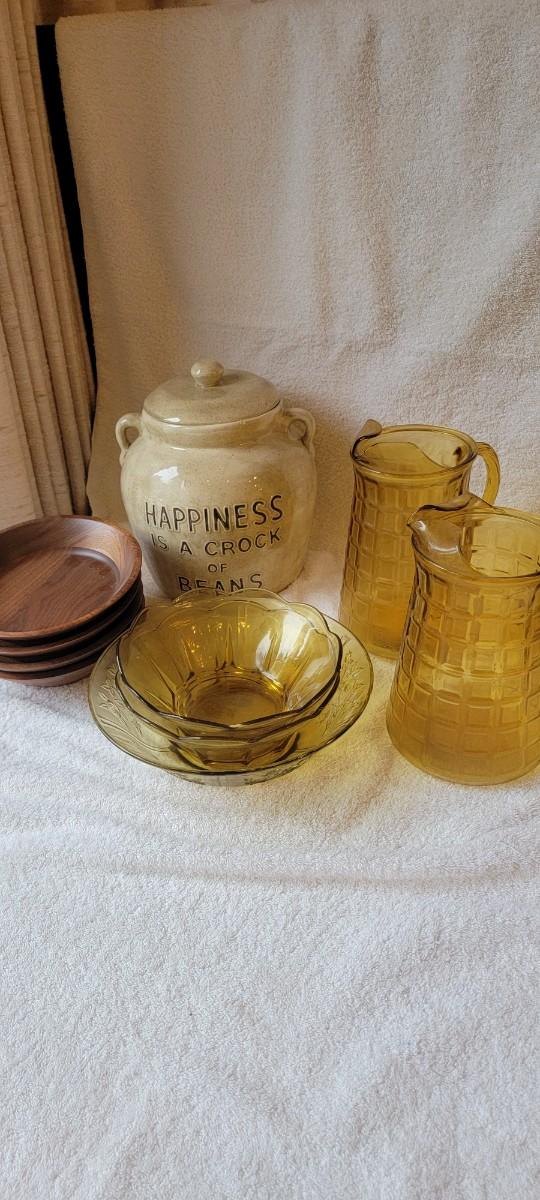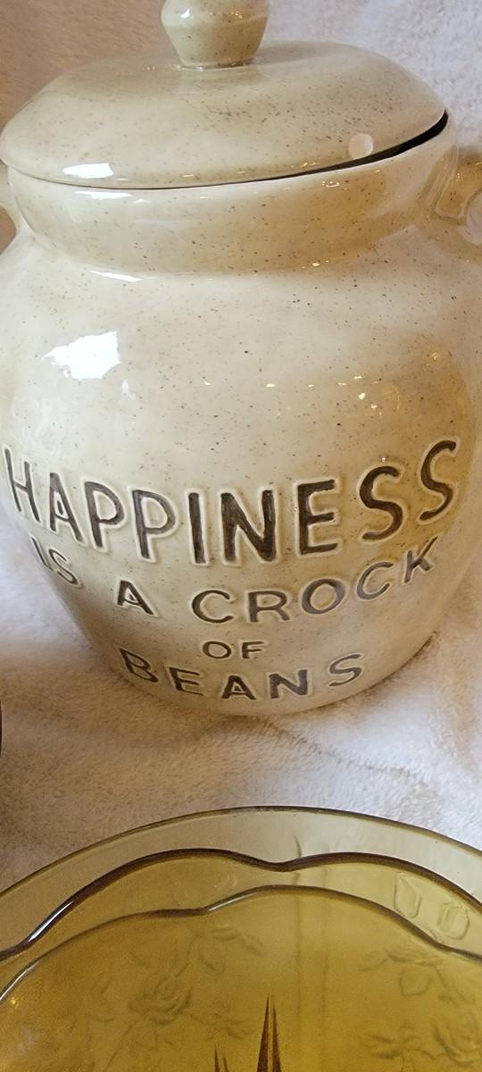 Happiness is a crock of beans has a small chip plus amber color glass pieces