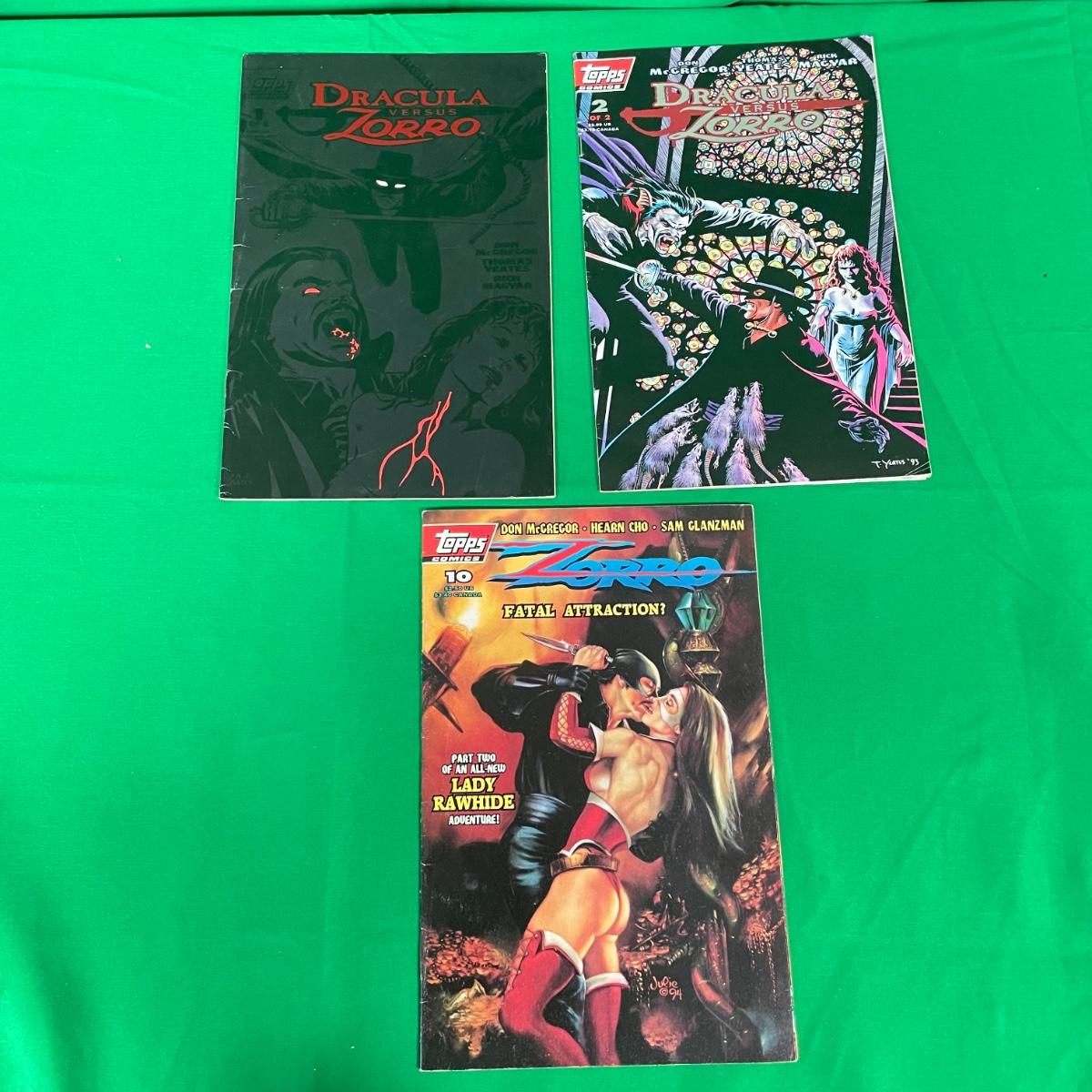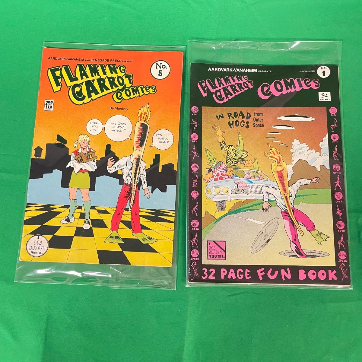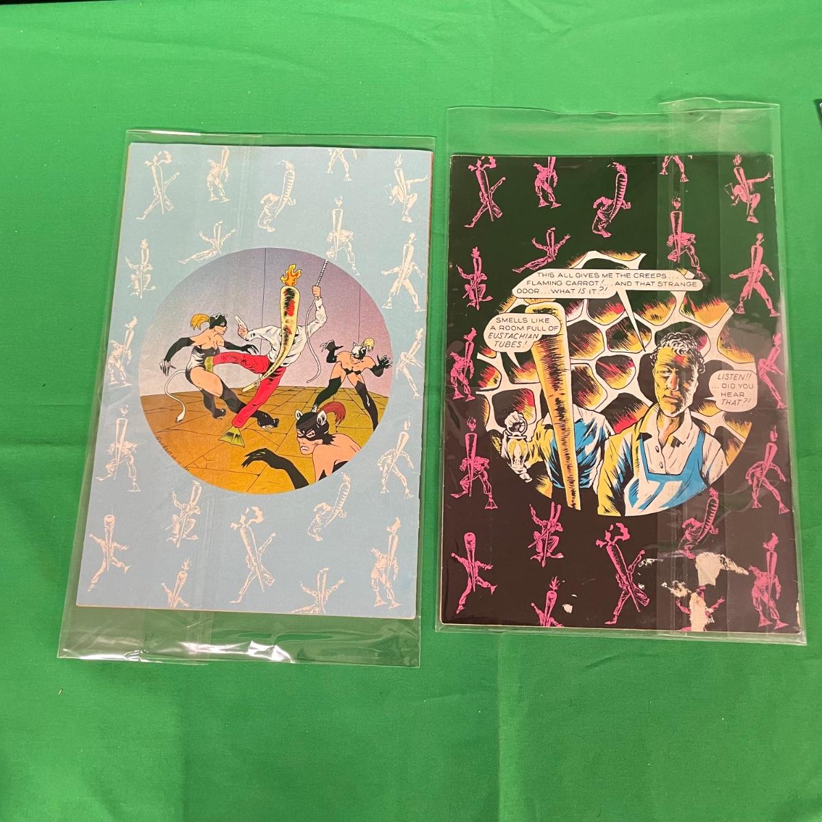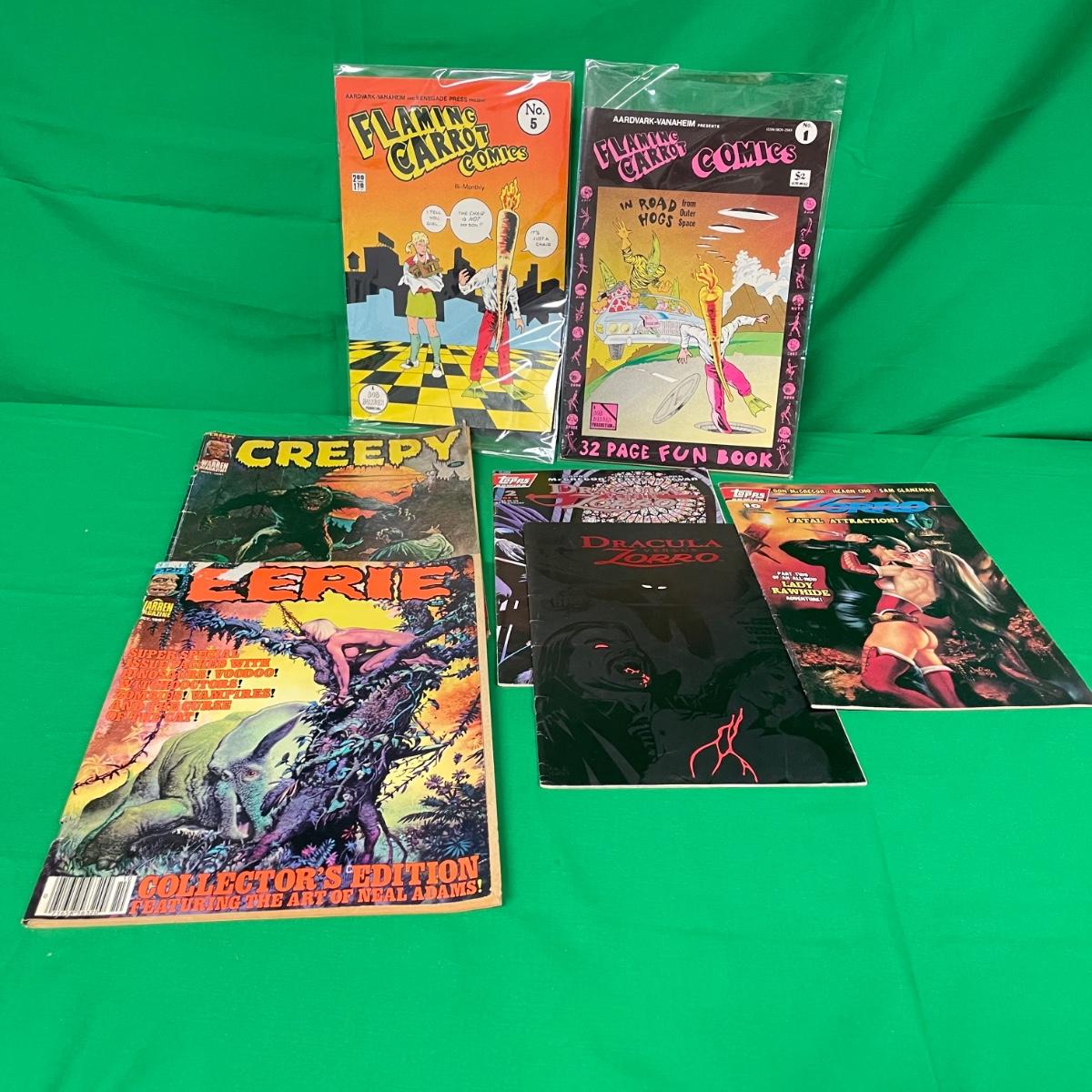 Lot features first issue Flaming Carrot alongside Flaming Carrot #5, Mini-series #s 1 and 2 Dracula vs Zorro, Zorro Fatal Attraction, Eerie, and Creepy magazines. See images. Items are sold as-is. No returns or refunds. Please bid accordingly.
