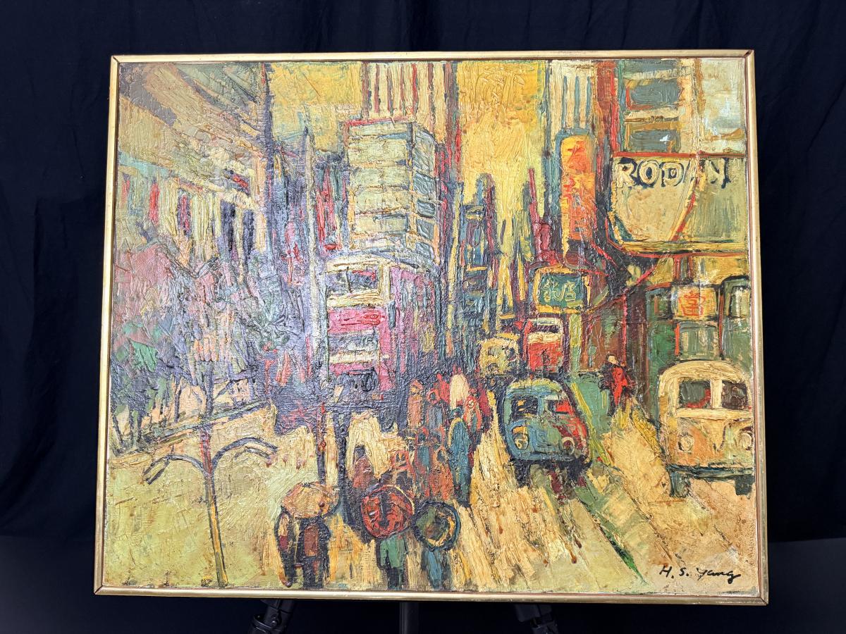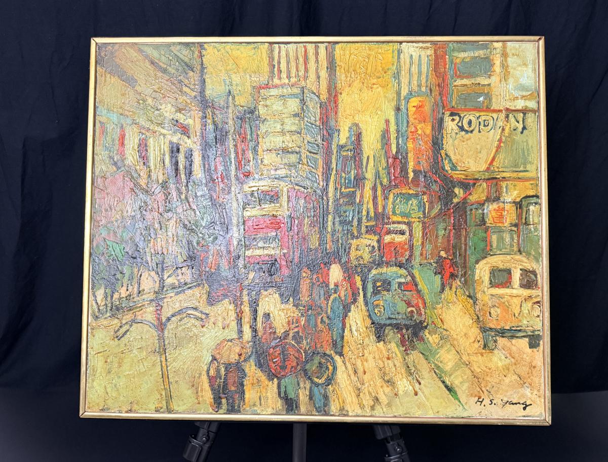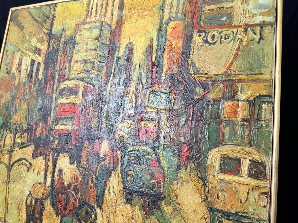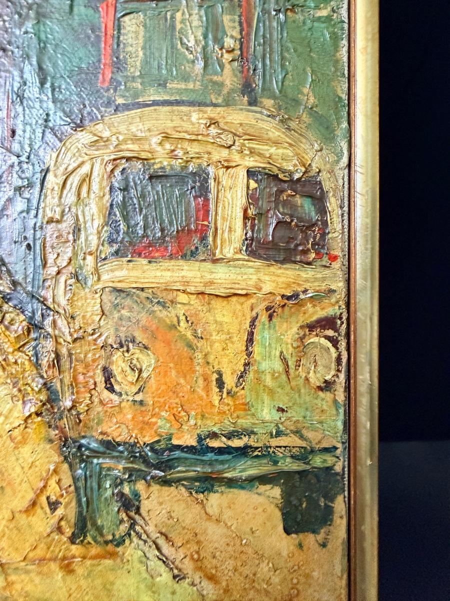 Hsing-Sheng Yang (1938-2013) renowned Taiwanese abstract painting master known for his bold brushstrokes & palette knife techniques. Mid Century piece with VW vans and double decker busses.