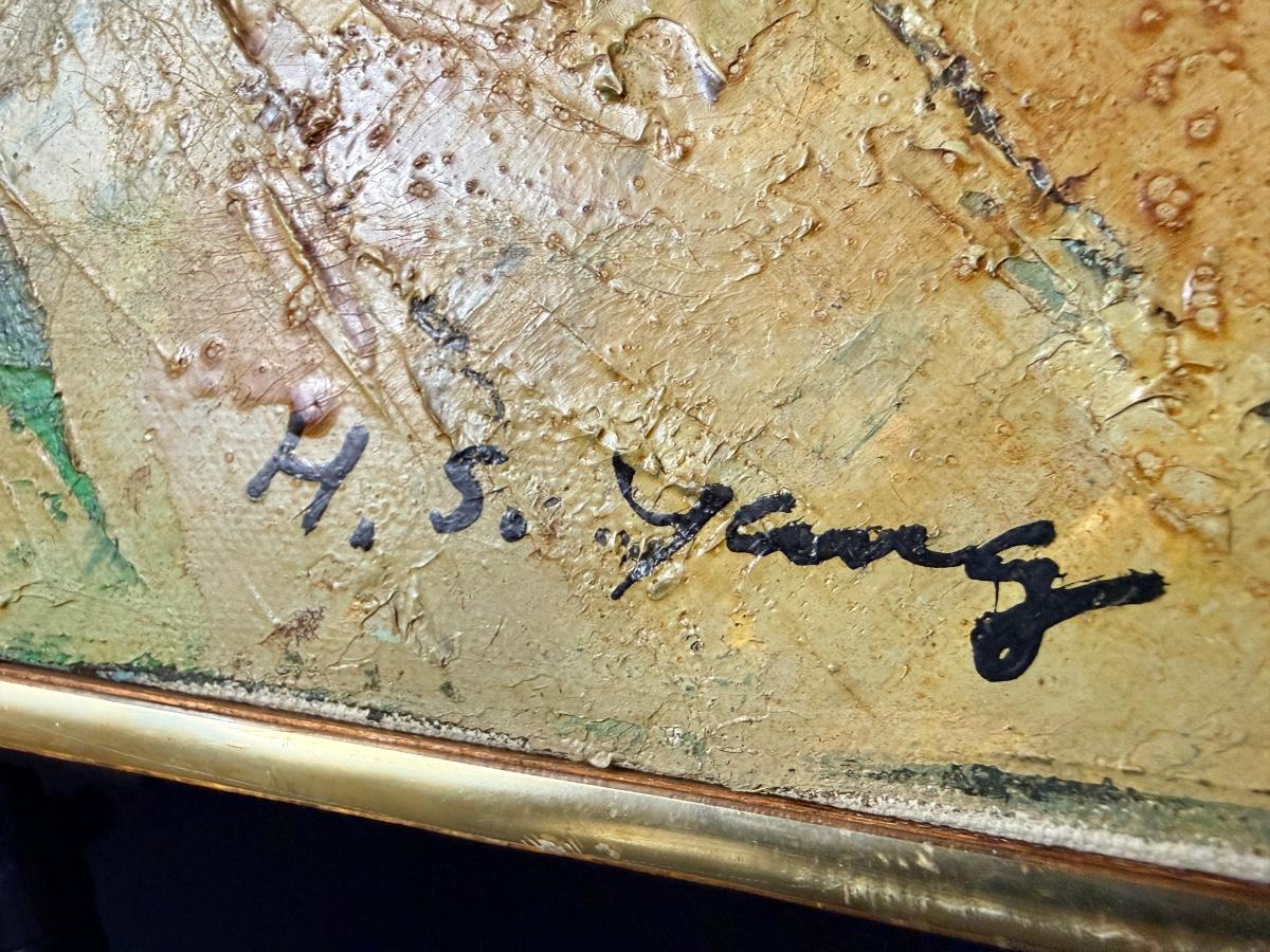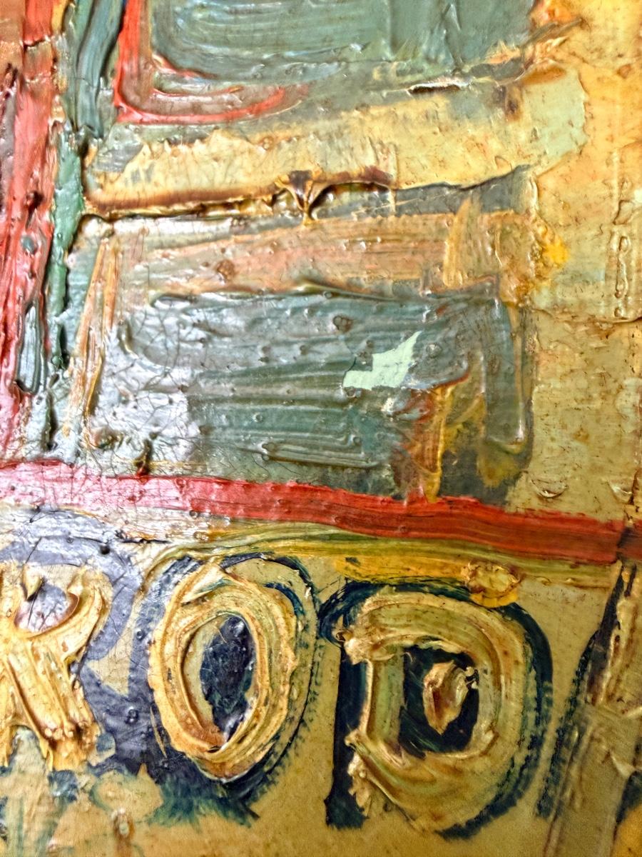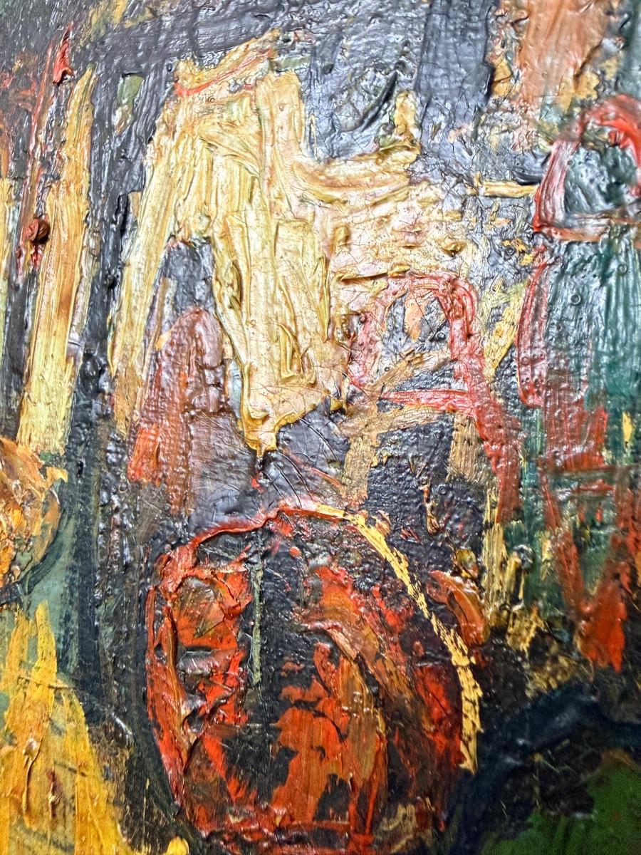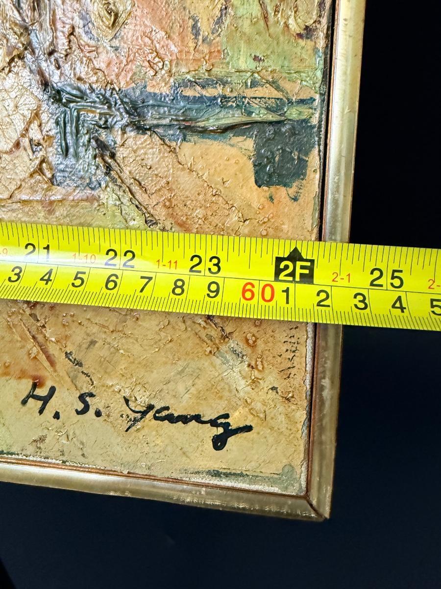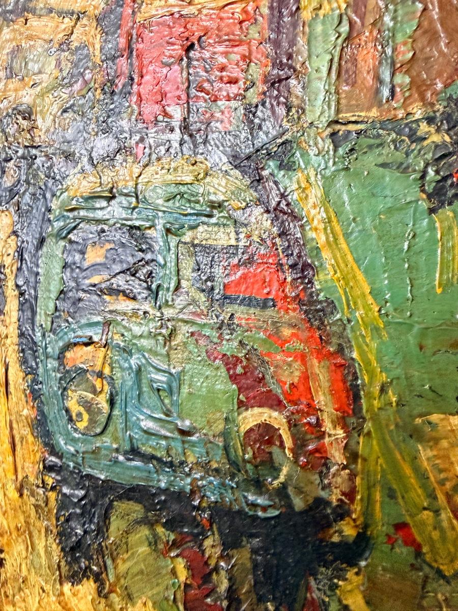 Hsing-Sheng Yang (1938-2013) renowned Taiwanese abstract painting master known for his bold brushstrokes & palette knife techniques. Mid Century piece with VW vans and double decker busses.