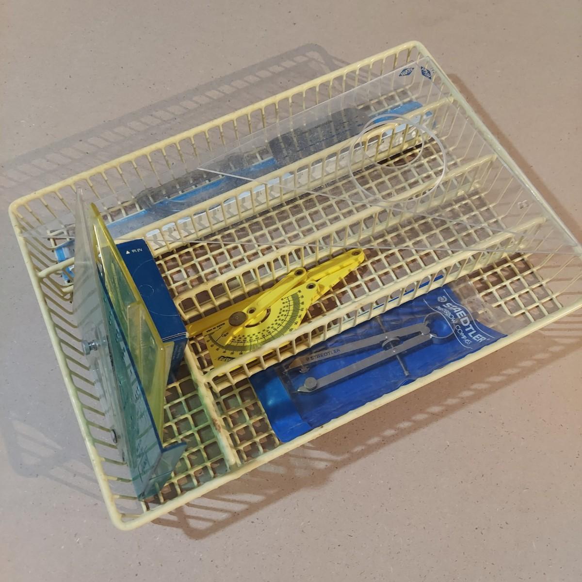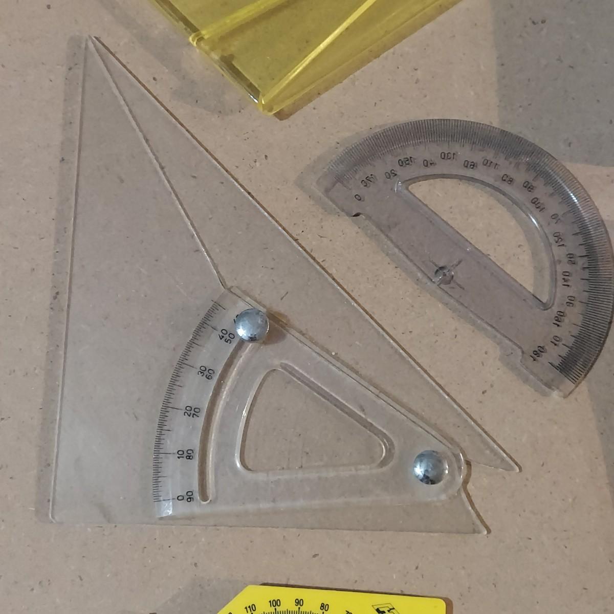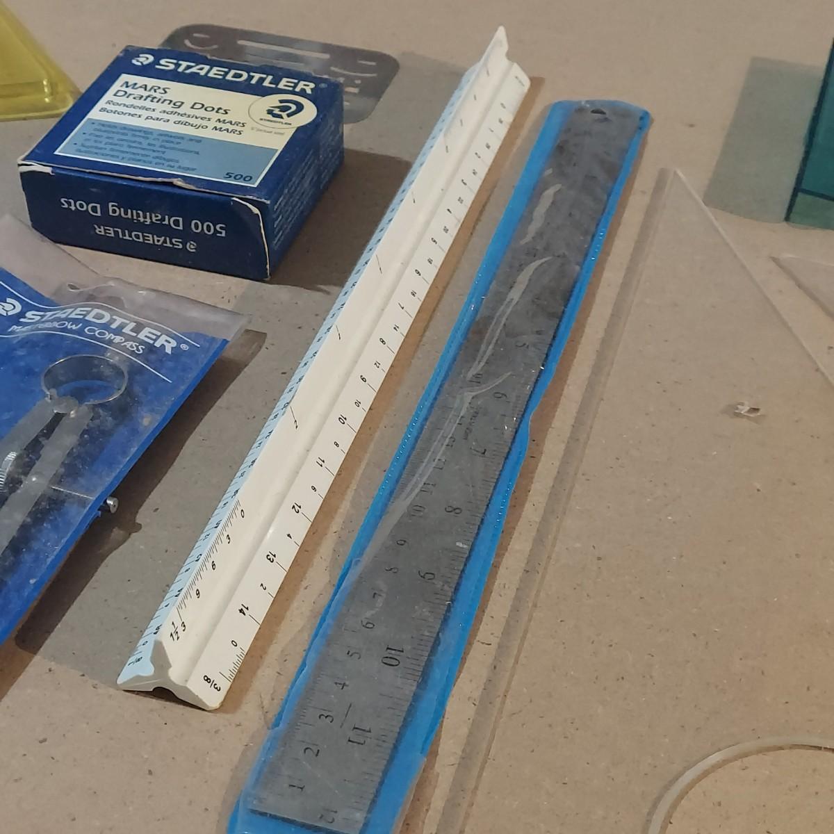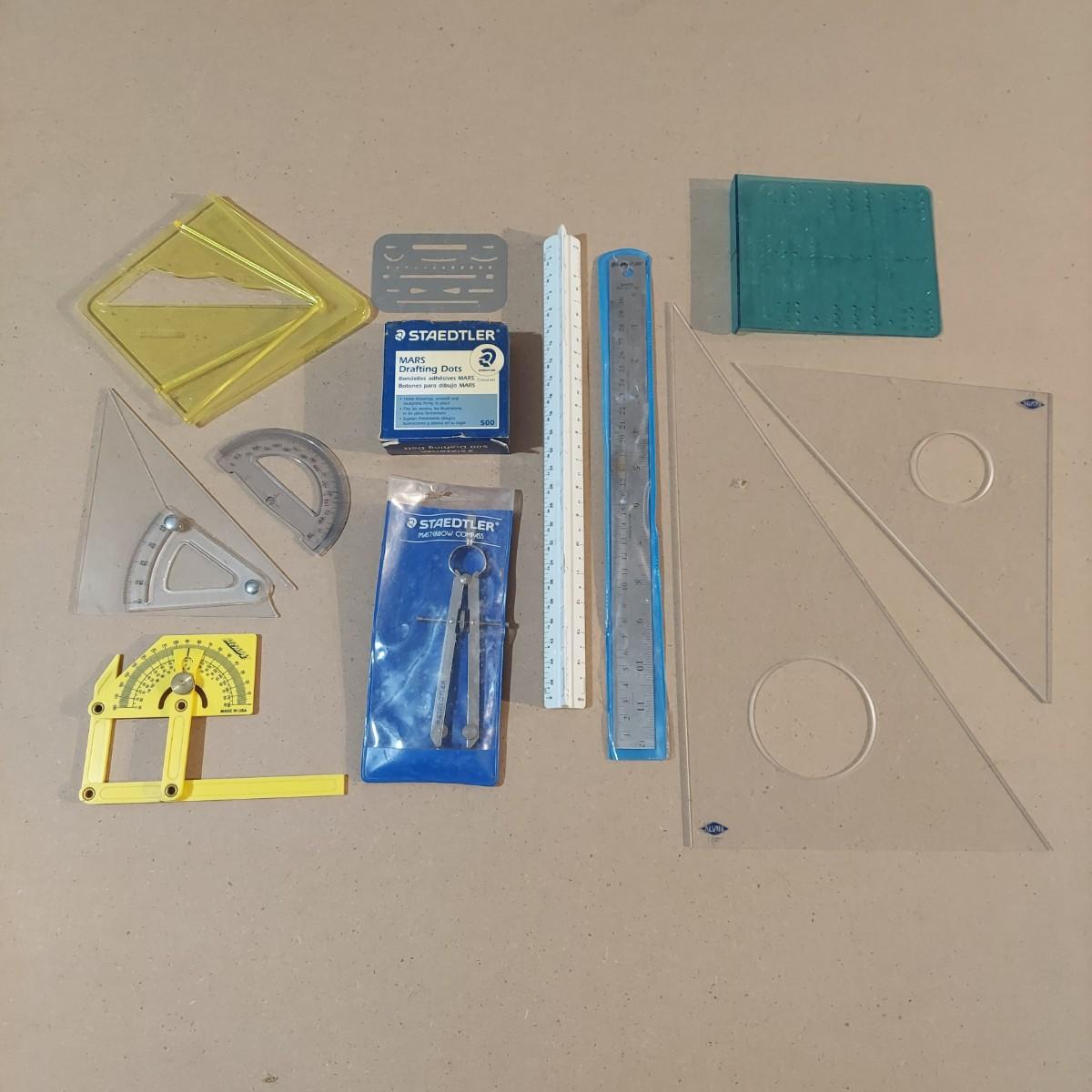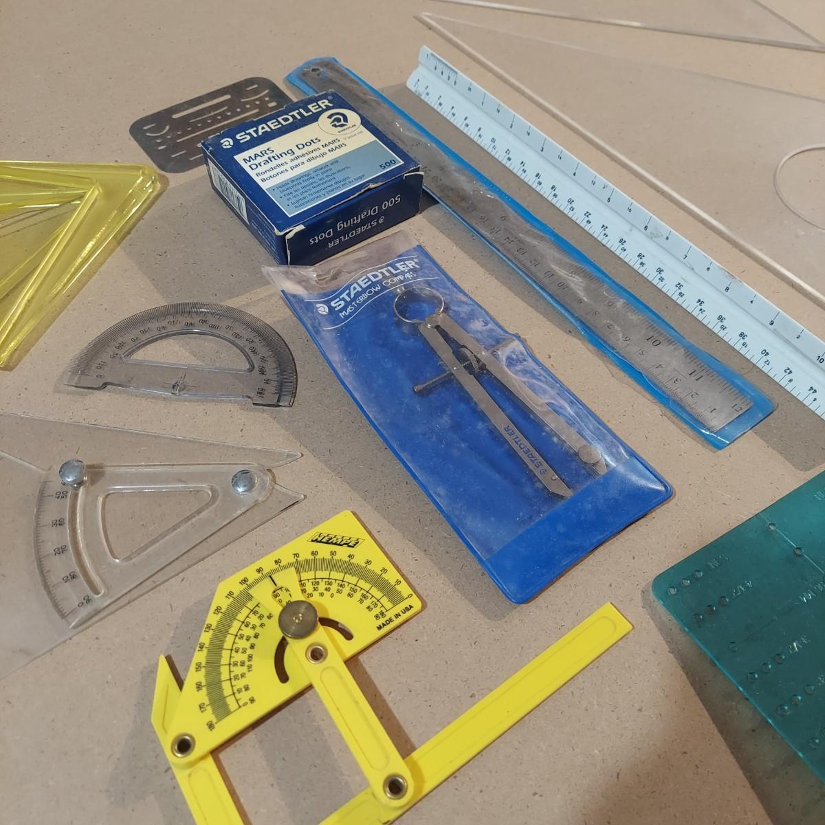 Lot of several drafting tools including a metal compass, drafting dots, an erasing shield and various protractors and rulers. Please see photos for details. Shipping available