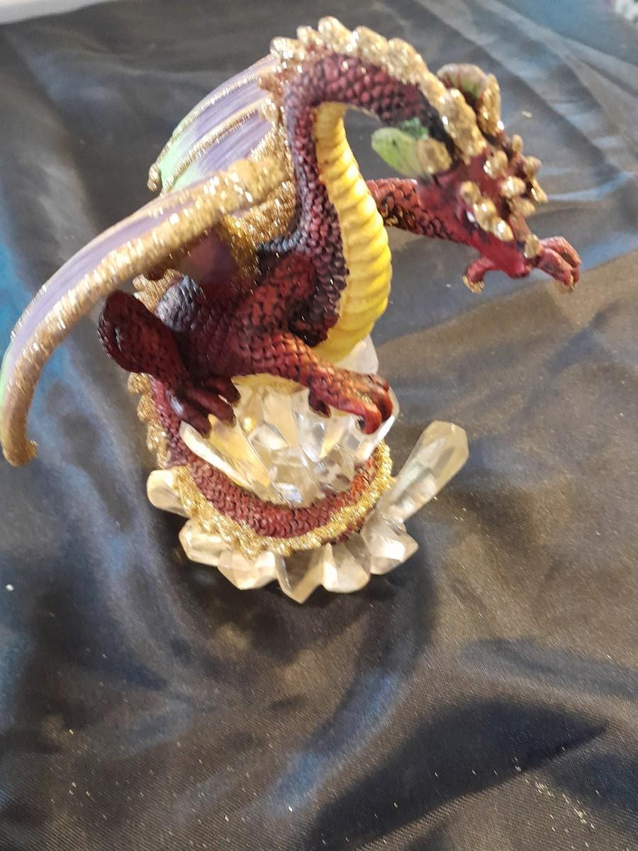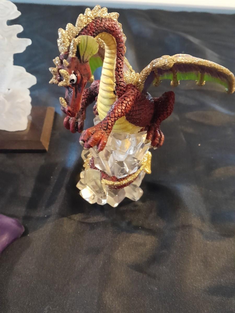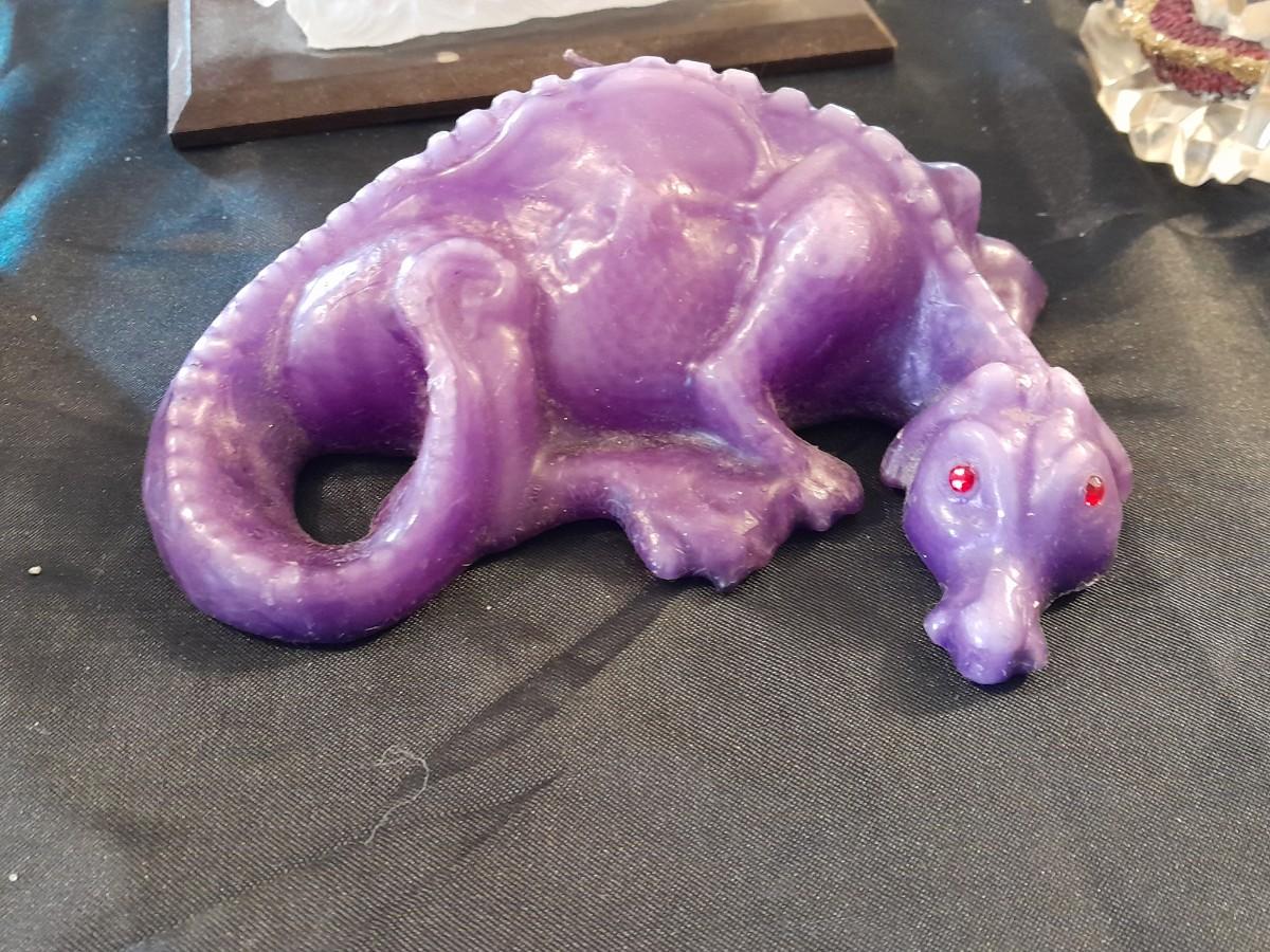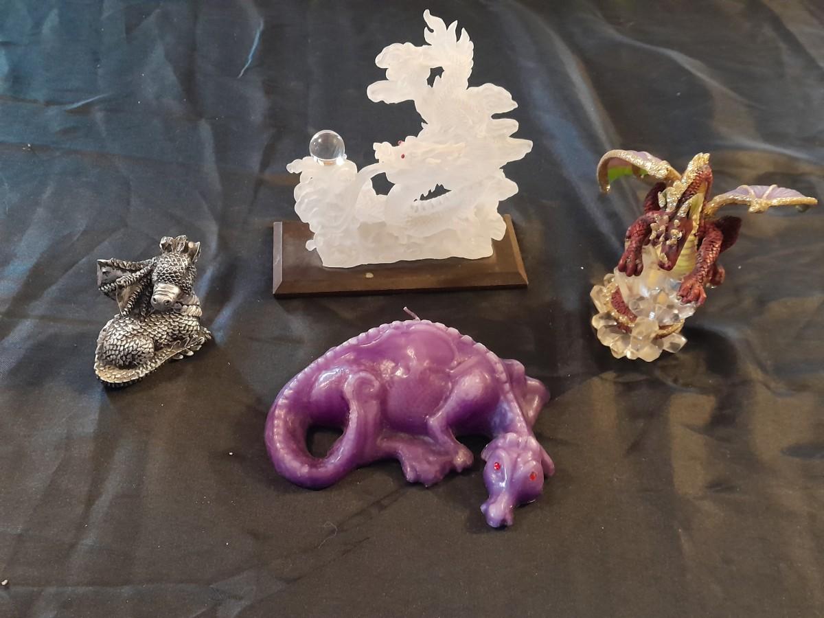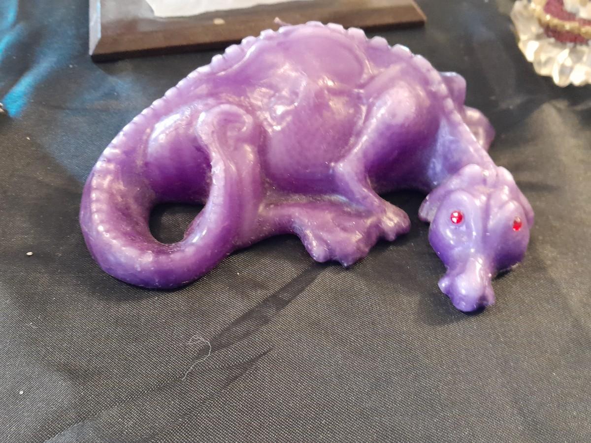 DRAGON COLLECTION SPIRIT OF THE GRANDIDIERITE DRAGON, PEWTER DRAGON, PURPLE WAX CANDLE DRAGON, AND DRAGON WITH CRYSTALS.