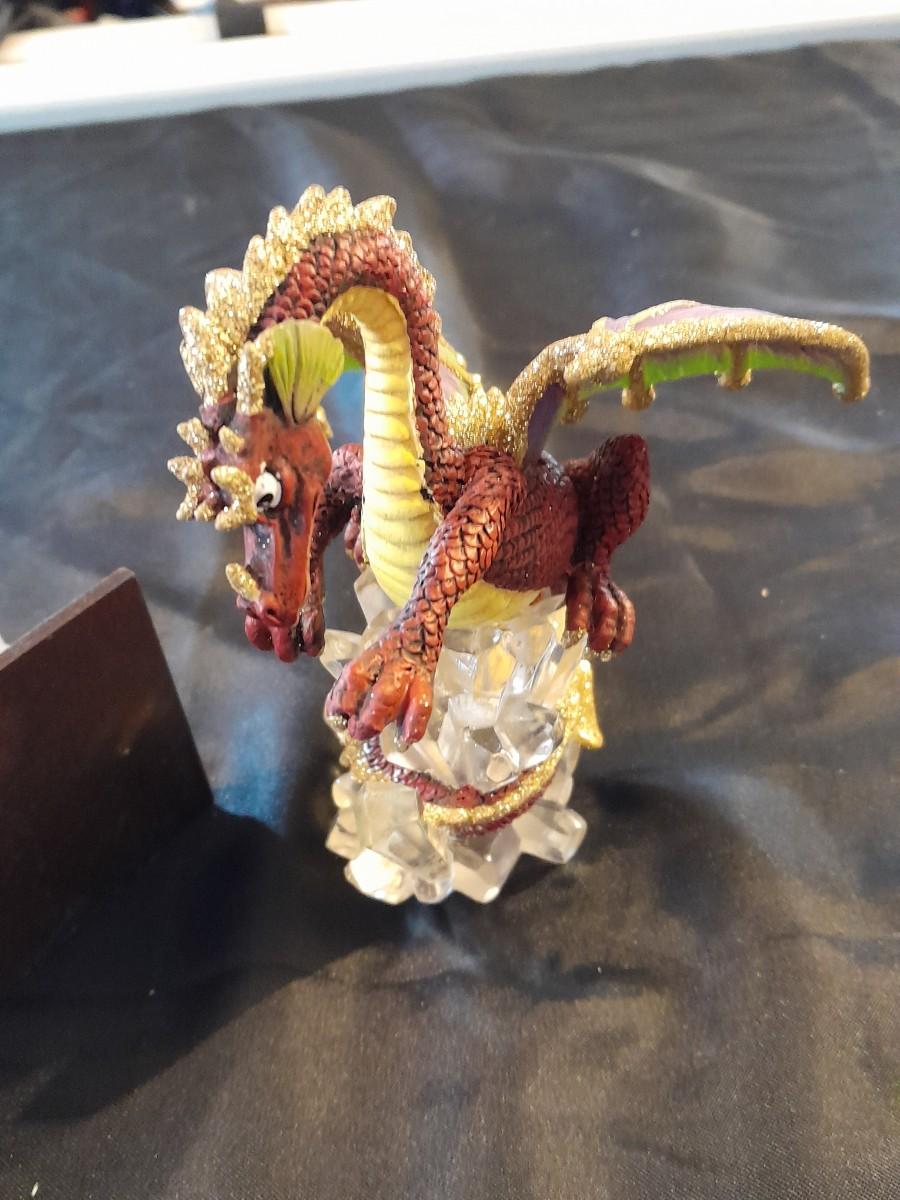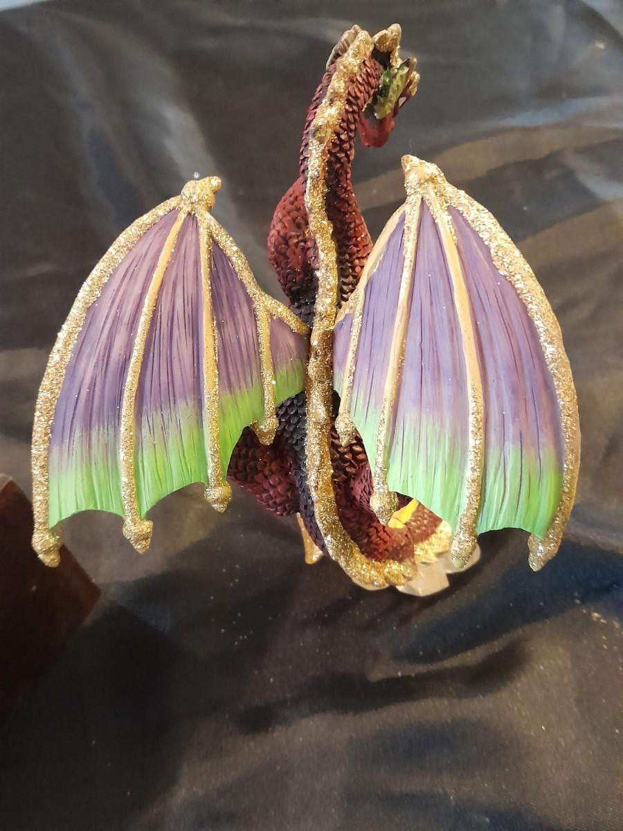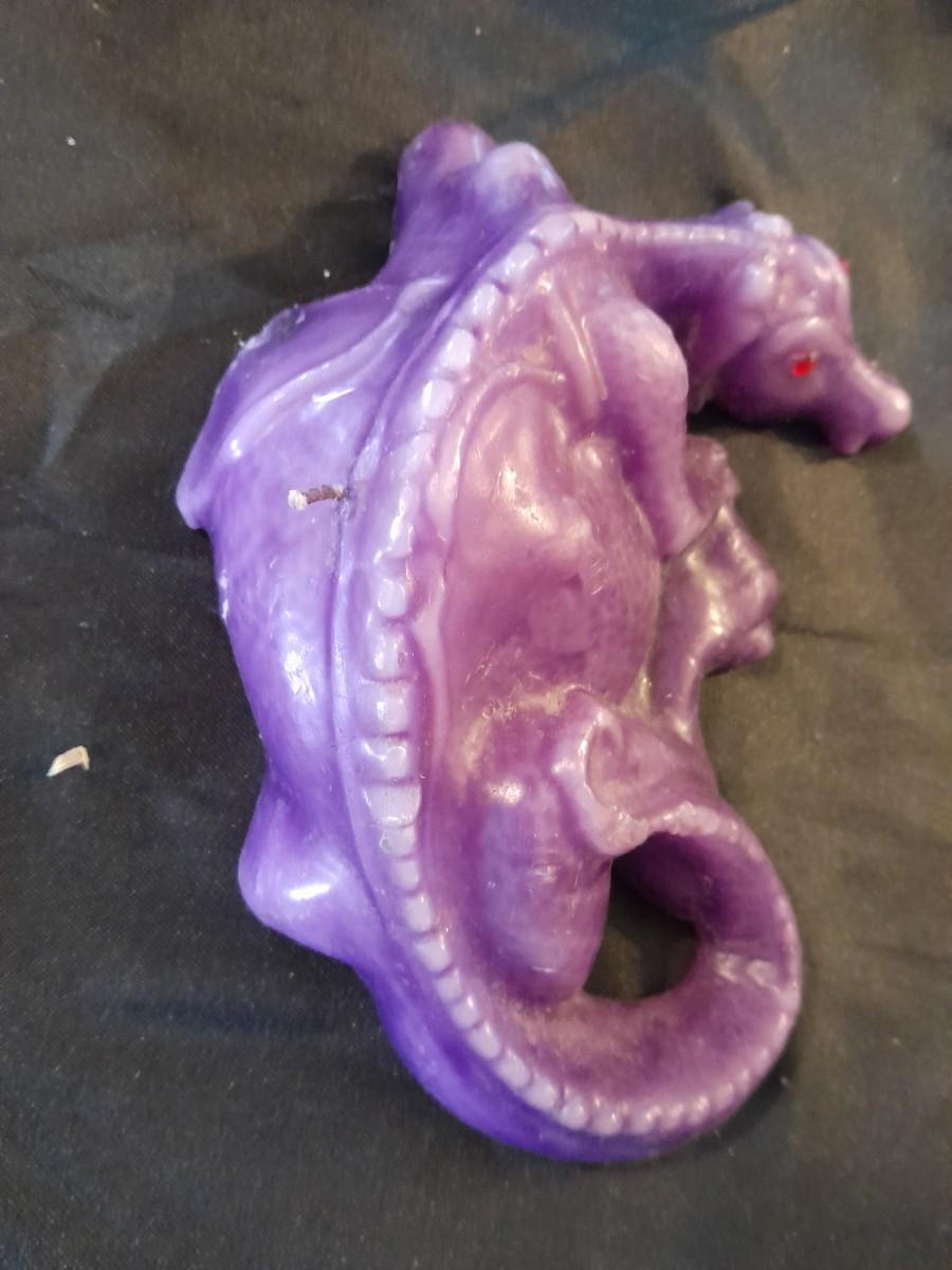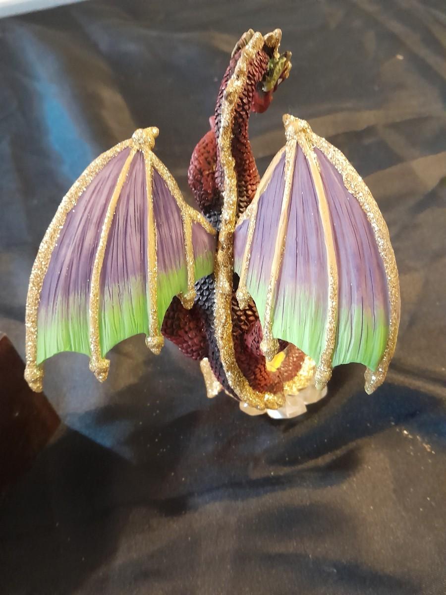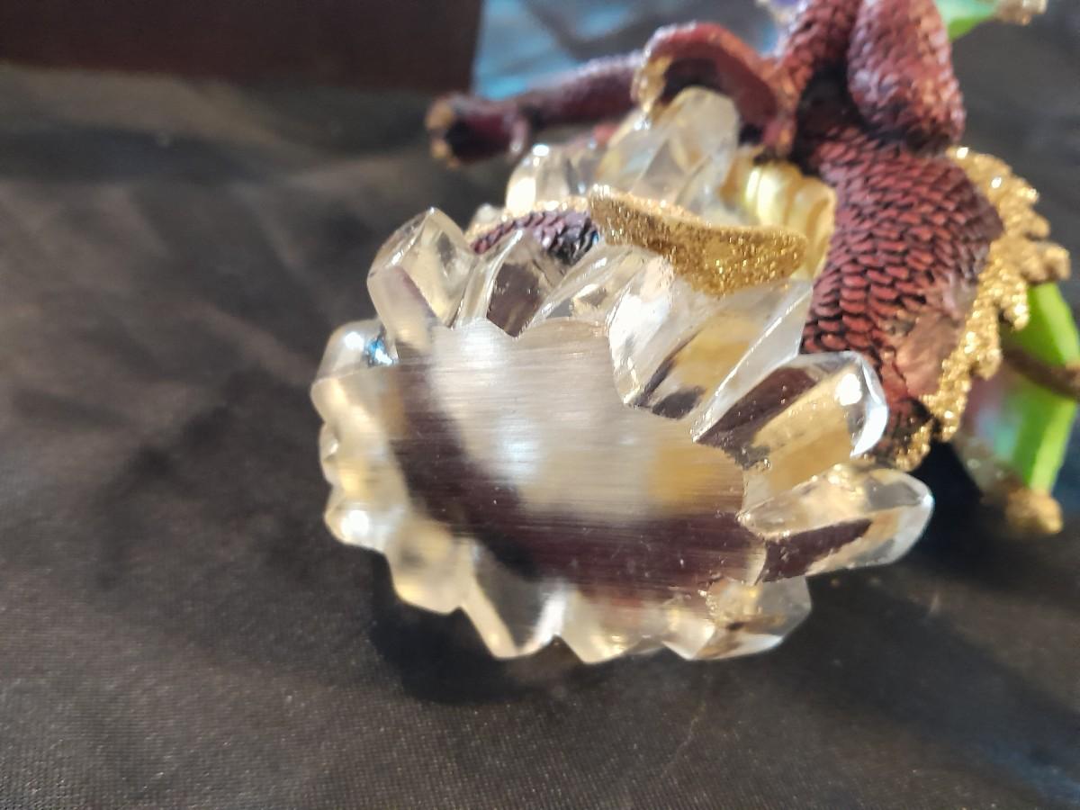 DRAGON COLLECTION SPIRIT OF THE GRANDIDIERITE DRAGON, PEWTER DRAGON, PURPLE WAX CANDLE DRAGON, AND DRAGON WITH CRYSTALS.