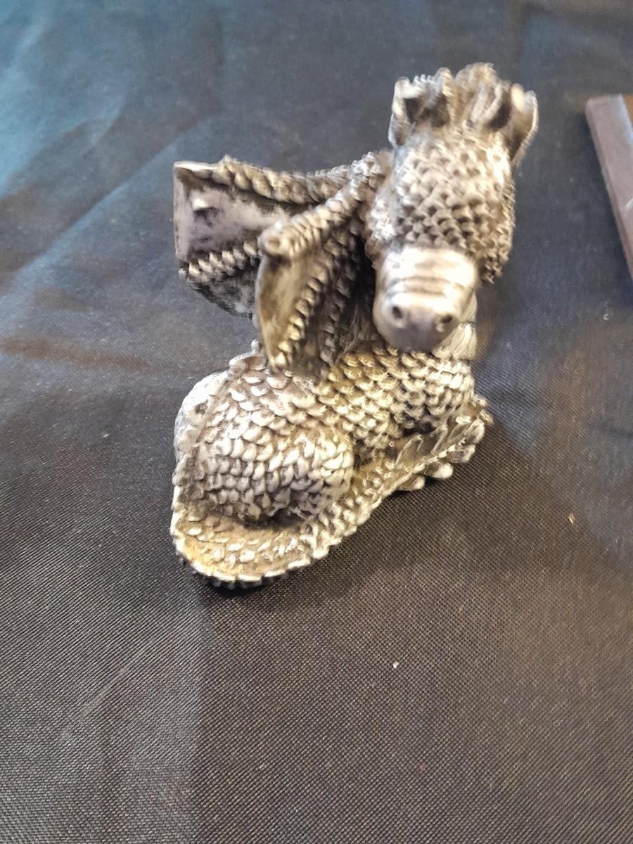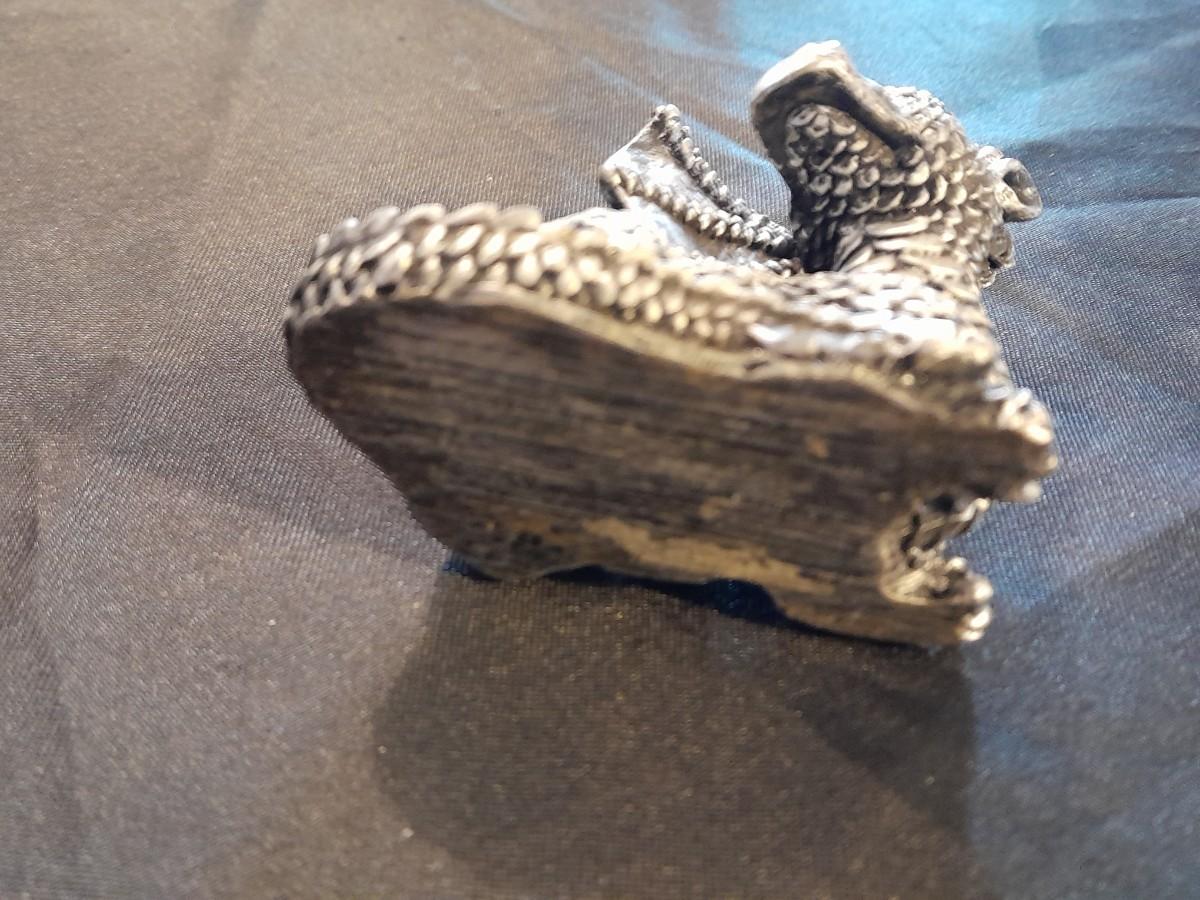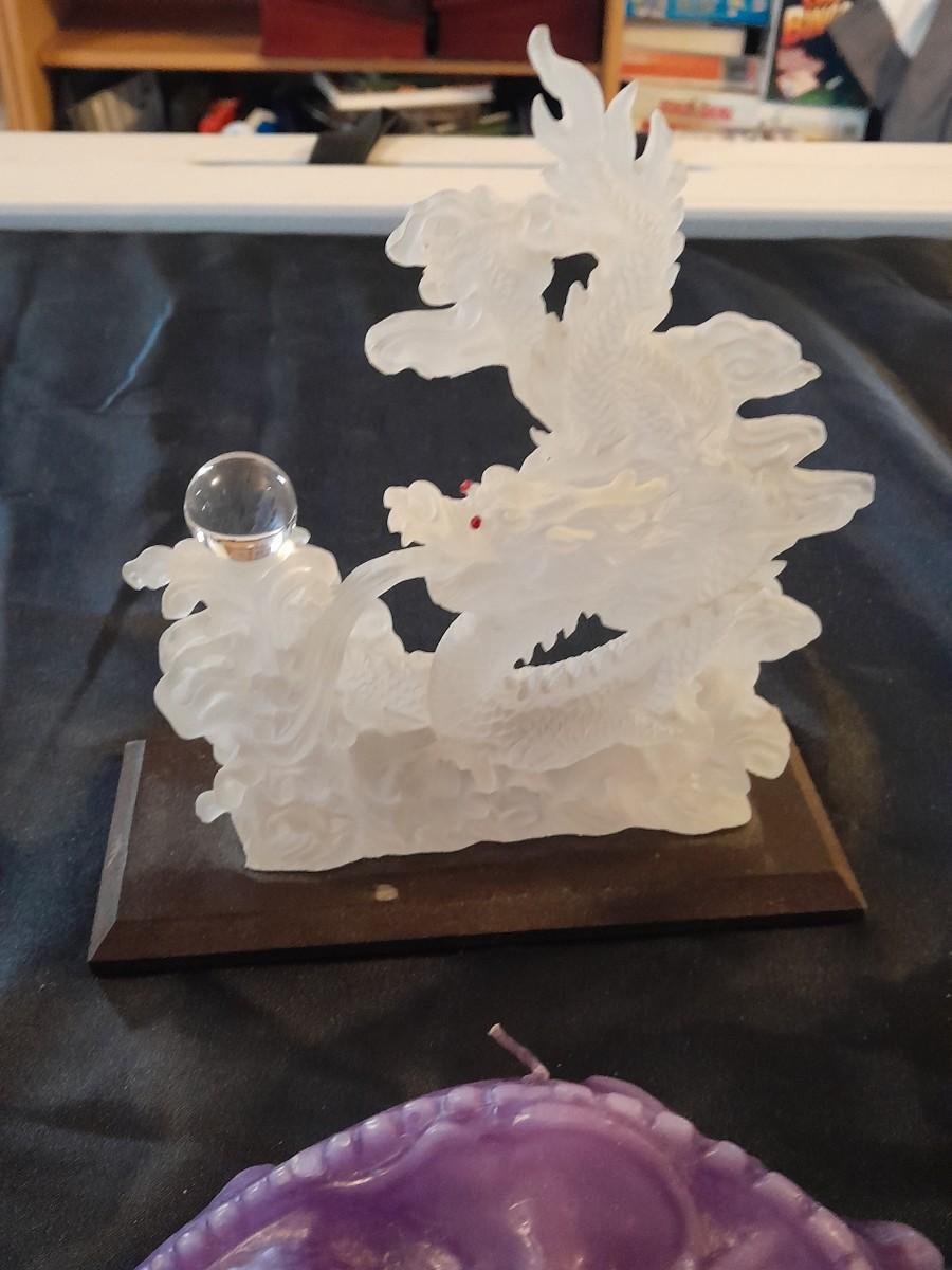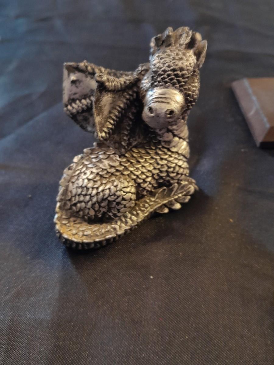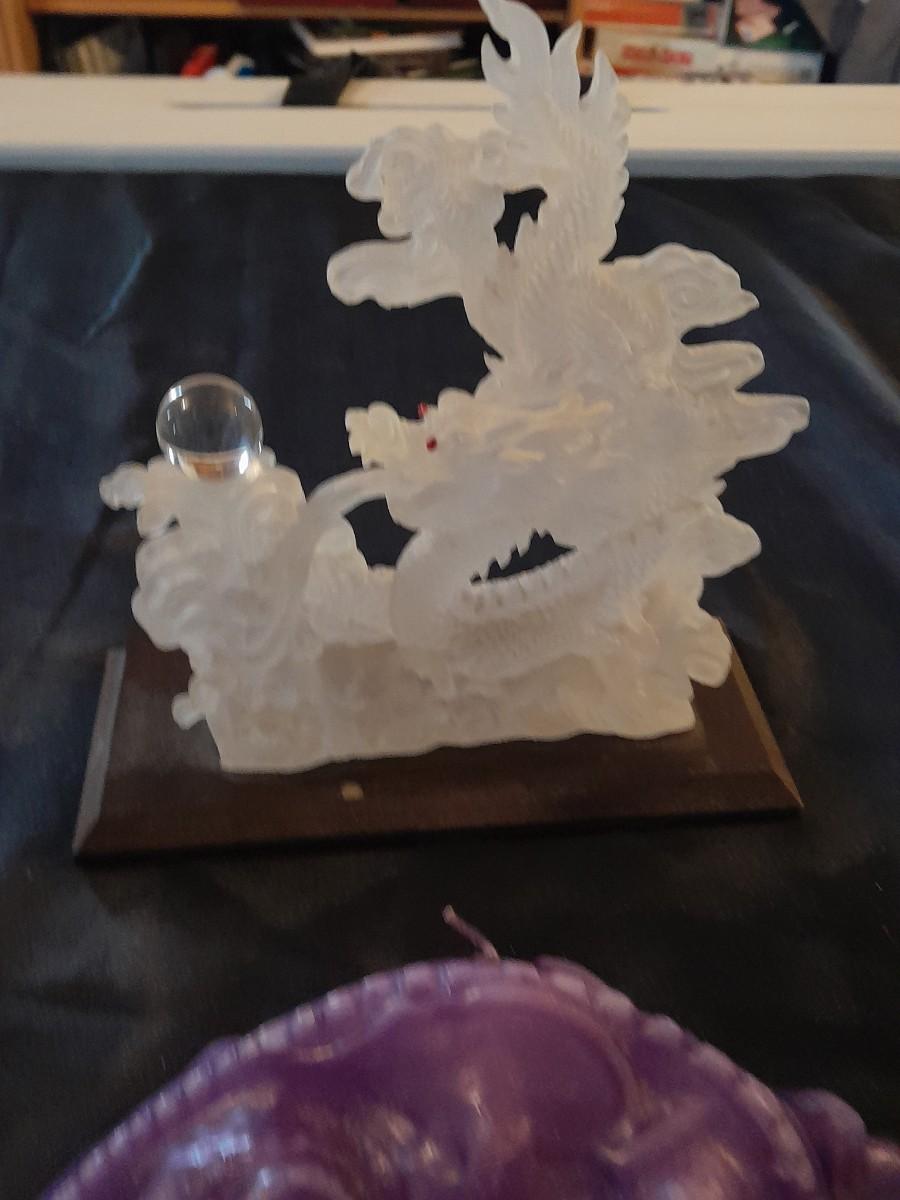 DRAGON COLLECTION SPIRIT OF THE GRANDIDIERITE DRAGON, PEWTER DRAGON, PURPLE WAX CANDLE DRAGON, AND DRAGON WITH CRYSTALS.