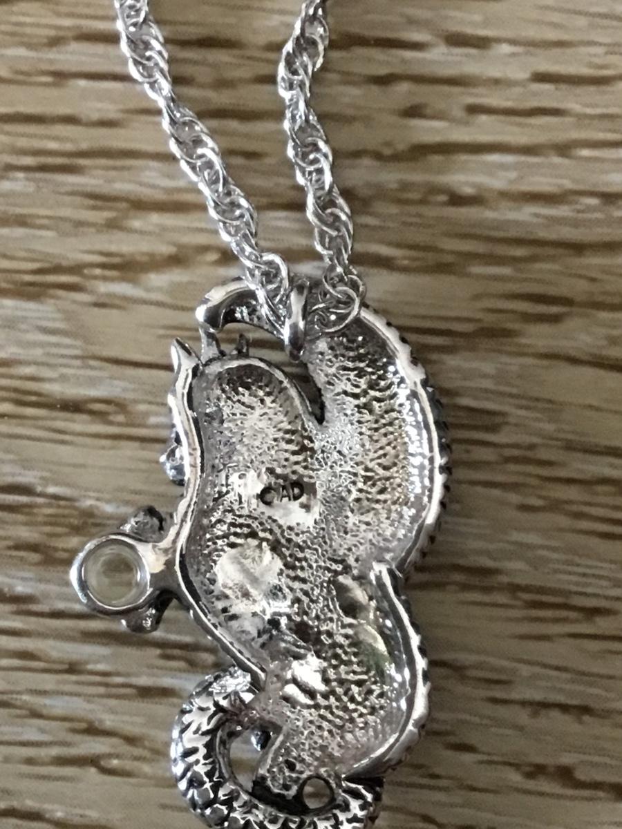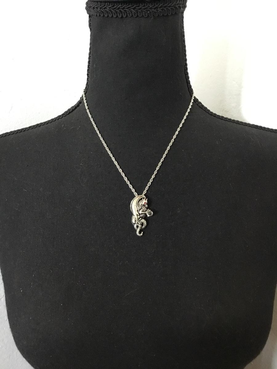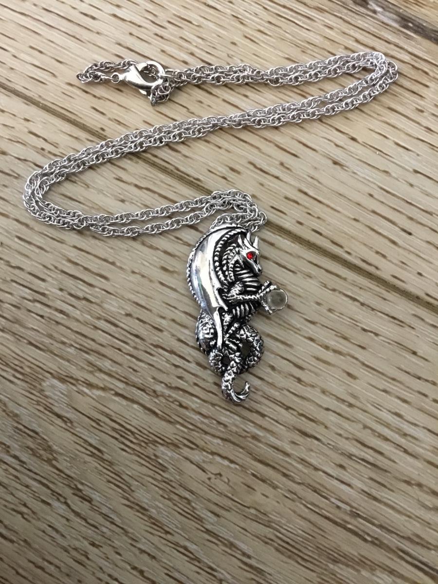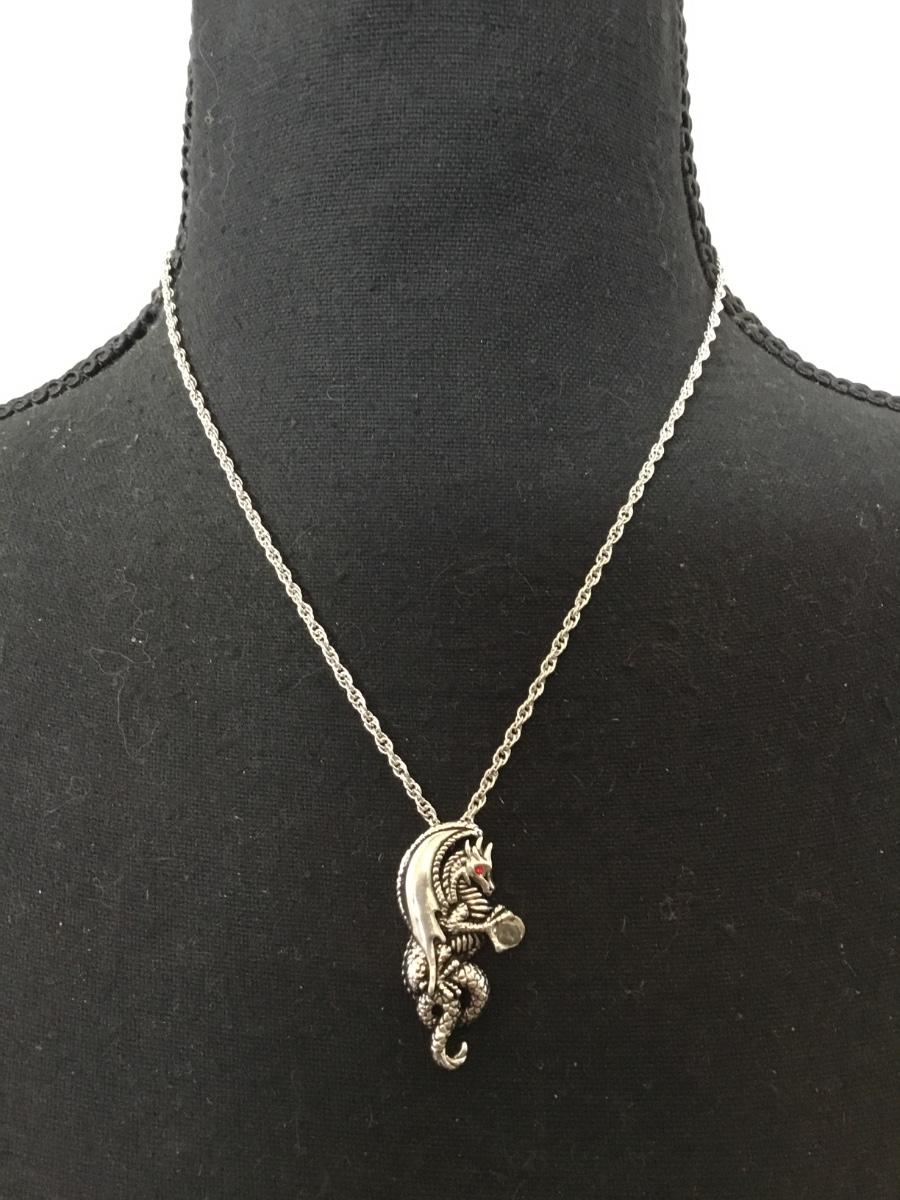 Dragon, red crystal eyes, and a crystal ball pendant necklace. Very nice silver tone, chain necklace.