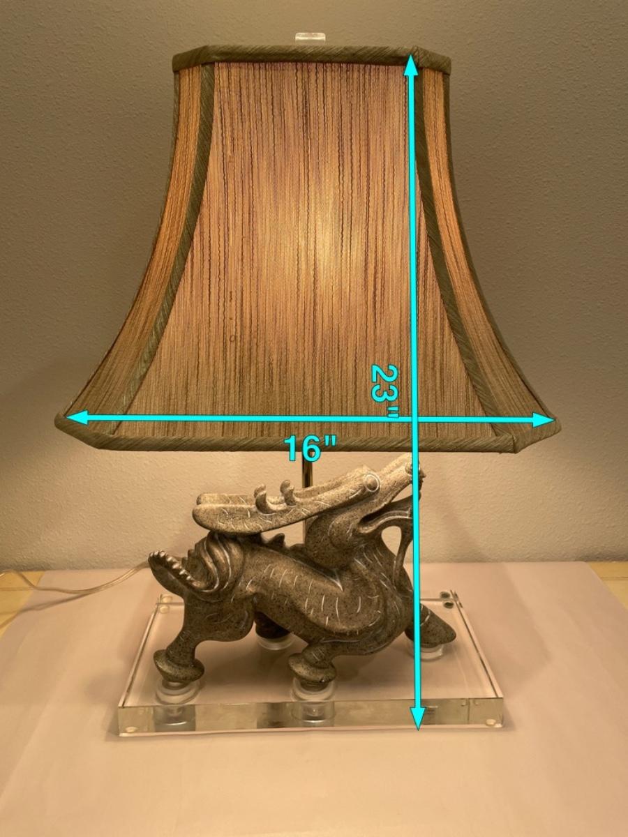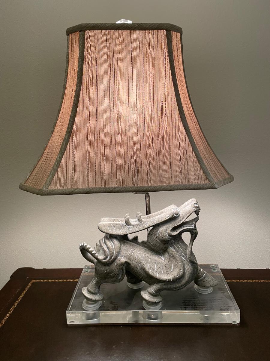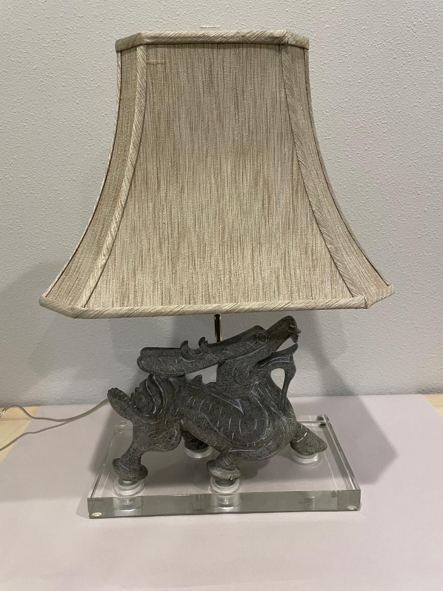Very nice quality lamp with dragon base made of stone, with a faux silk shade and a heavy acrylic base. Reserve is $40