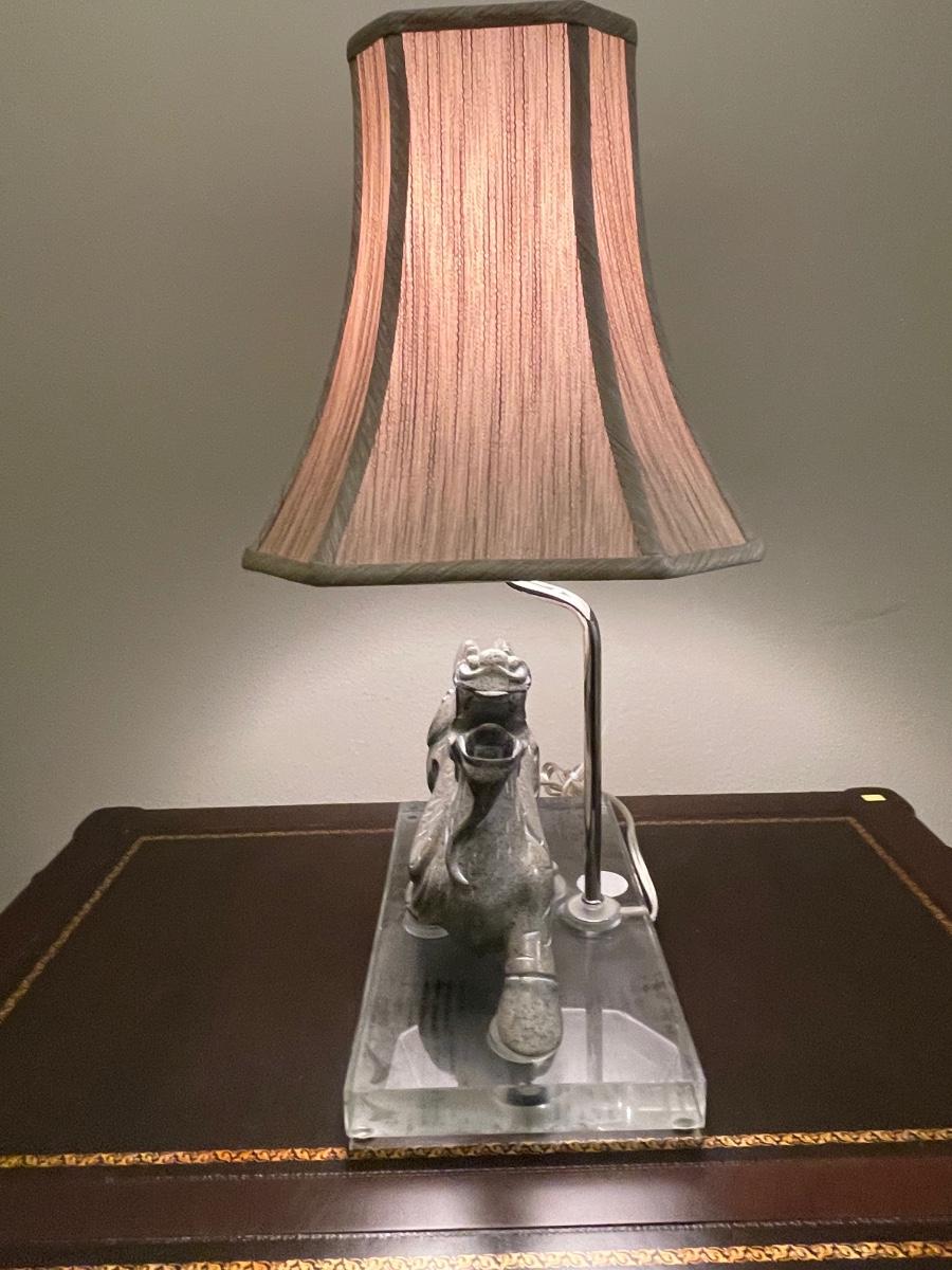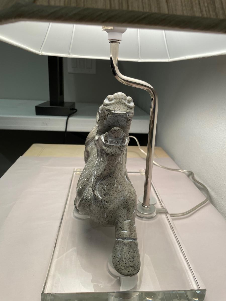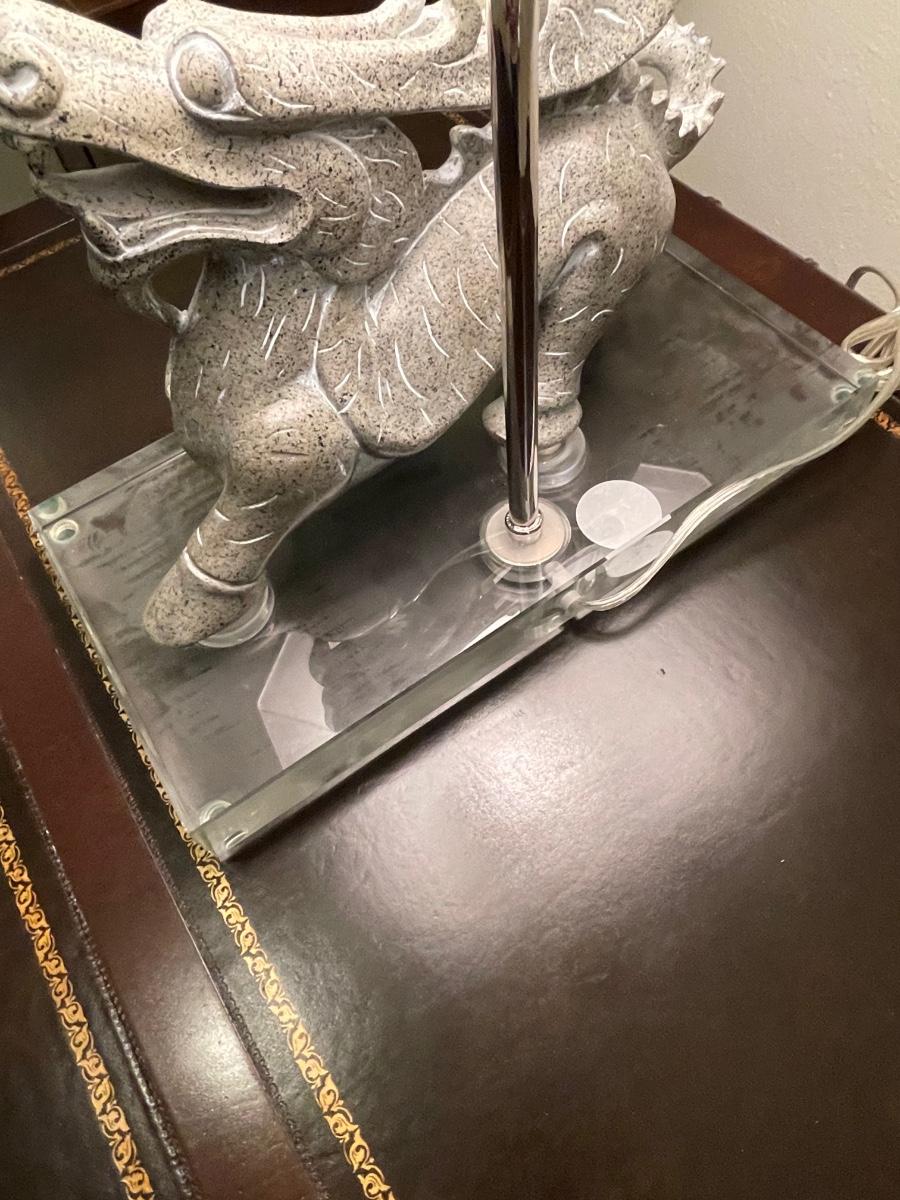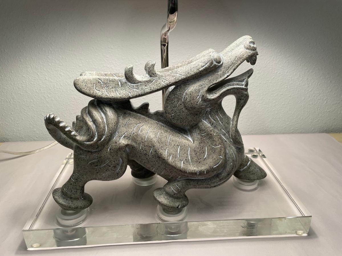 Very nice quality lamp with dragon base made of stone, with a faux silk shade and a heavy acrylic base. Reserve is $40