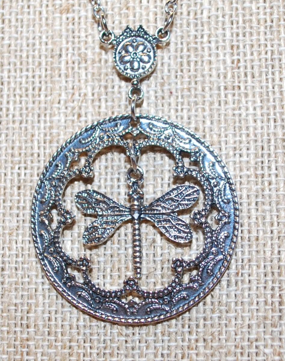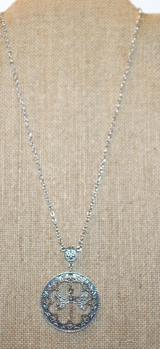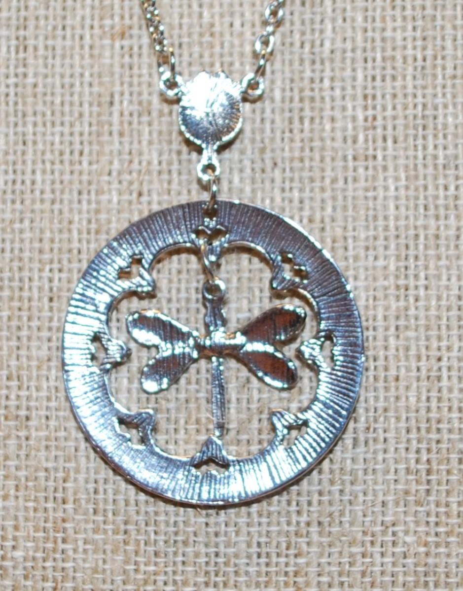 "Dragonfly in a Circle" PENDANT (1½" Diameter) on a Silver Tone Necklace Chain 18" L