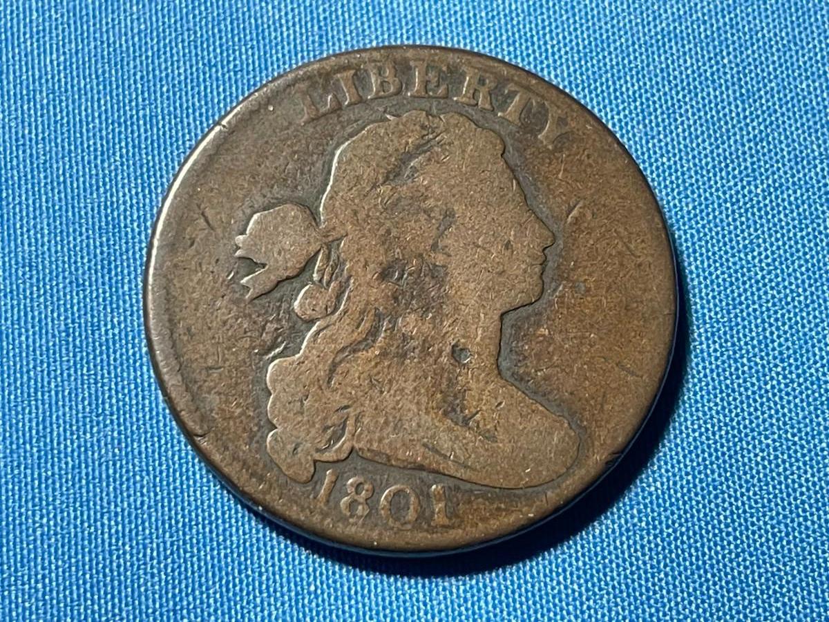DRAPED BUST 1801 GOOD/VG CONDITION LARGE CENT AS PICTURED. $5 DOMESTIC SHIPPING.