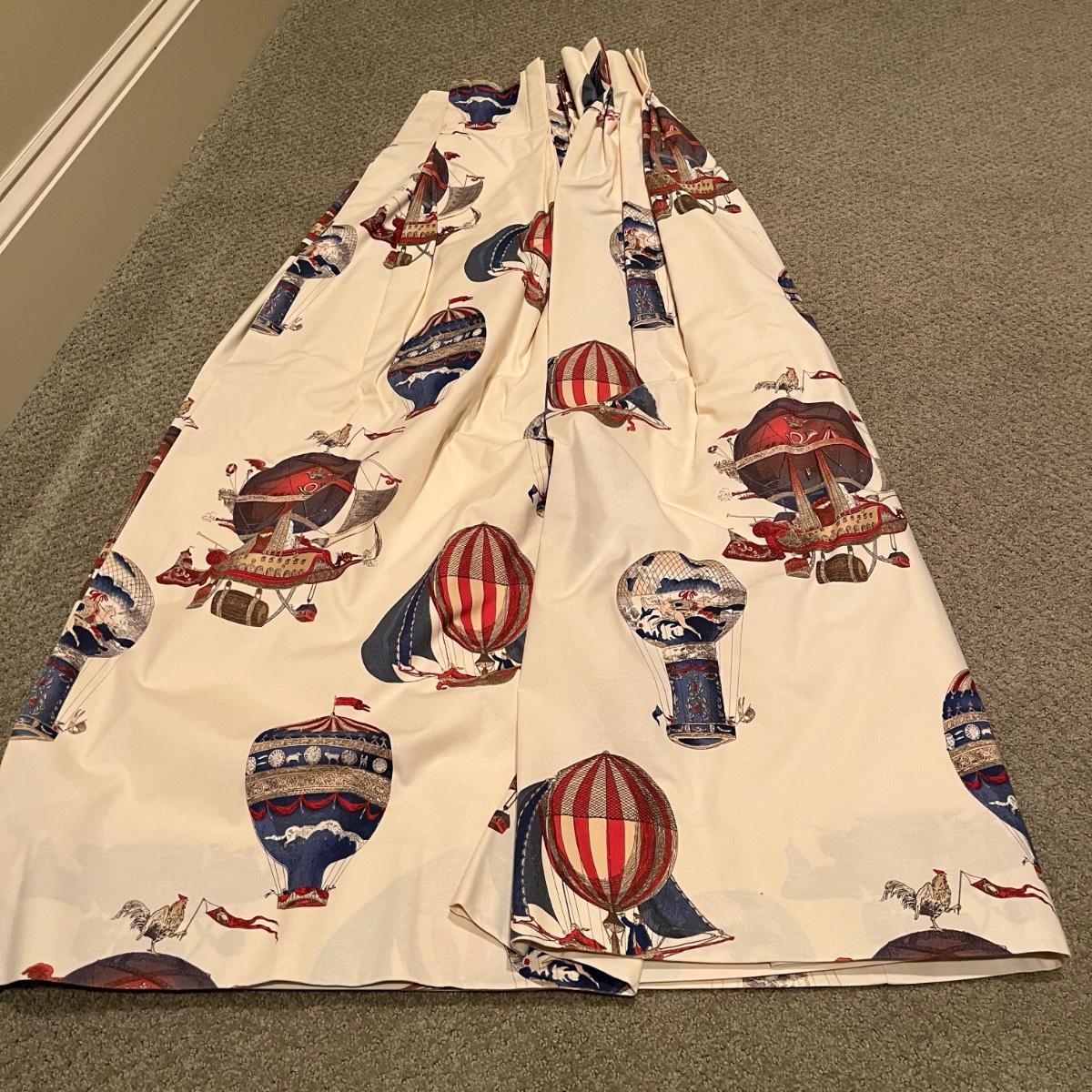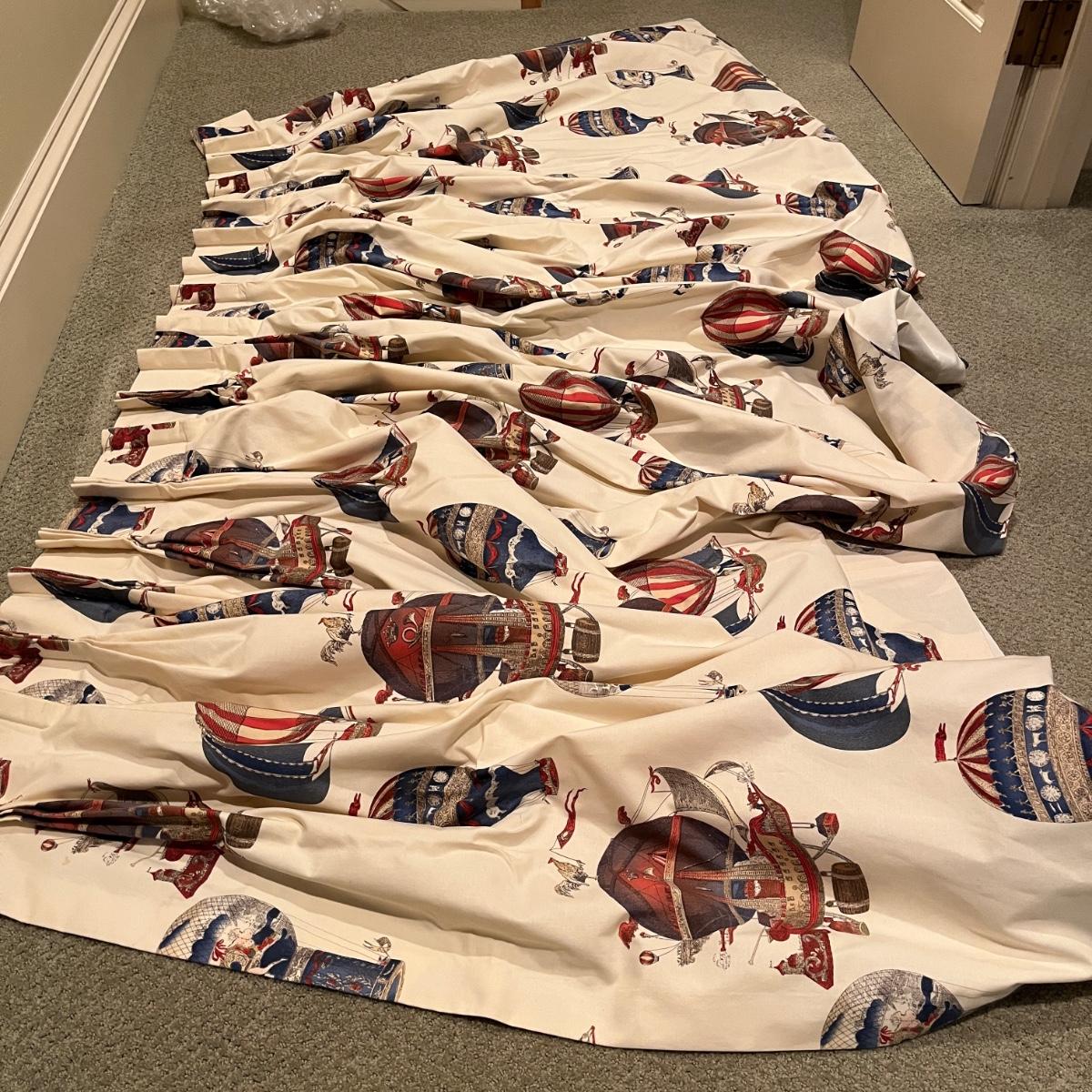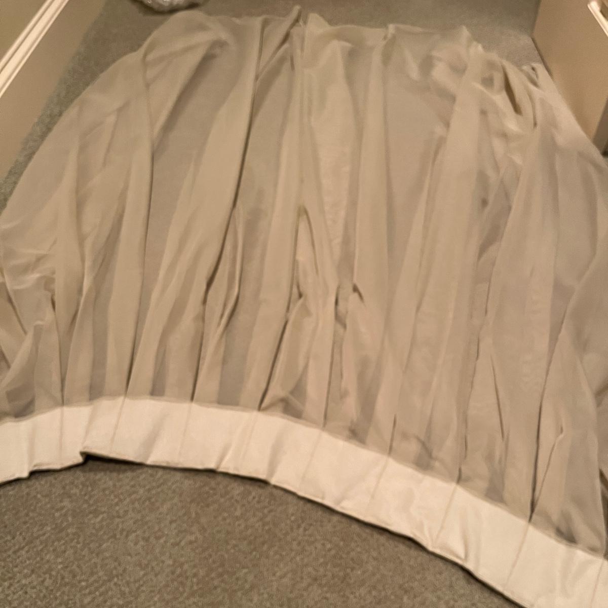 Lot includes two lined drapes that measure 60” x 44”H, two sheet drapes that measure 46” x 62”H. and two twin bed skirts.
