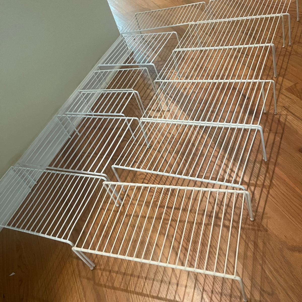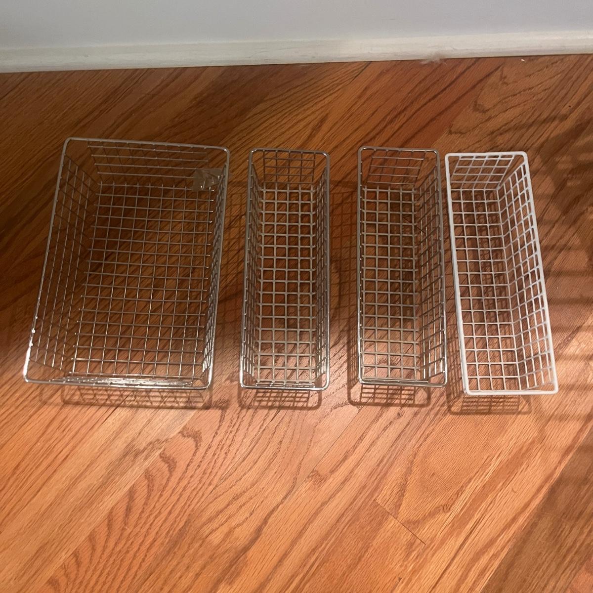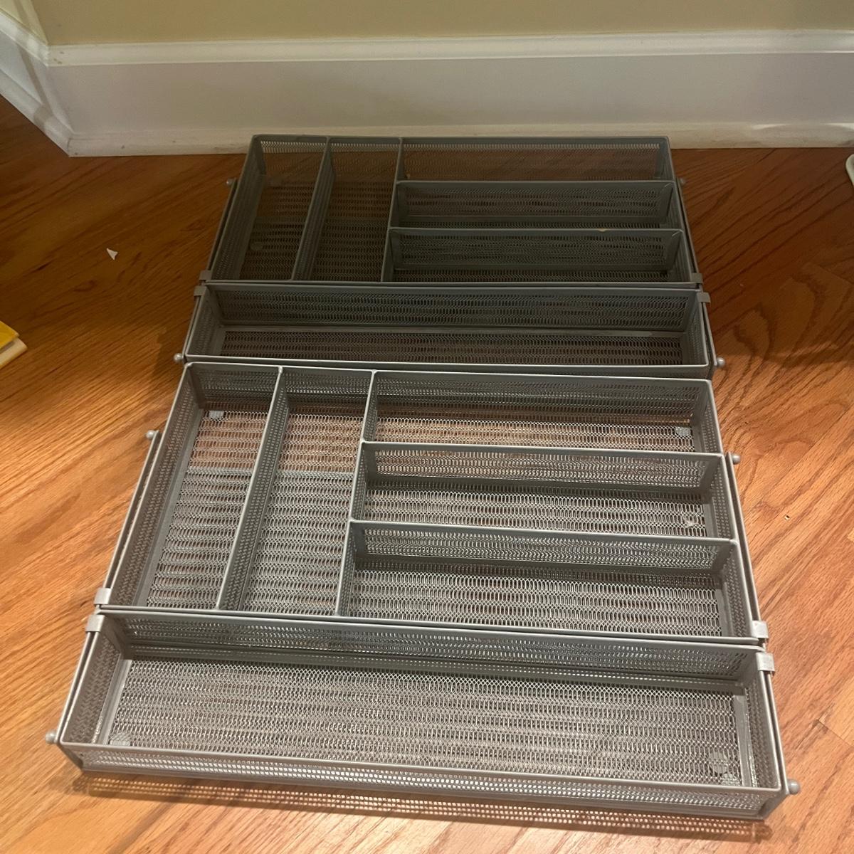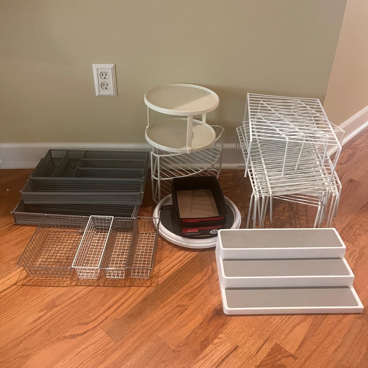 Lot includes ten plastic covered wire shelf organizers, two expandable metal cutlery holders, four metal baskets, three Rubbermaid drawer organizers, lazy Susan and expandable spice organizer. Expandable cutlery holders measure 11.5” x 16” x 3”H when not expanded and 18.5” x 16” x 2”H at maximum expansion.