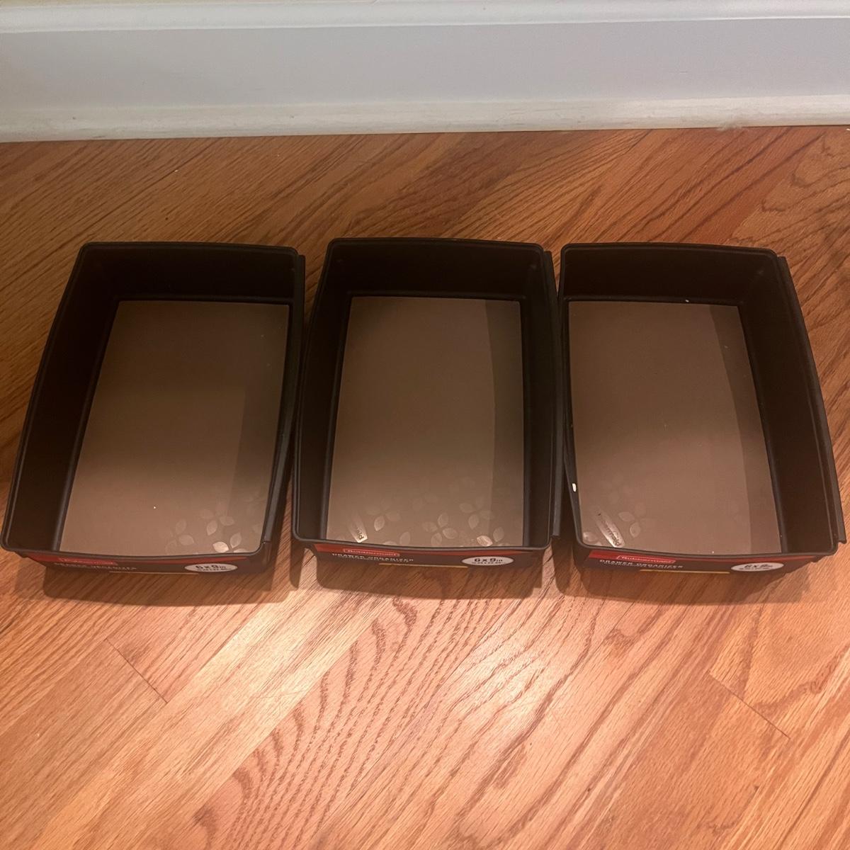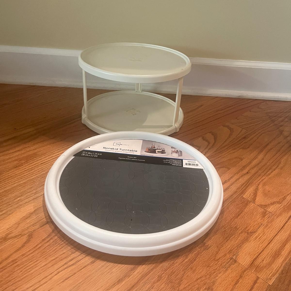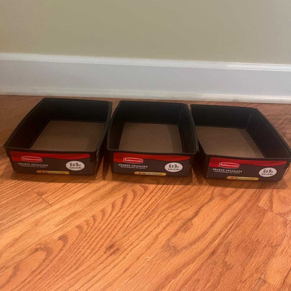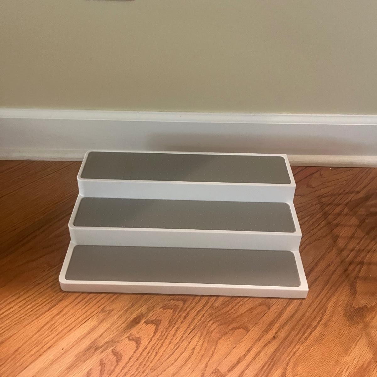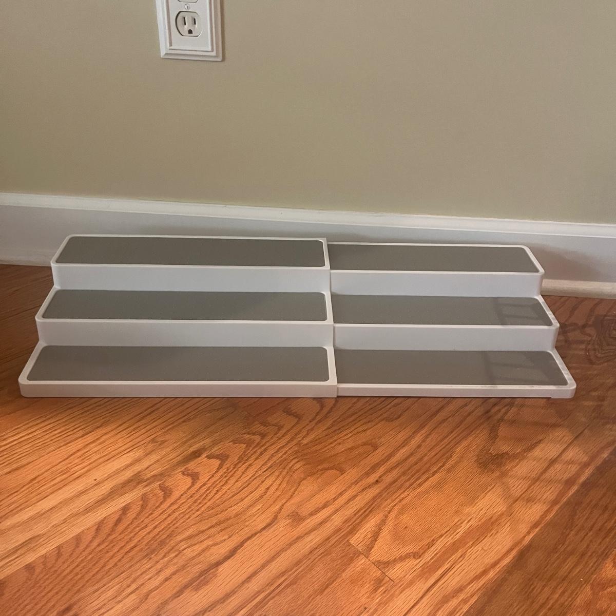 Lot includes ten plastic covered wire shelf organizers, two expandable metal cutlery holders, four metal baskets, three Rubbermaid drawer organizers, lazy Susan and expandable spice organizer. Expandable cutlery holders measure 11.5” x 16” x 3”H when not expanded and 18.5” x 16” x 2”H at maximum expansion.