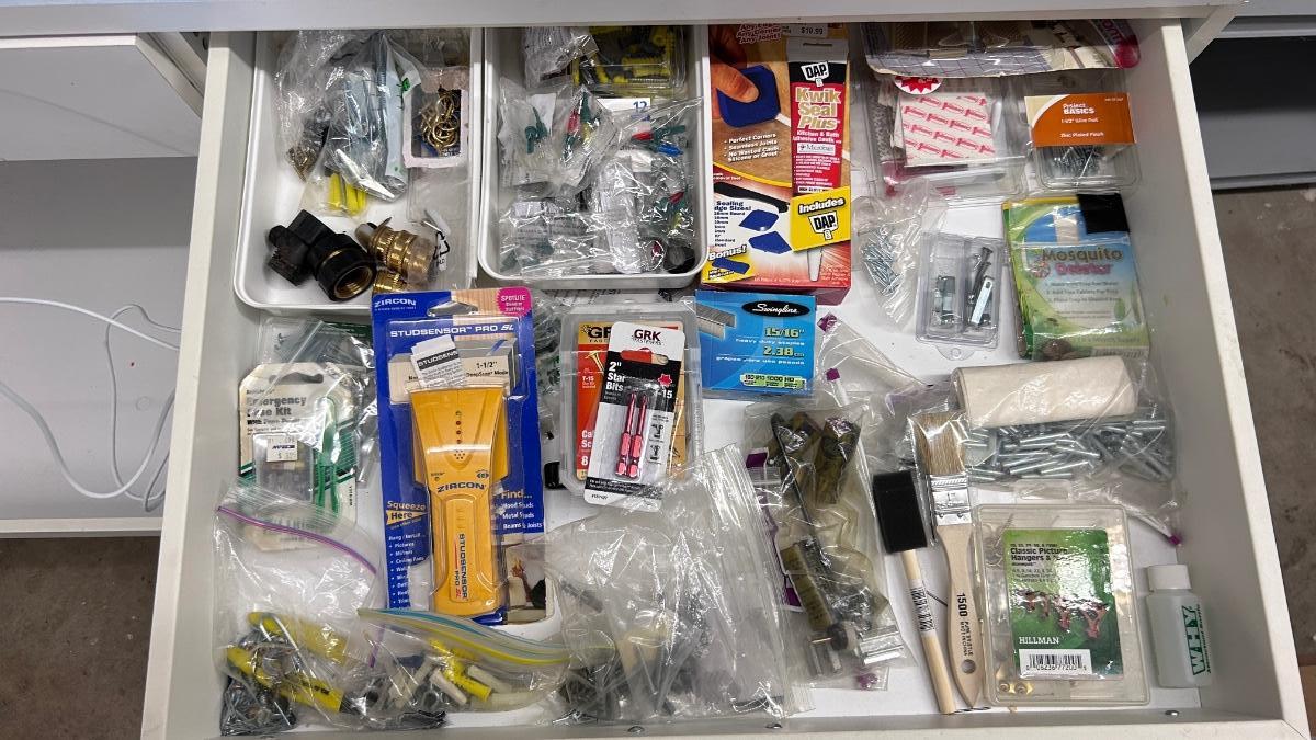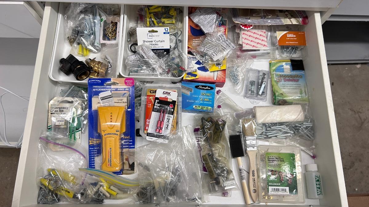 DRAWER PACKED WITH A VARIETY OF DIFFERENT HARDWARE