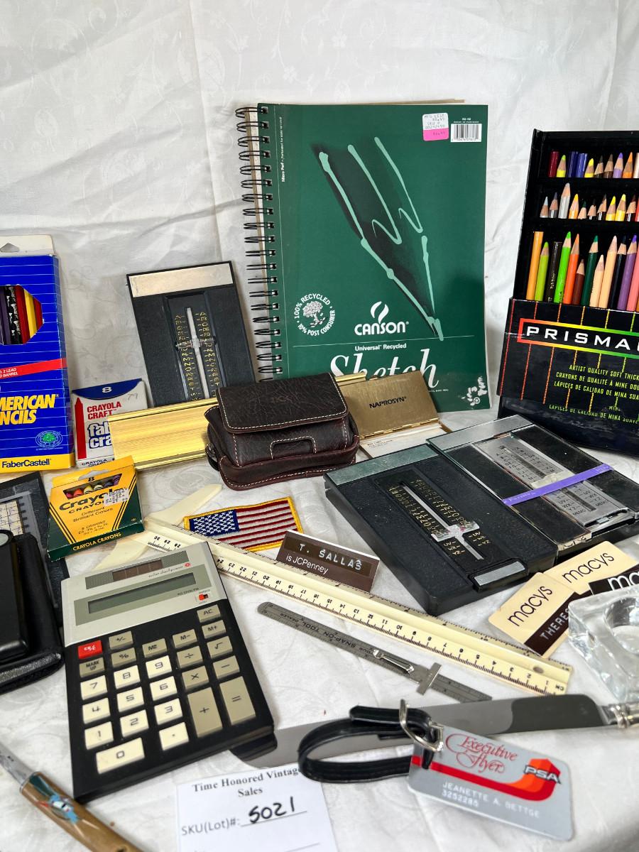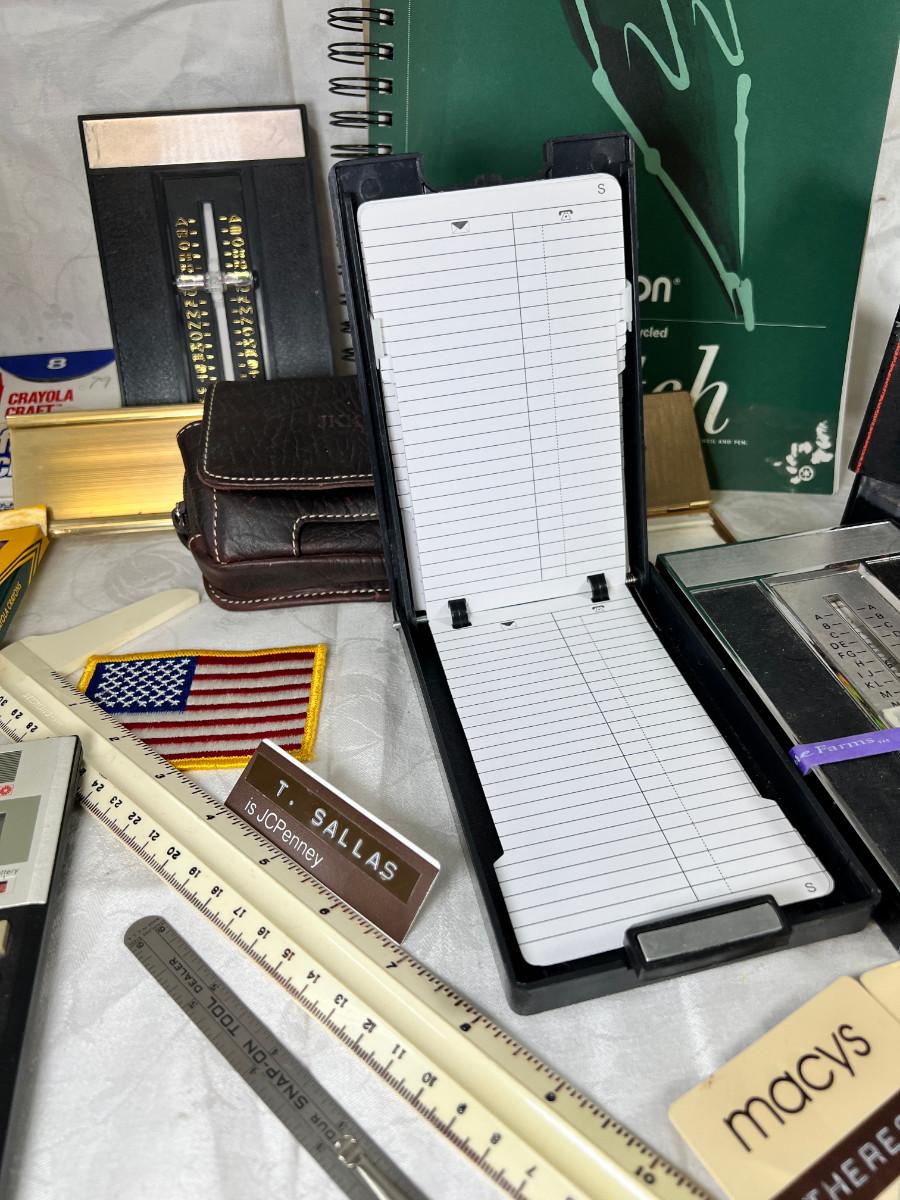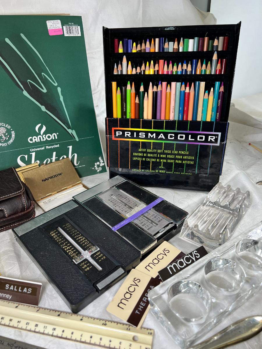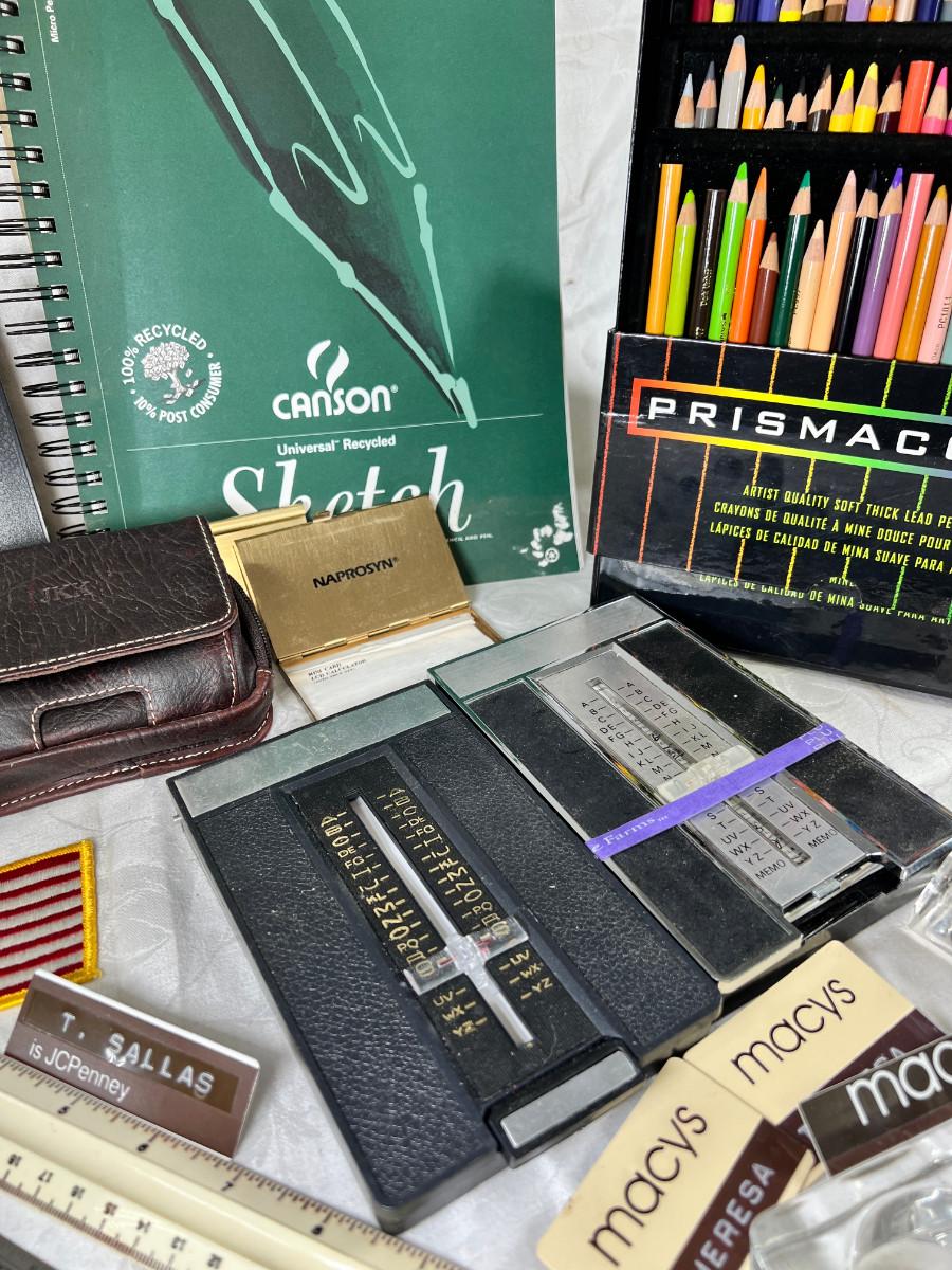 Prisma colors and sketch book, calculators, magnifying glass, Vintage drawing book, art supplies. Classic Roladexes, name tags office brass name plate holder.