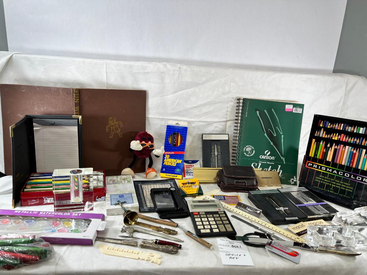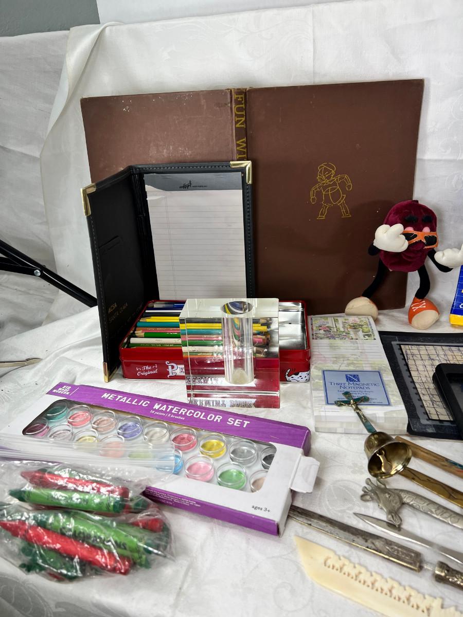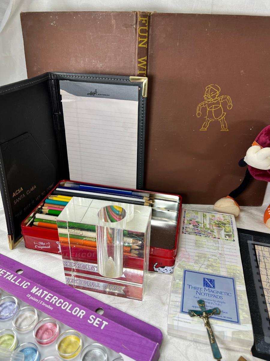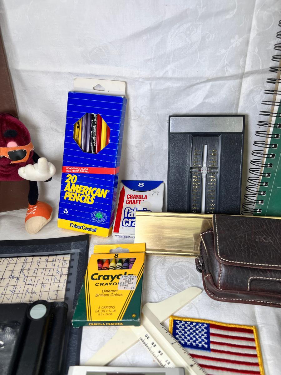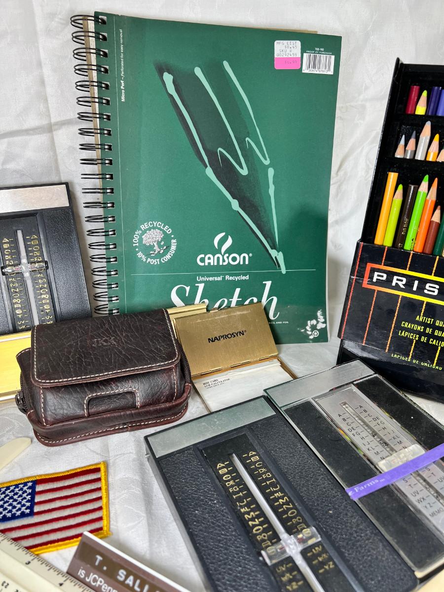 Prisma colors and sketch book, calculators, magnifying glass, Vintage drawing book, art supplies. Classic Roladexes, name tags office brass name plate holder.