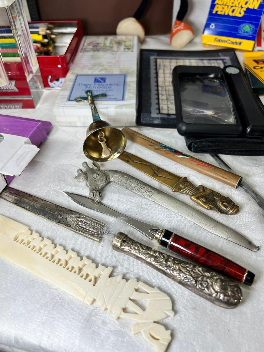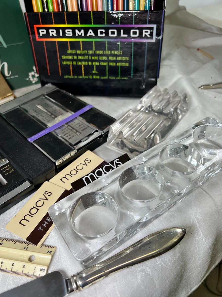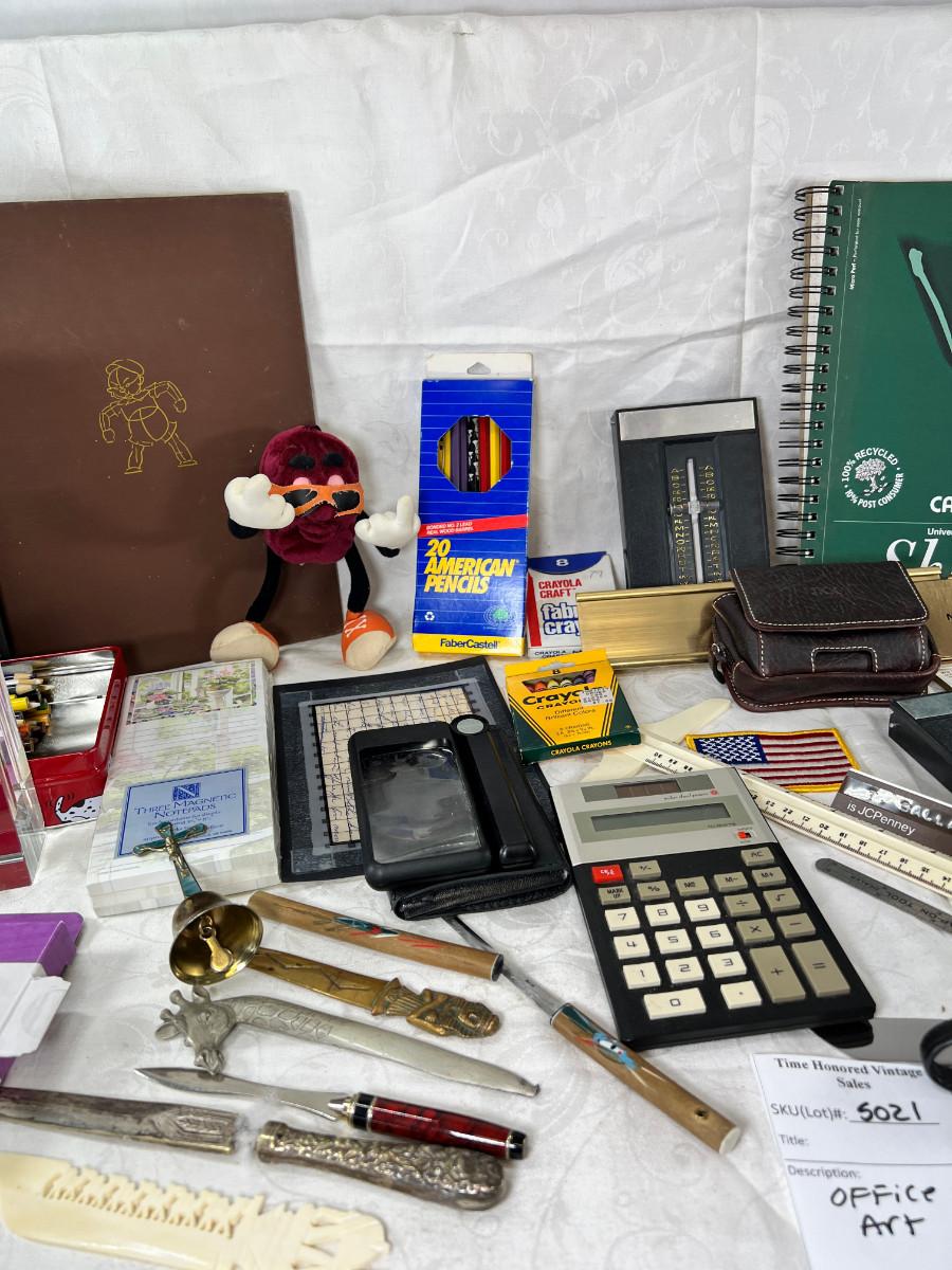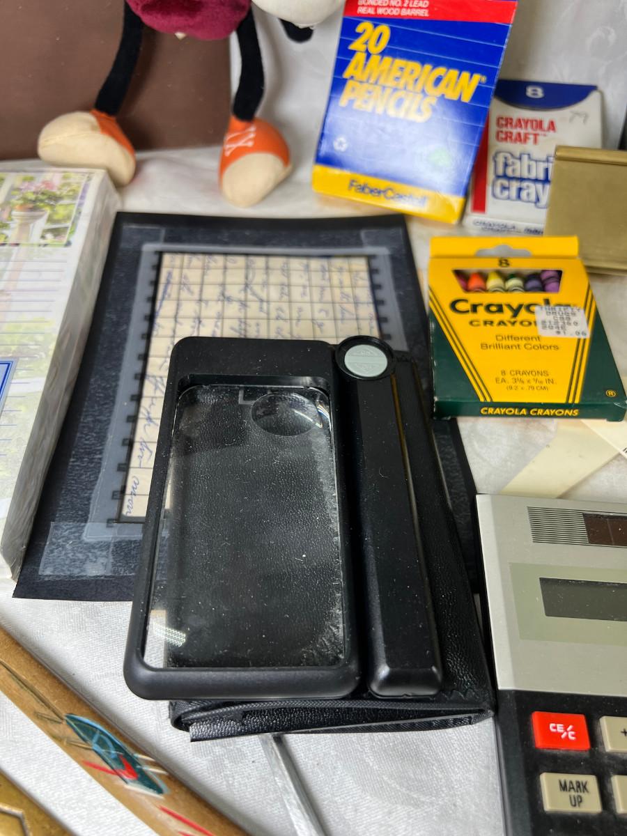 Prisma colors and sketch book, calculators, magnifying glass, Vintage drawing book, art supplies. Classic Roladexes, name tags office brass name plate holder.