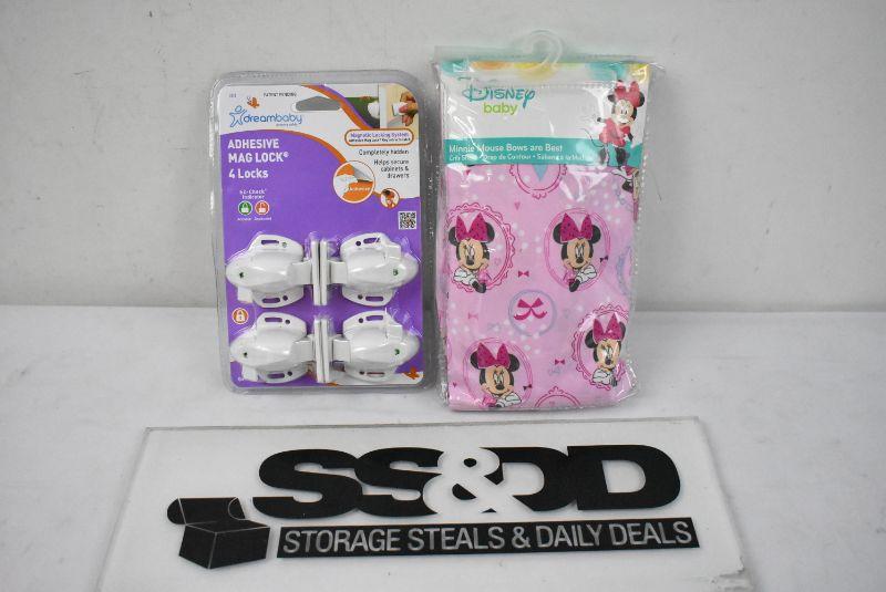 Dreambaby Adhesive Mag Lock, 4 Locks & Disney Minnie "Bows are Best" Crib Sheet