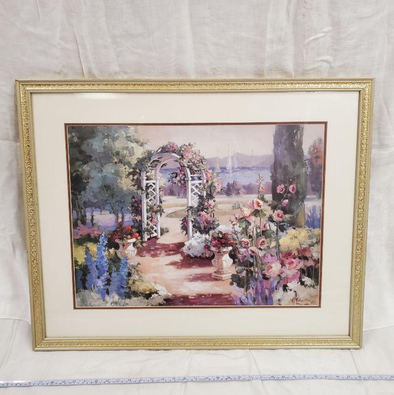 This print is gorgeous, dreamy garden overlooking sailboats...frame is also beautiful!