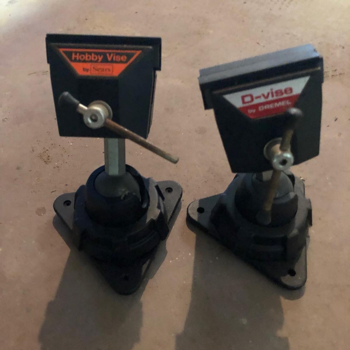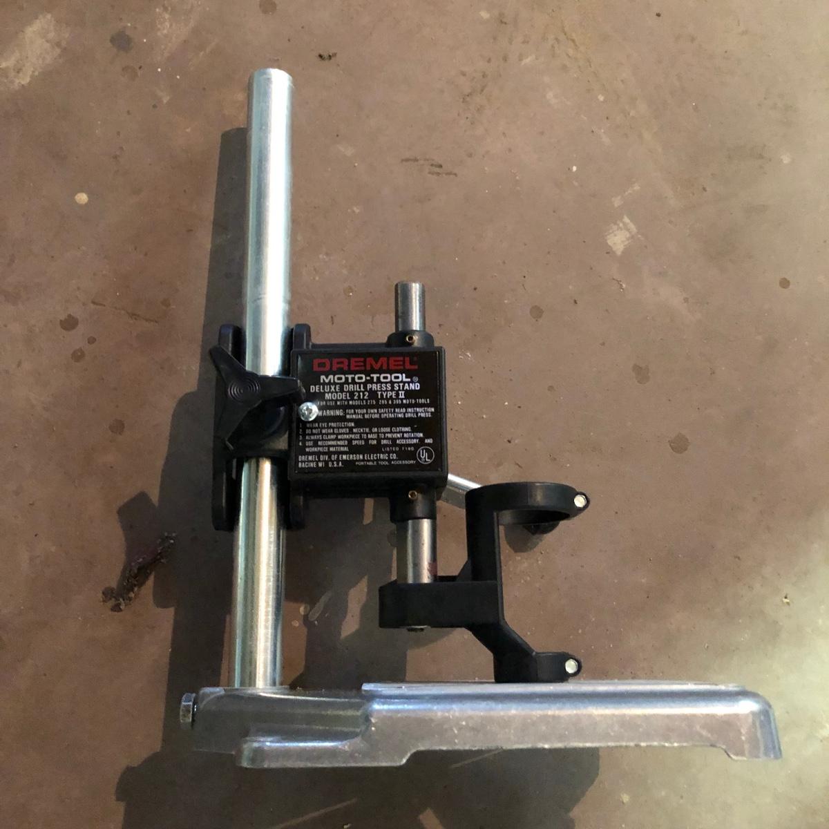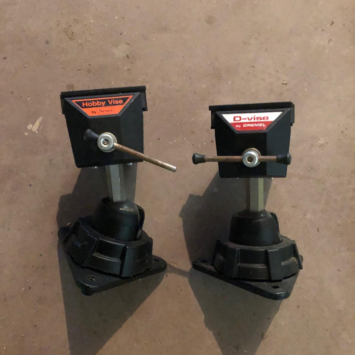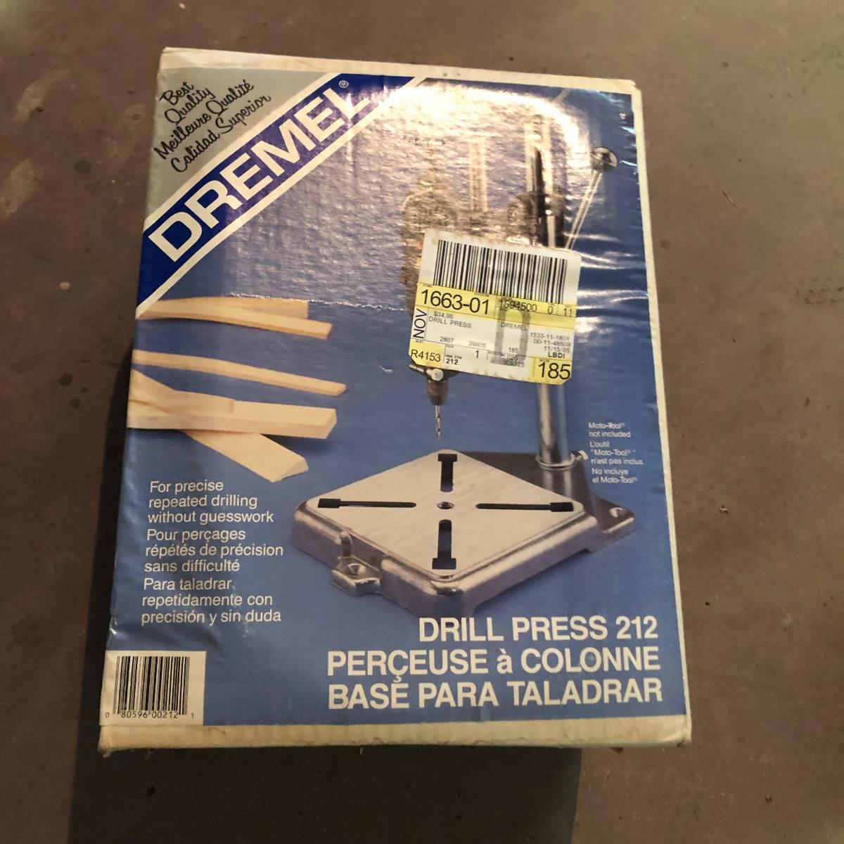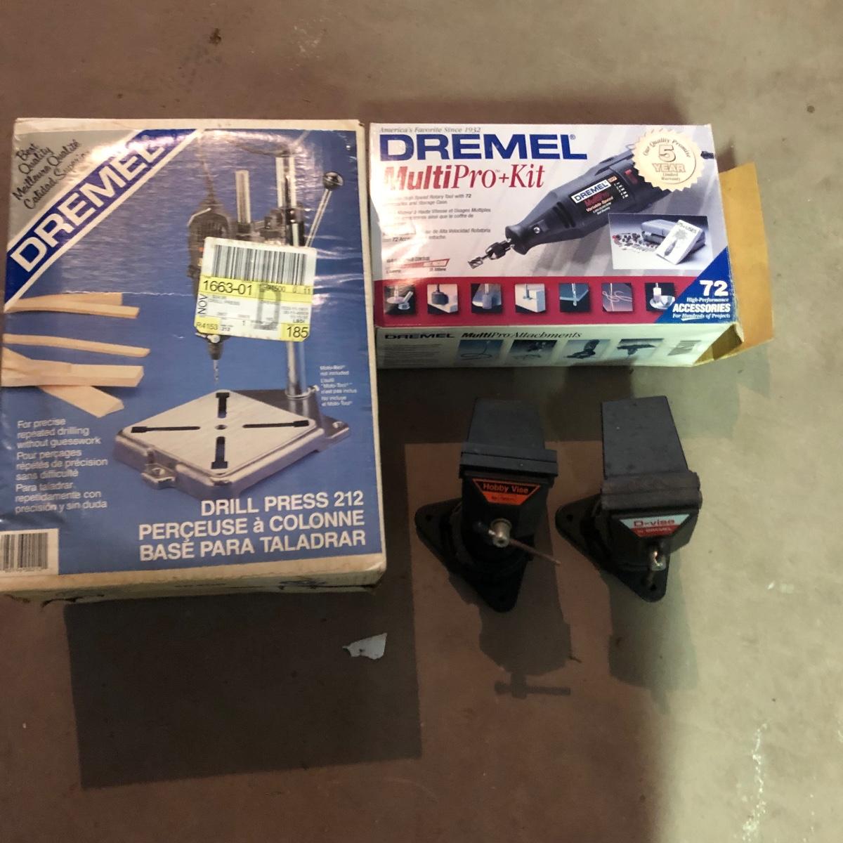 Lot includes Dremel MultiPro in plastic box, Dremel model# 212 drill press, a Dremel D-Vise, and a Sears Hobby vise. Dremel worked when tested.