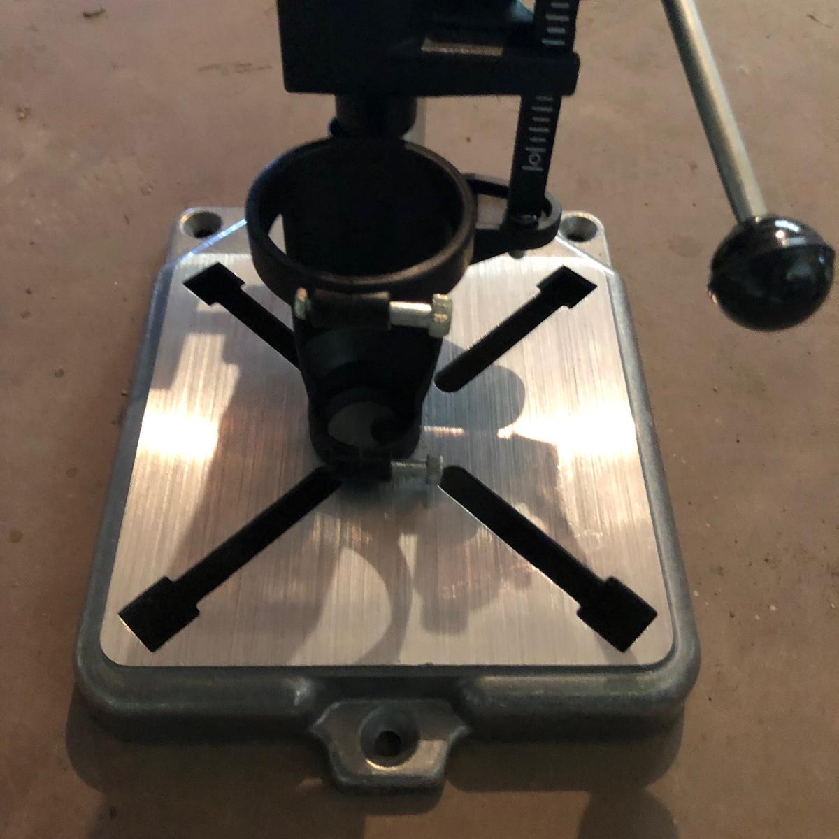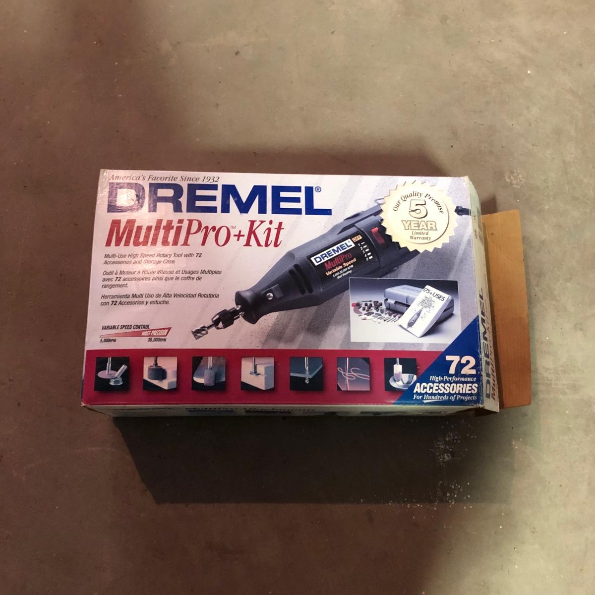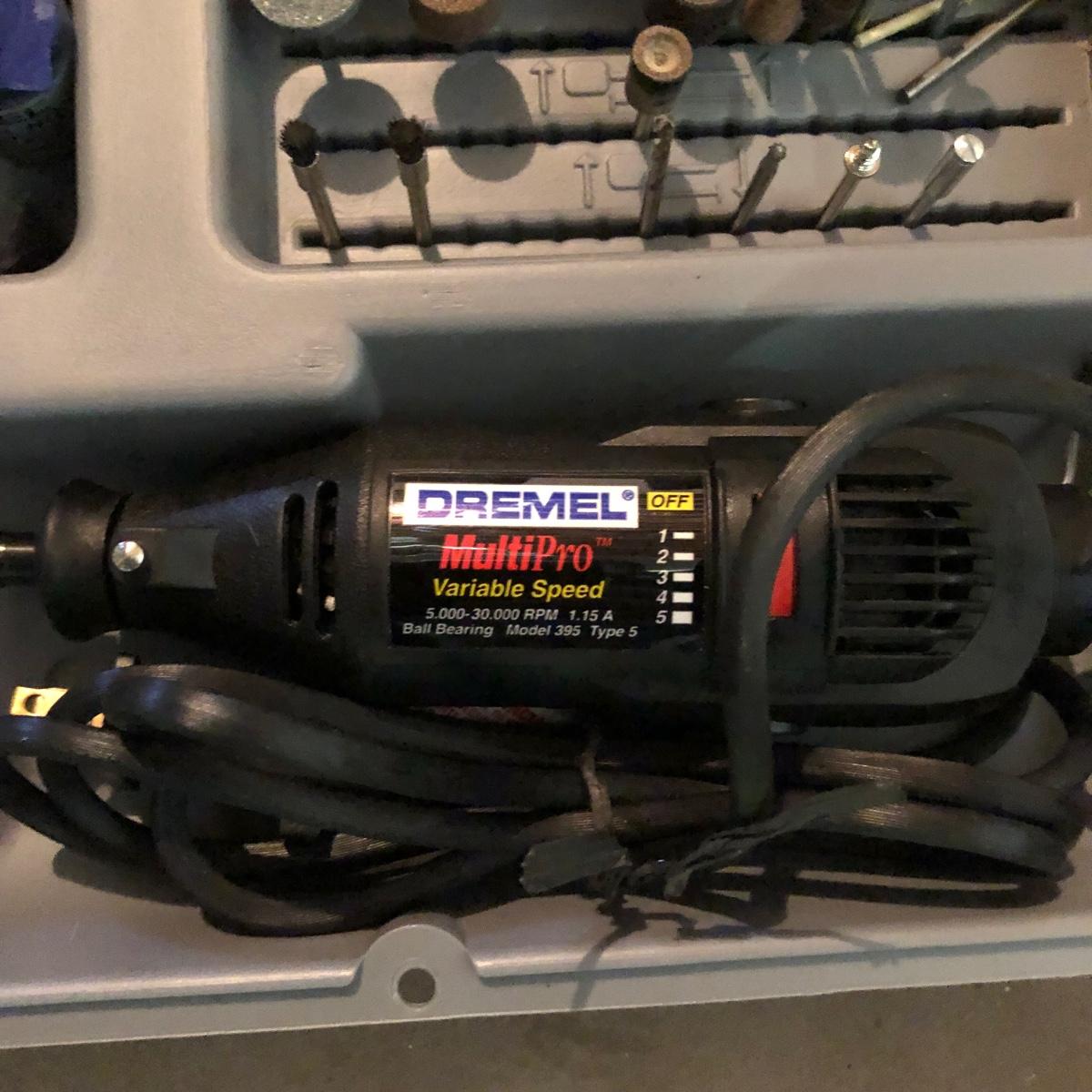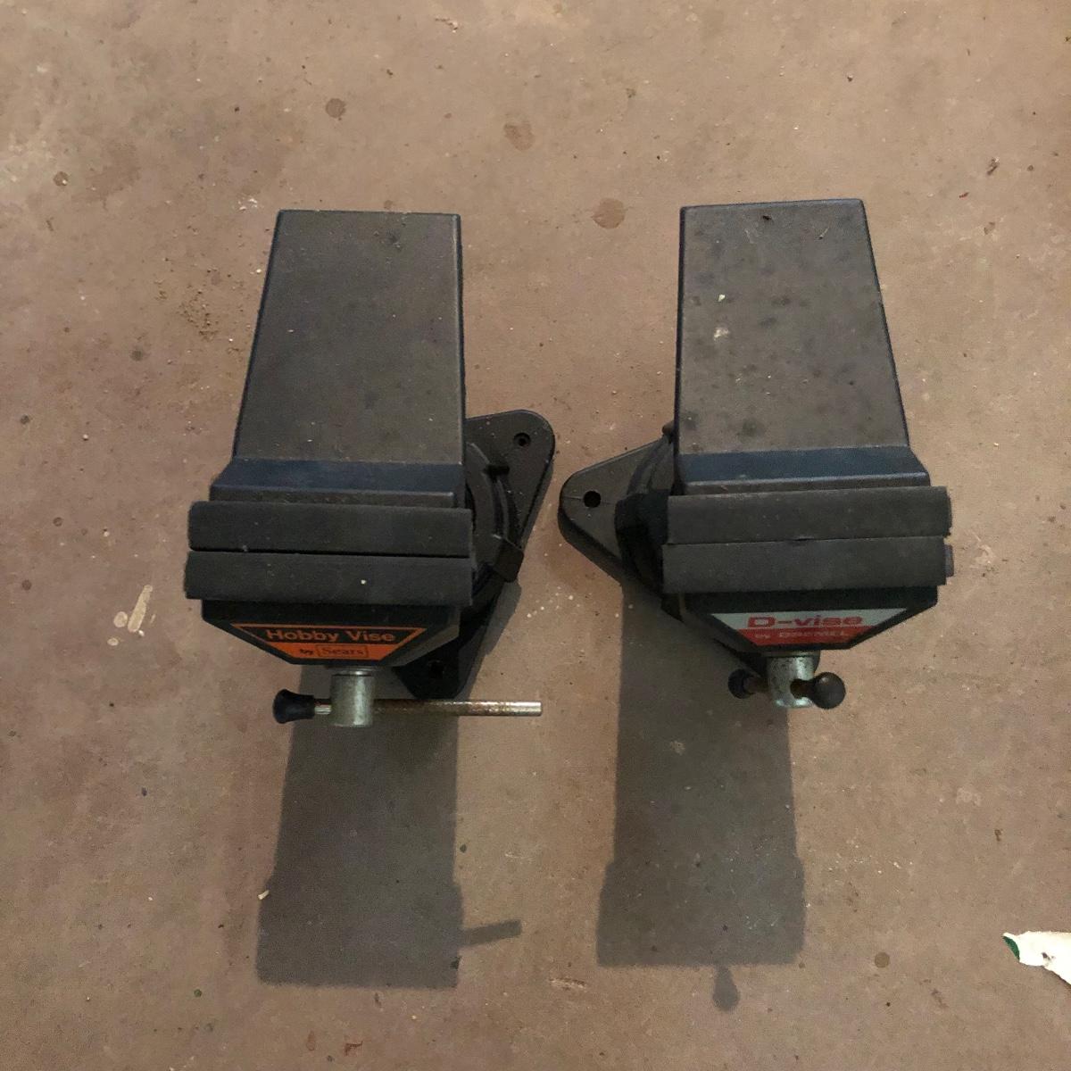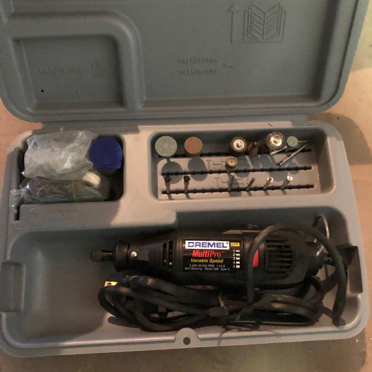 Lot includes Dremel MultiPro in plastic box, Dremel model# 212 drill press, a Dremel D-Vise, and a Sears Hobby vise. Dremel worked when tested.