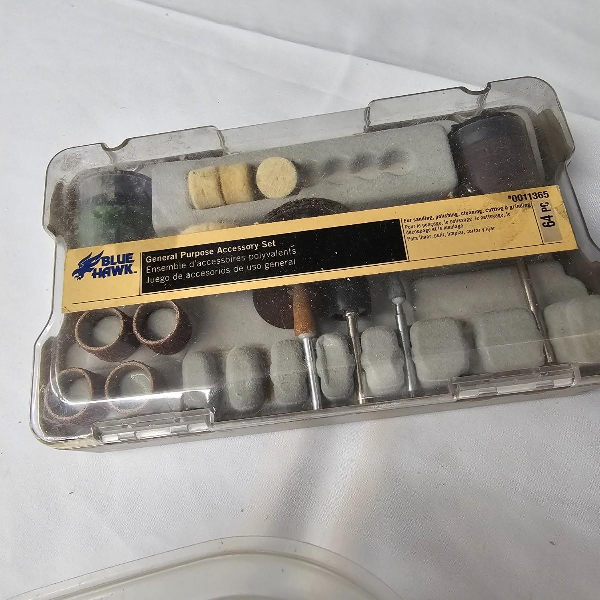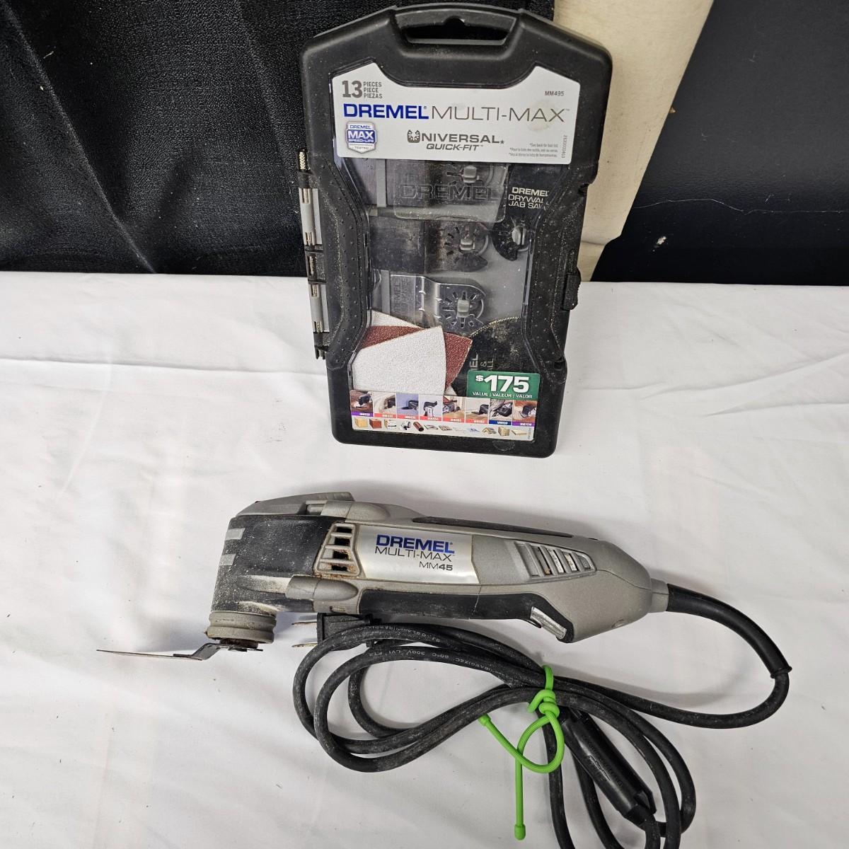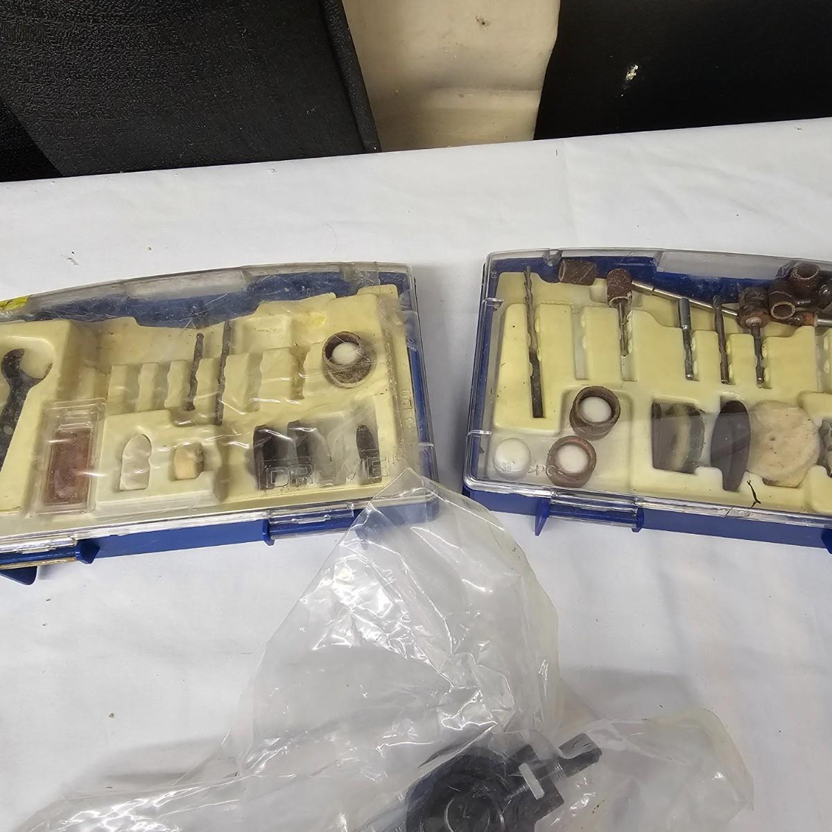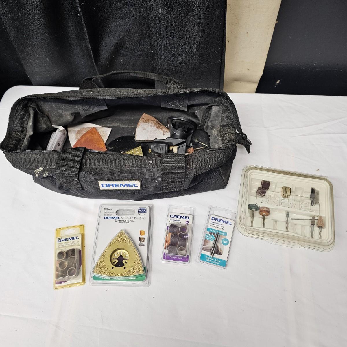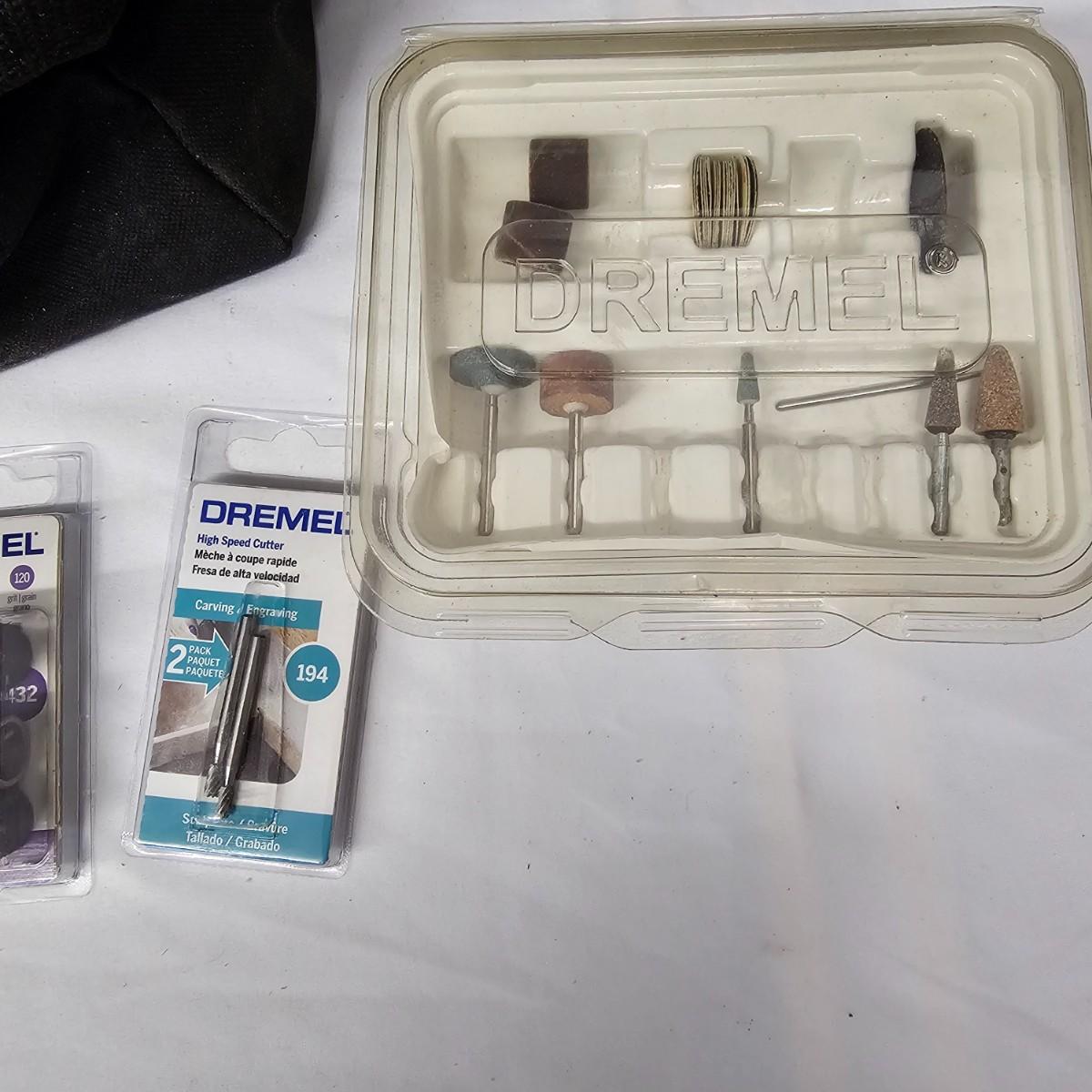 Dremel tools and bits, sanders, cutting wheels and more. One Dremel Multi-Max oscillating cutter with extra blades. One standard Dremel hand tool and accessories along with carry bag. A Black & Decker rotary tool and a Roto-Zip. Several boxes of assorted discs, drums and cutters. Instruction manuals as well. All items powered on when plugged in. See photos for details. Shipping available.