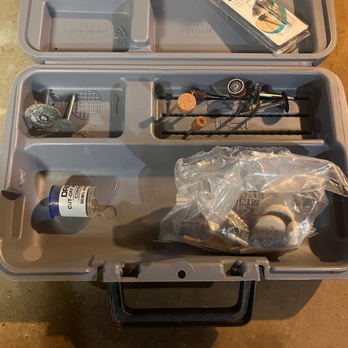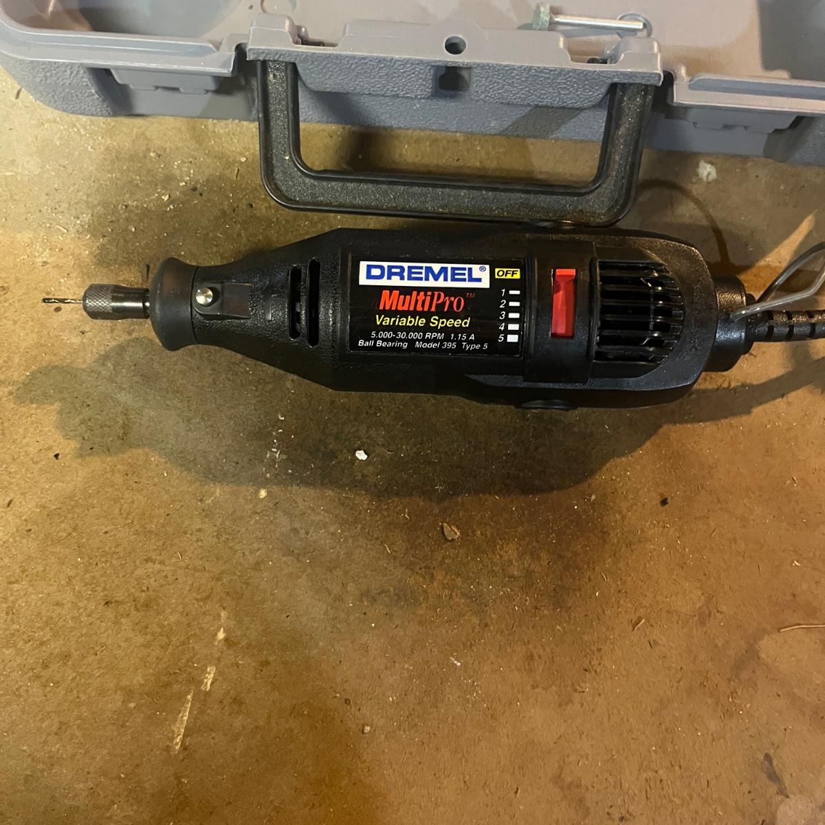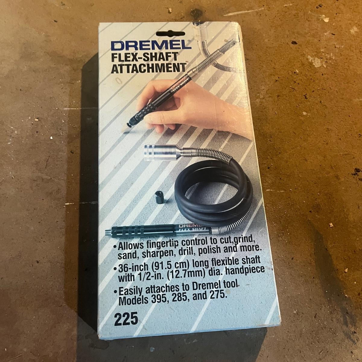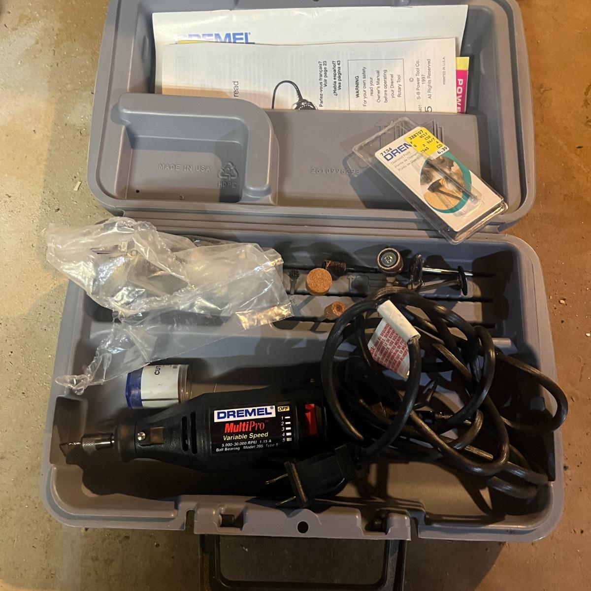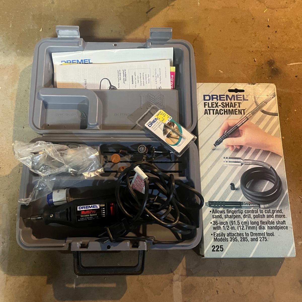 Lot includes a Dremel MultiPro tool (Model 395) with plastic carrying case and accessories. Also includes a NIB Dremel Flex-Shaft attachment. Case measures 11” x 3.5” x 8”H. Dremel powered on when plugged in.