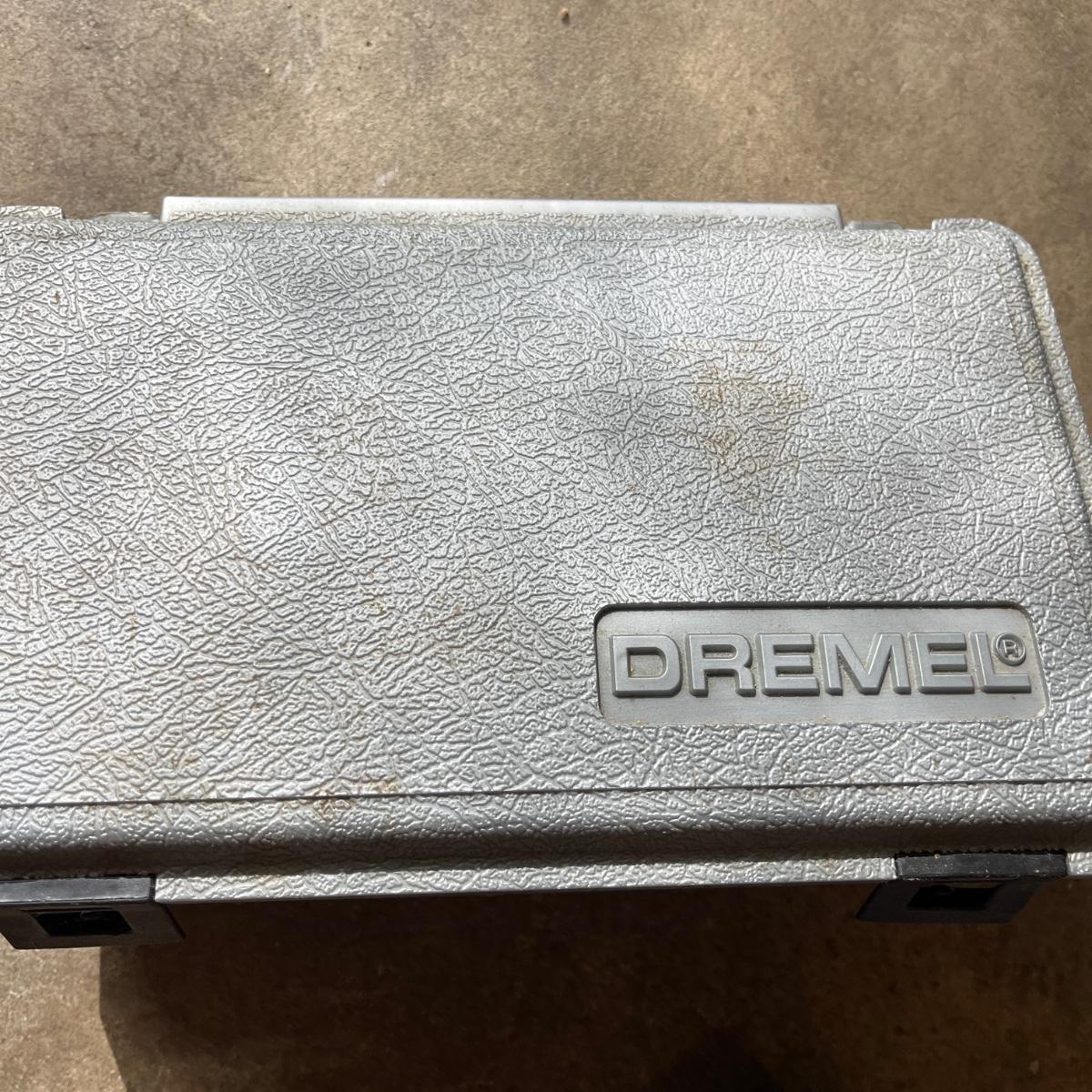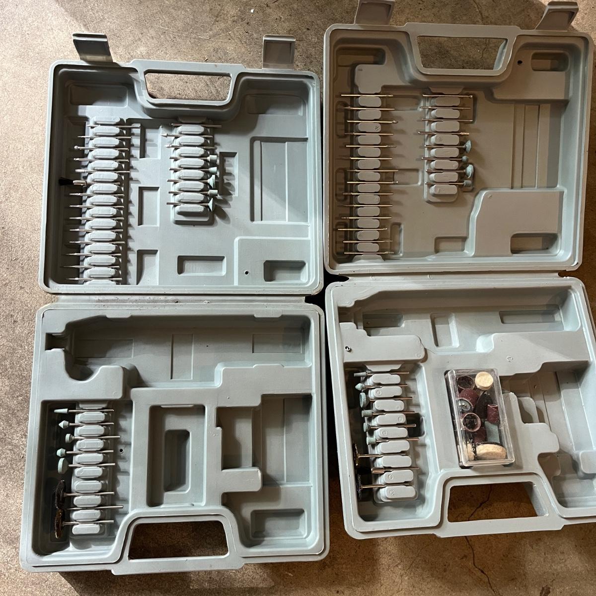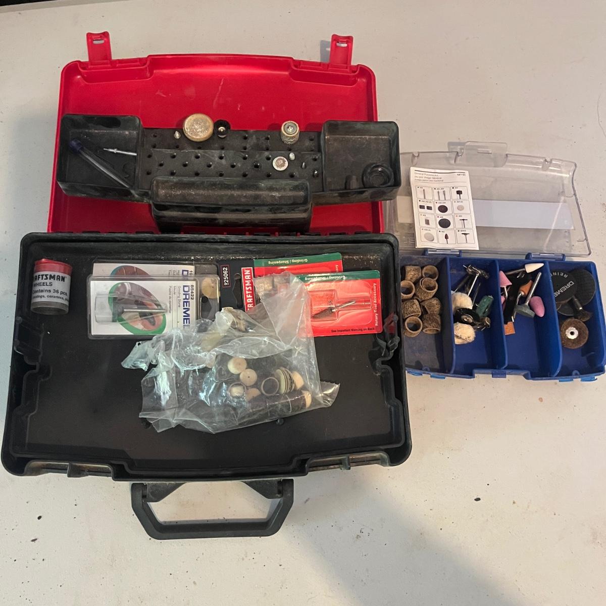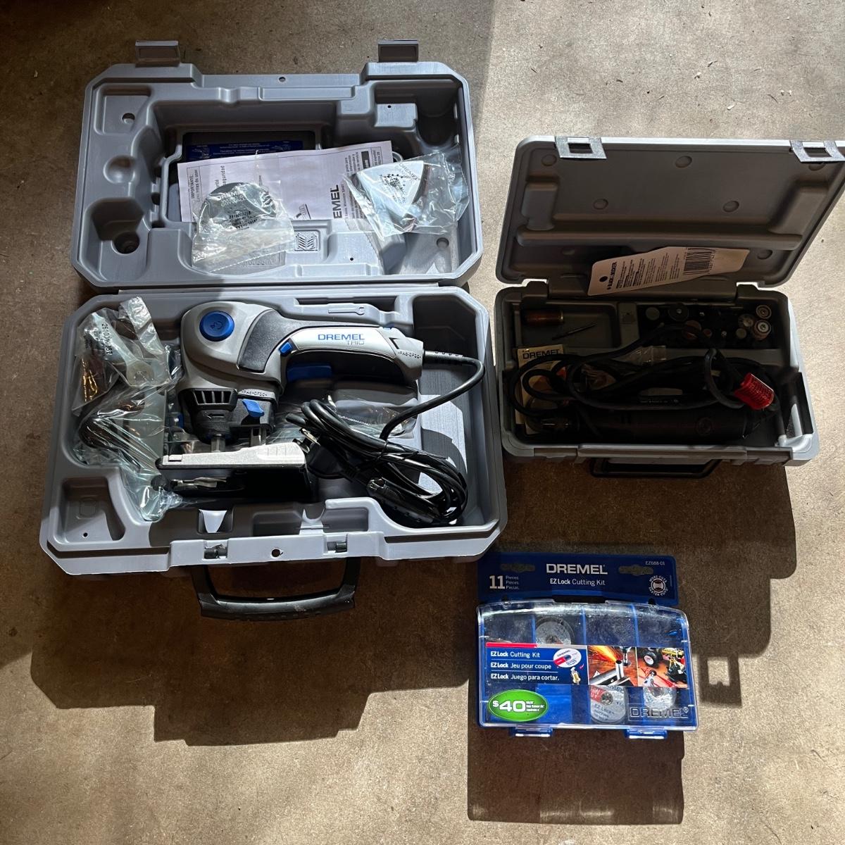 Lot includes a Dremel Trio in plastic carrying case, Dremel variable speed tool in plastic carrying case and assorted accessories in plastic cases. Largest case measures 15” x 5” x 11”H. Both Dremel powered on when plugged in.
