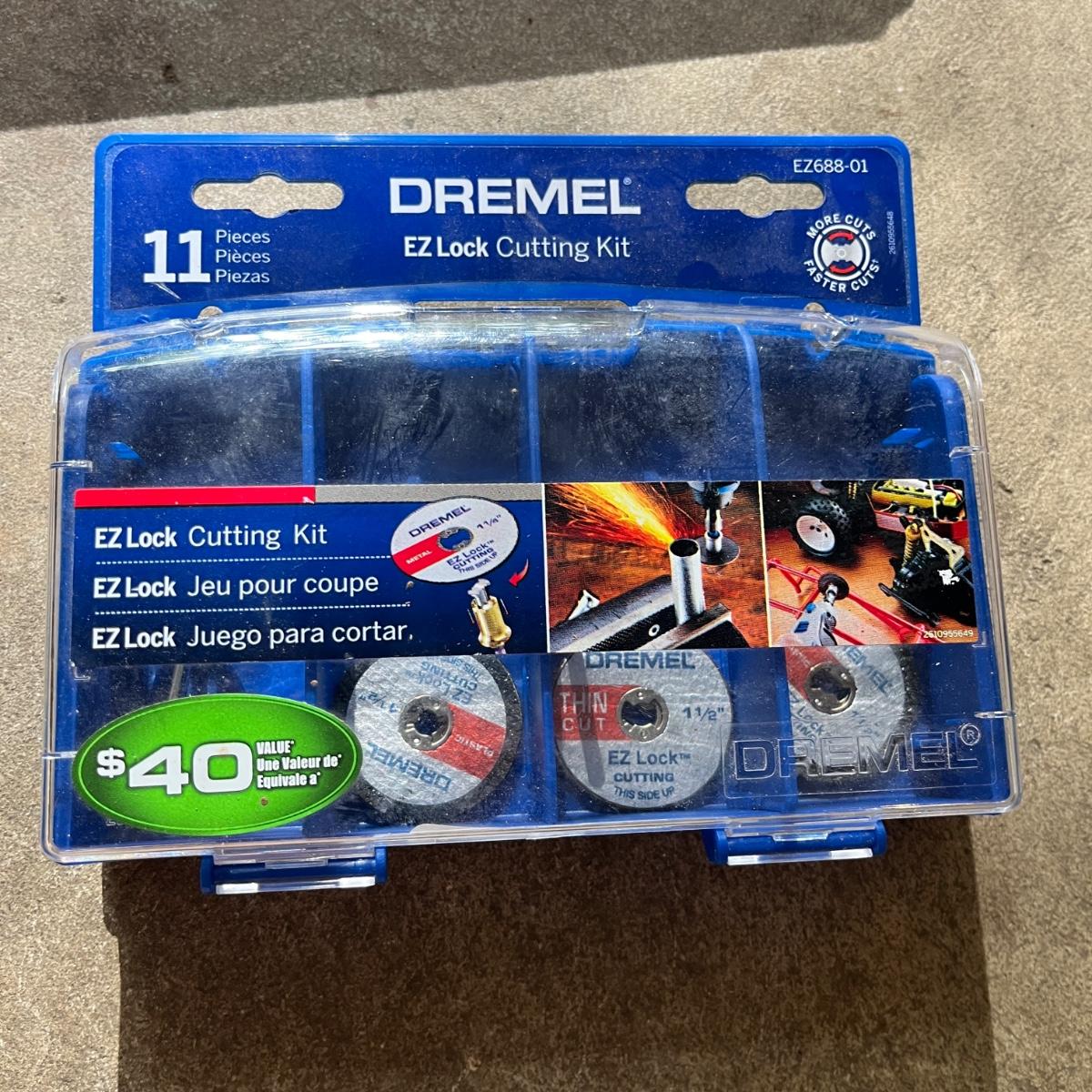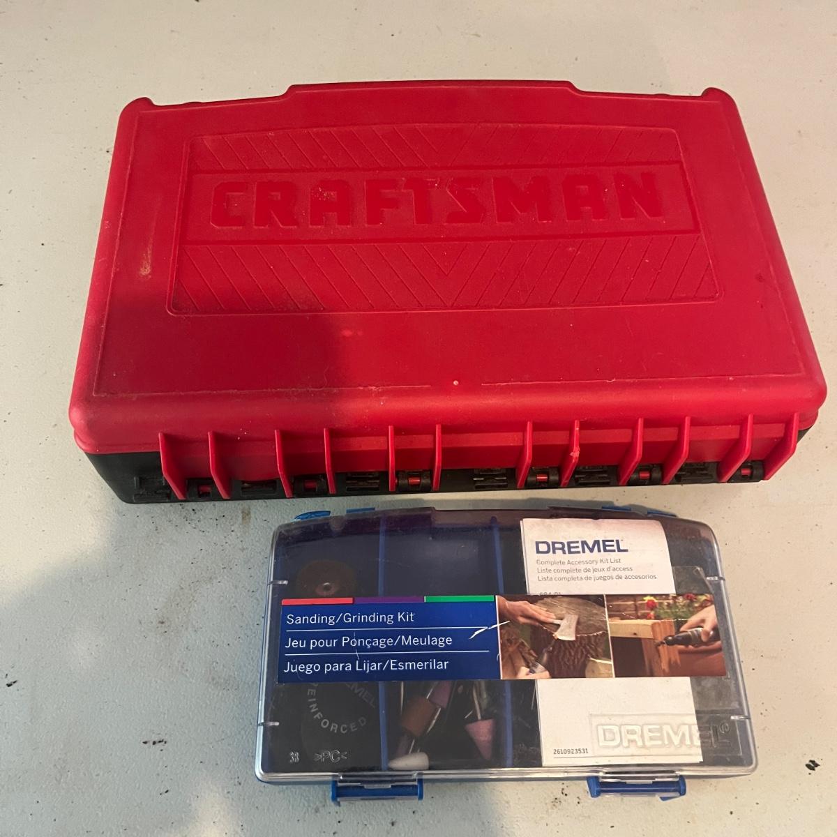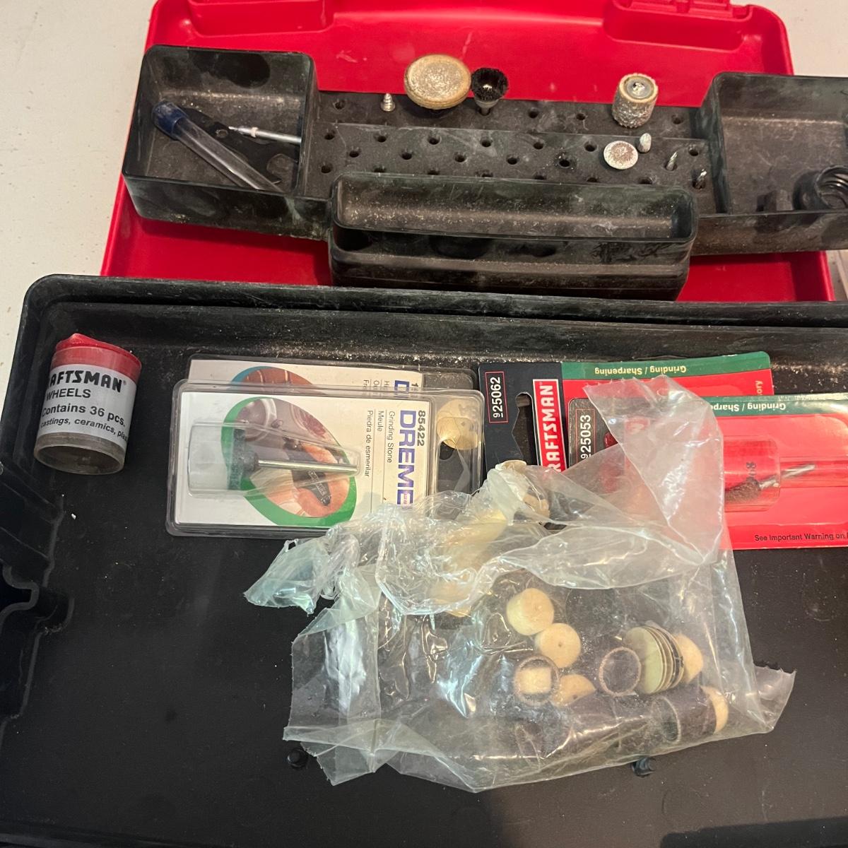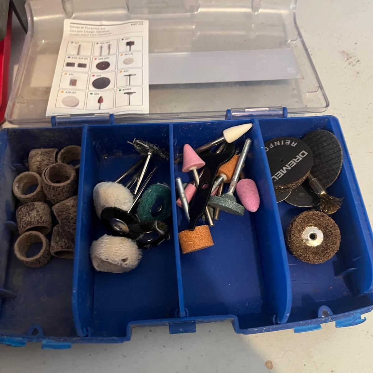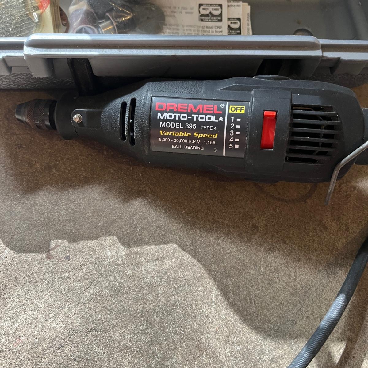 Lot includes a Dremel Trio in plastic carrying case, Dremel variable speed tool in plastic carrying case and assorted accessories in plastic cases. Largest case measures 15” x 5” x 11”H. Both Dremel powered on when plugged in.