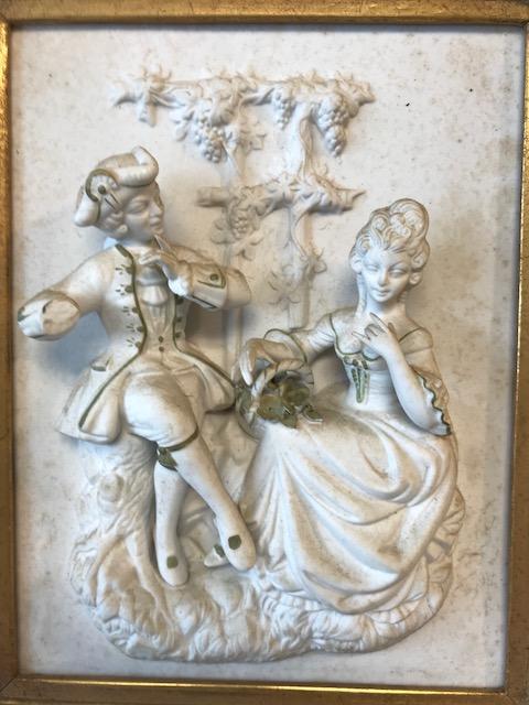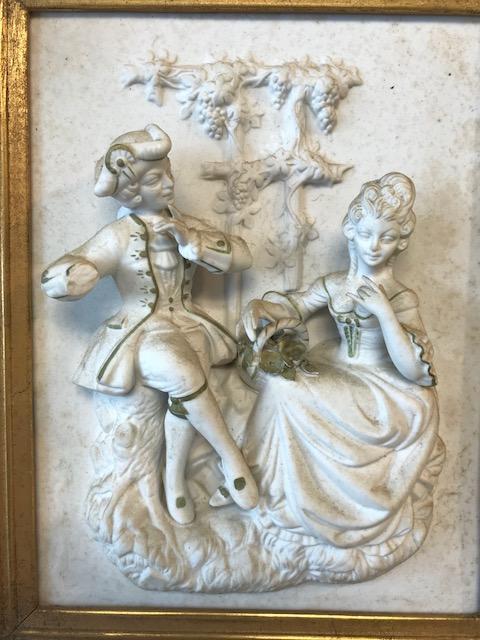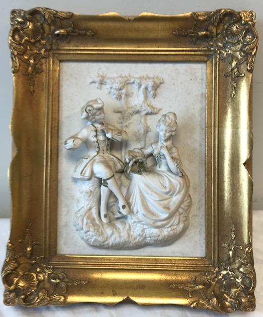 Description: Alt Meissen-Dresden Art Scene. Castle Sanssouci 1750-60 wall Plaque in a gilt frame. Male hand in the plaque is missing. Measurement approximate: 13 H X 11 W. Material: Porcelain. Shipping Charges:Free. Condition: Good.
