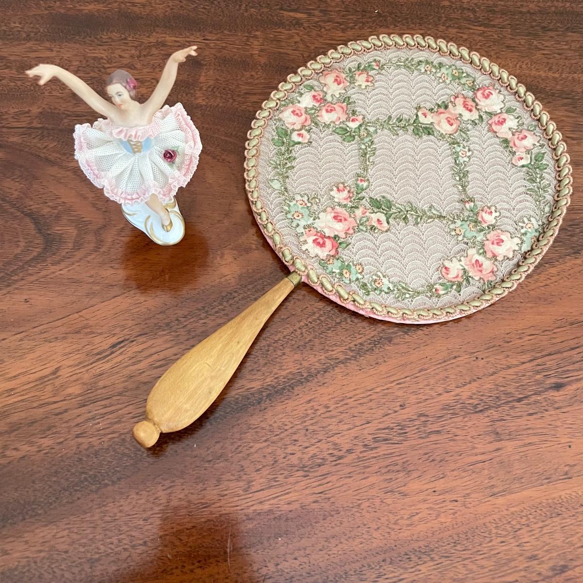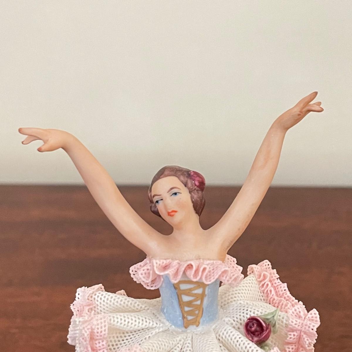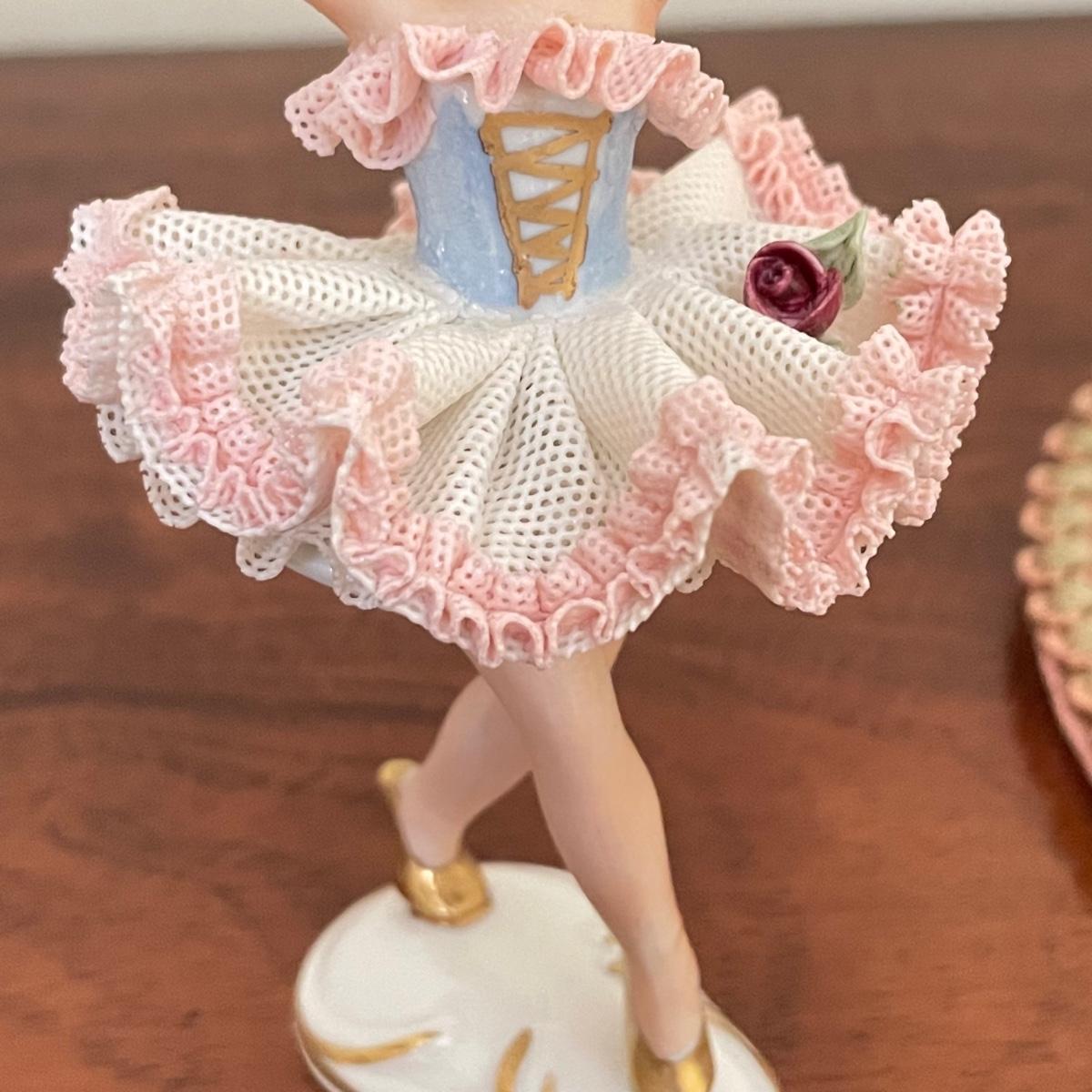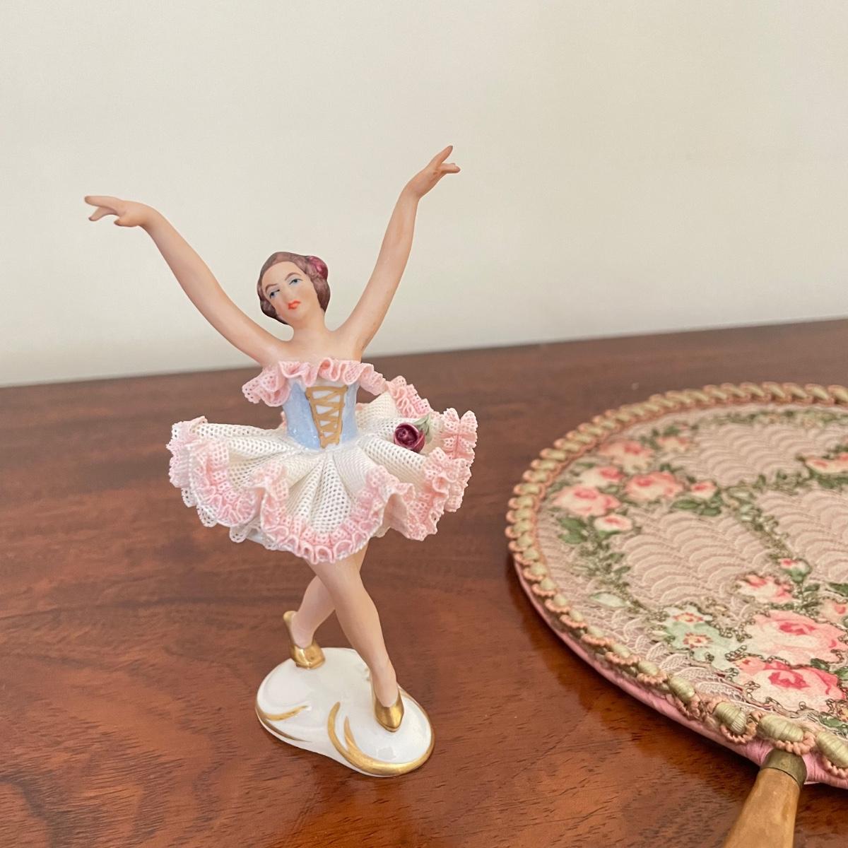 Dresden porcelain lace ballerina with a vintage lace fan. The fan has a wooden handle, cloth roses and ribbon trim. The Dresden porcelain lace ballerina is missing a finger, but is in otherwise amazing condition. See images. Shipping available.