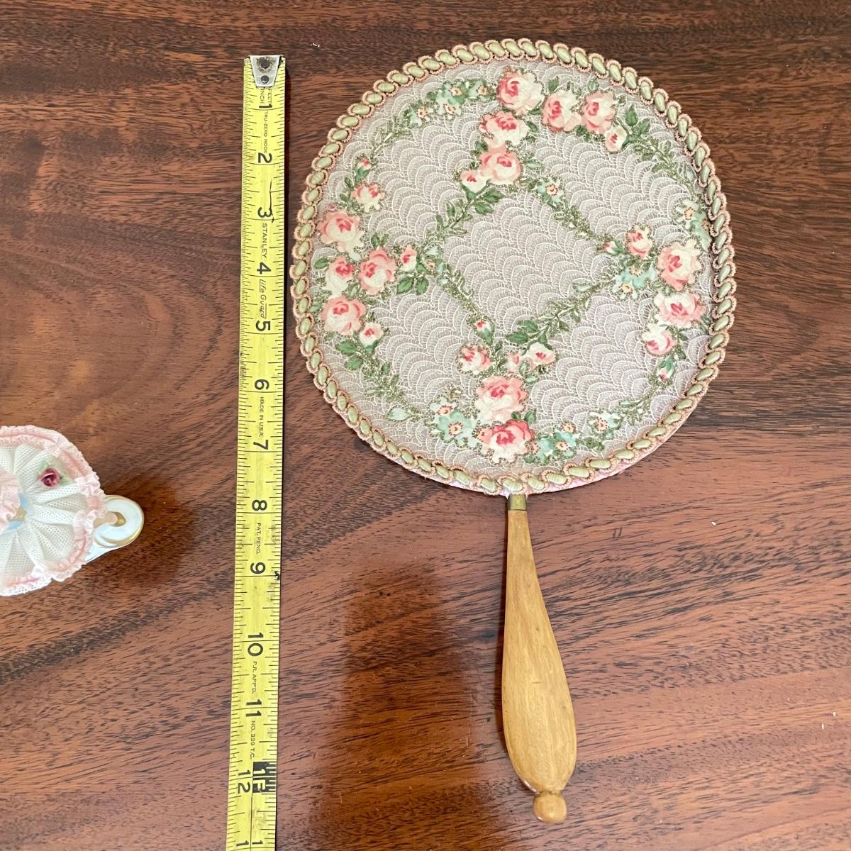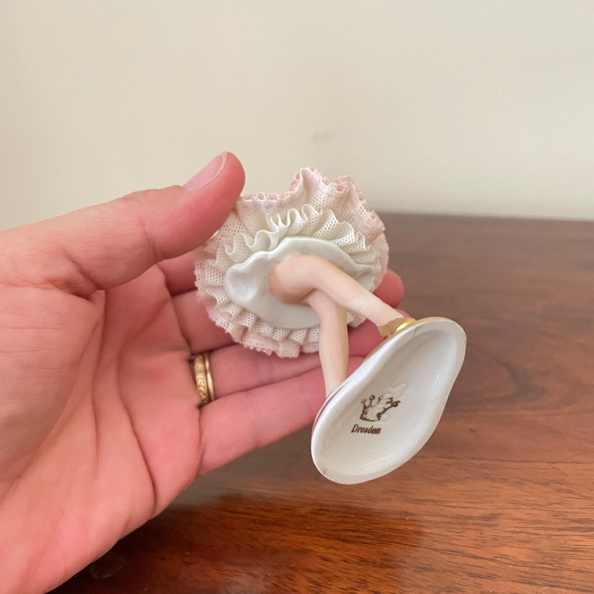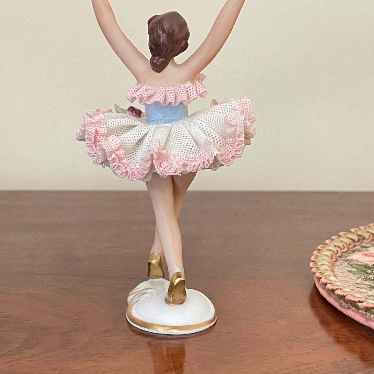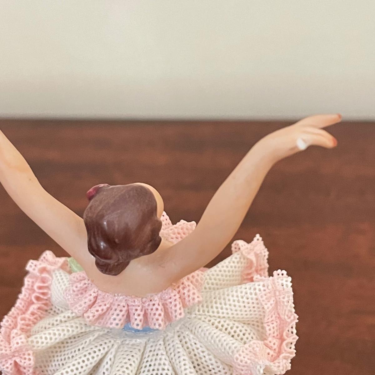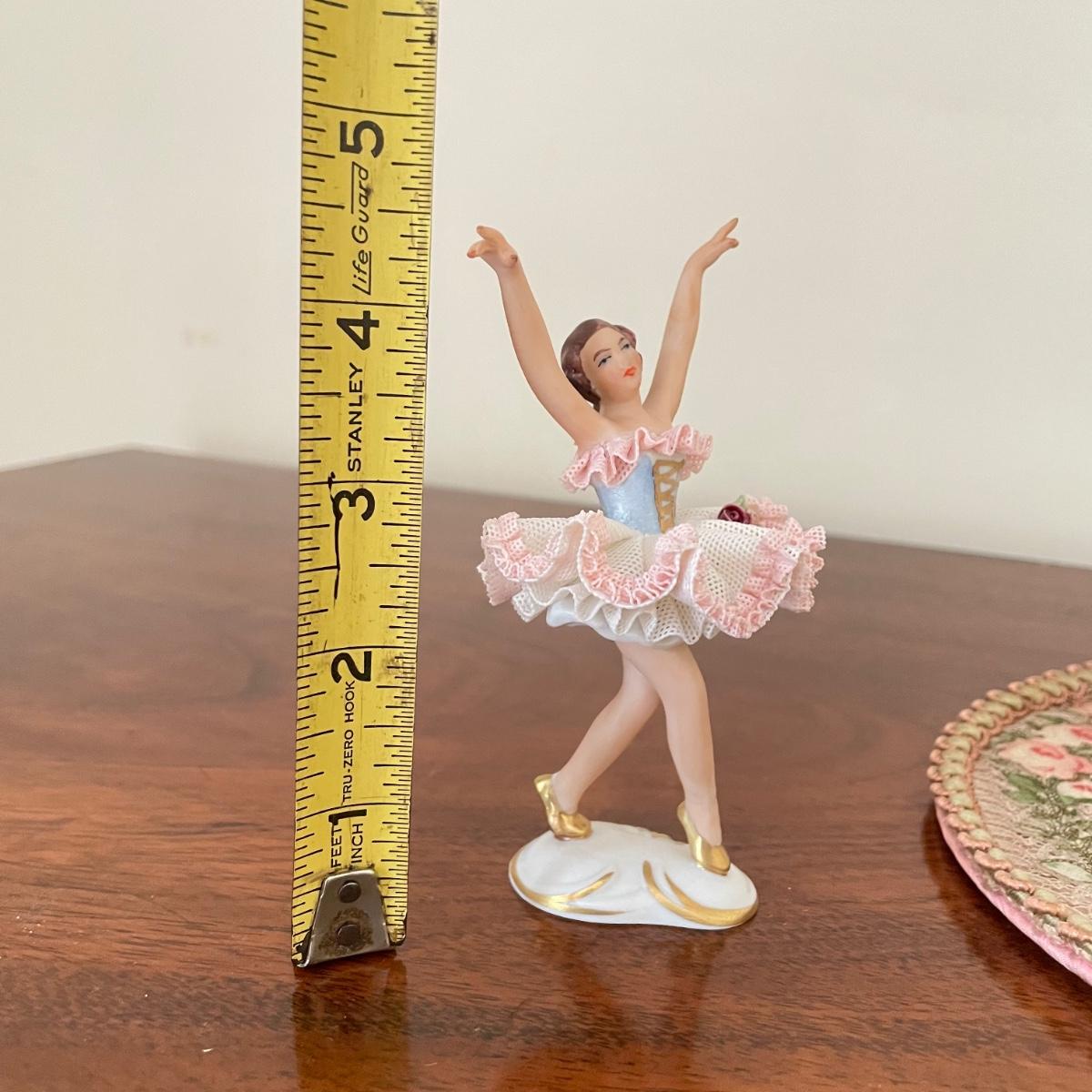 Dresden porcelain lace ballerina with a vintage lace fan. The fan has a wooden handle, cloth roses and ribbon trim. The Dresden porcelain lace ballerina is missing a finger, but is in otherwise amazing condition. See images. Shipping available.