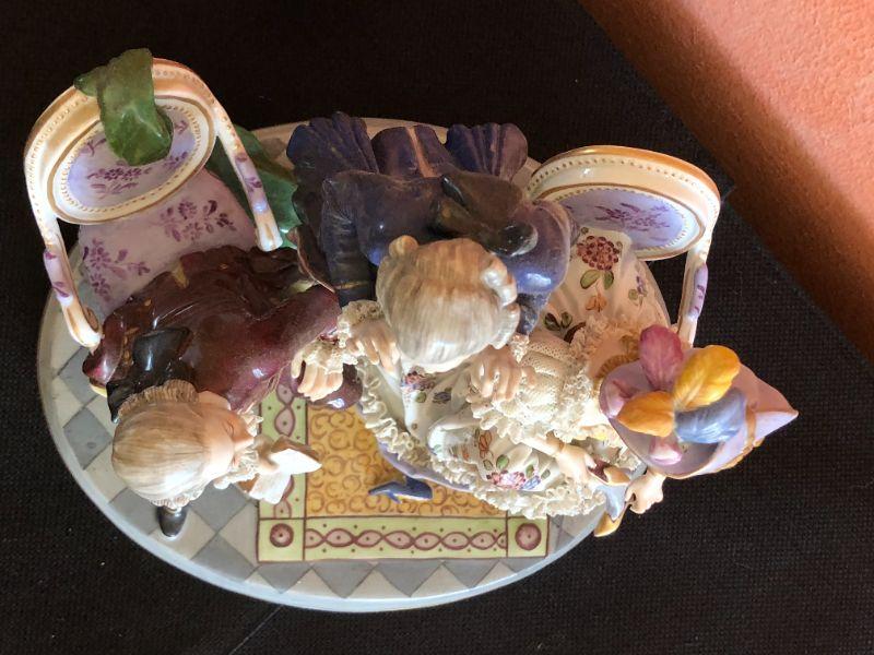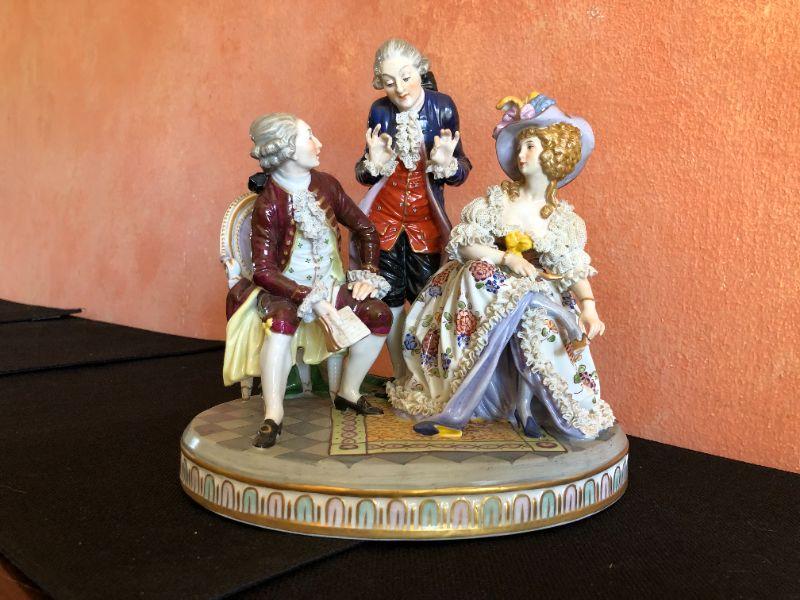 Beautiful Dresden porcelain conversational trip of two gentlemen and a lady, spreading some court gossip in the 19th century. In excellent condition, with exquisite details. From a San Francisco Presidio Heights family estate.